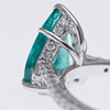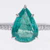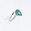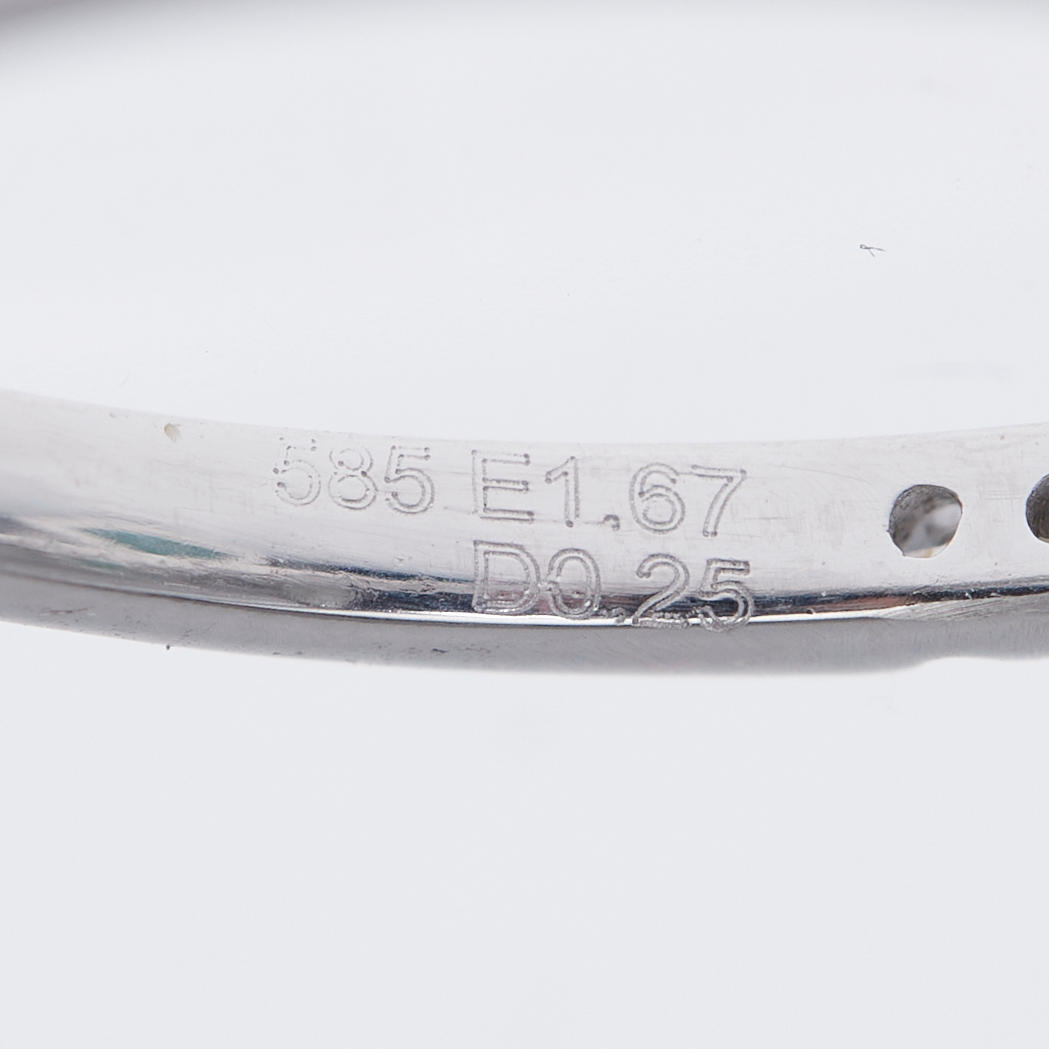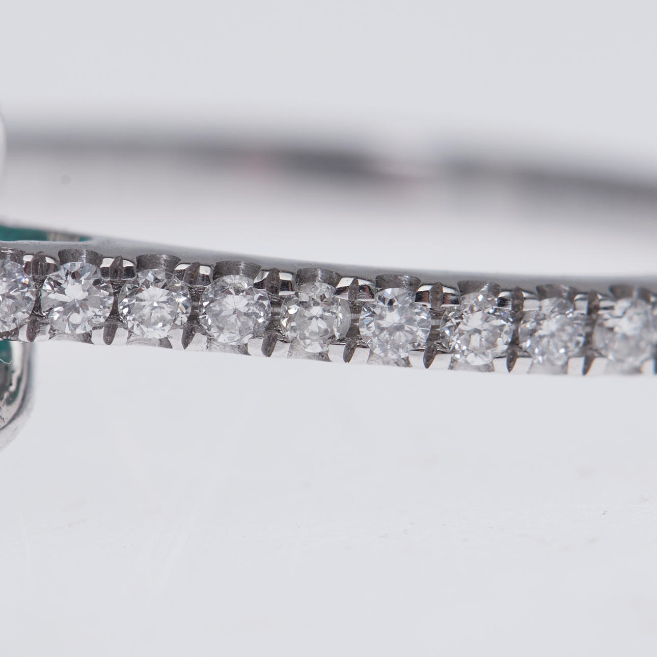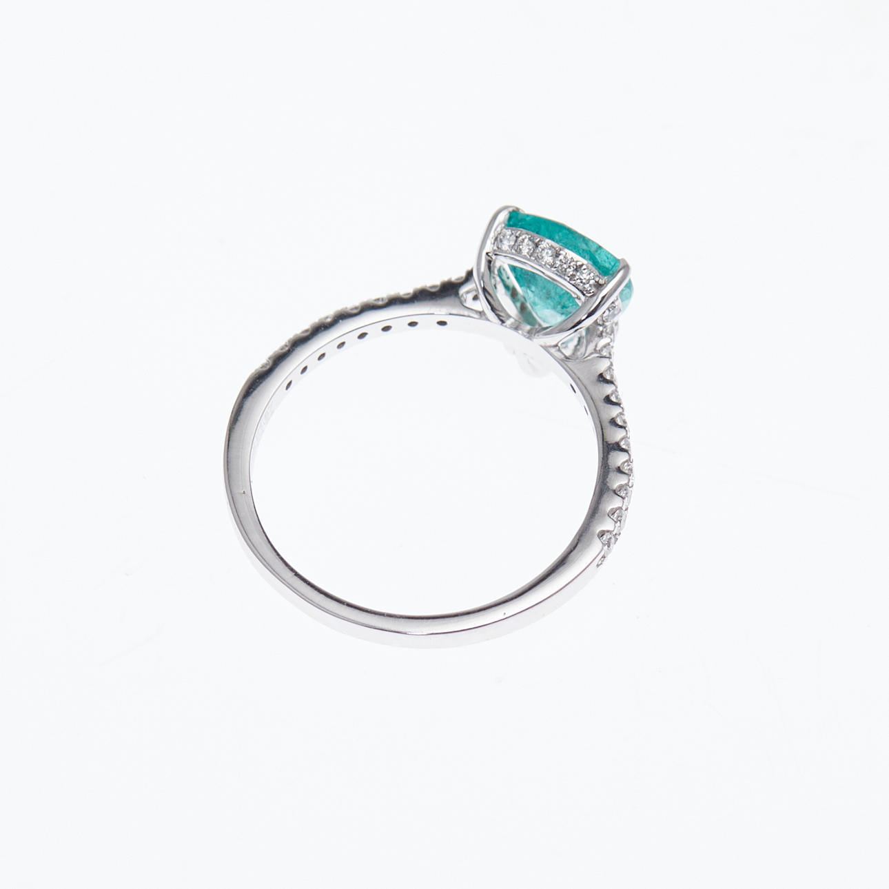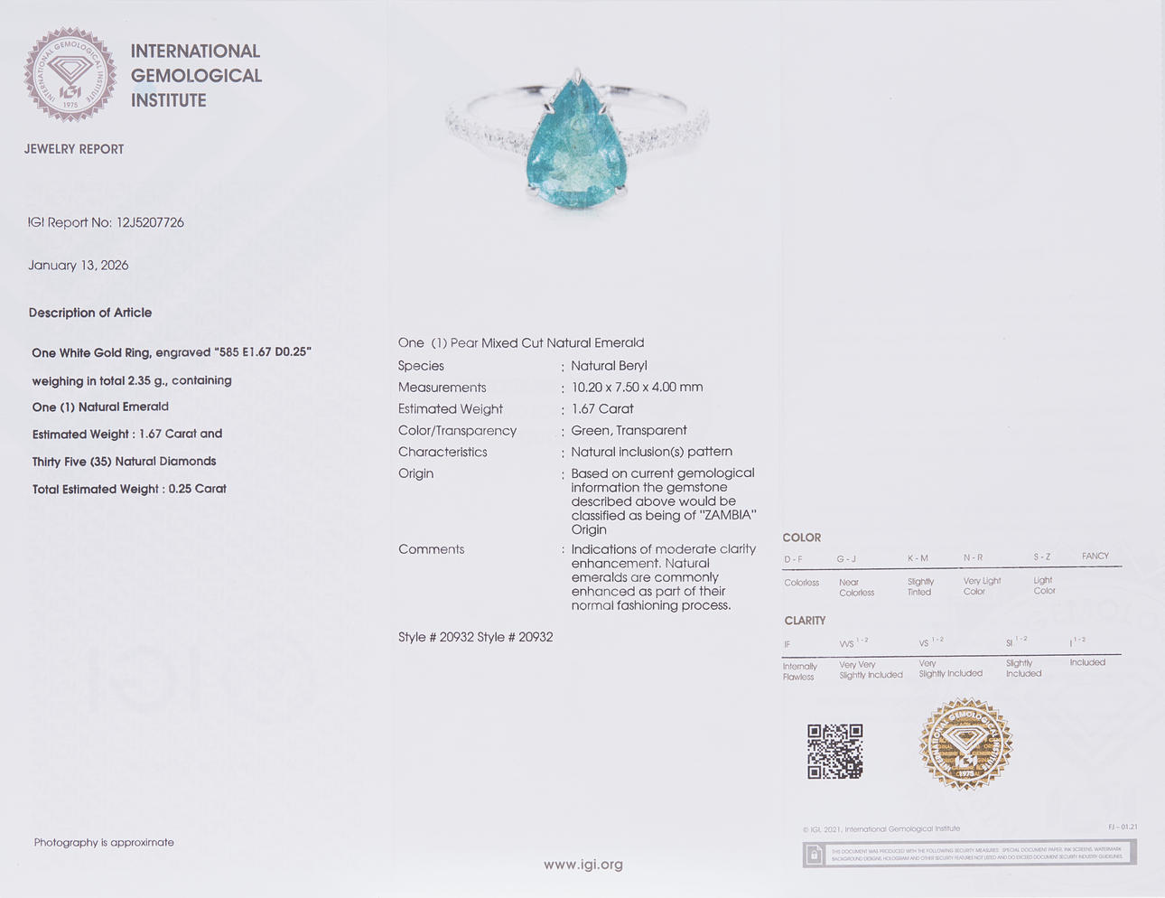 Ring made of 585 white gold, ring head set with a pear-shaped emerald, ca. 1.67 ct. Color: green, transparent Surrounded by thirty-five brilliants with a total weight of ca. 0.25 ct. Colour: Wesselton (H), Clarity: VS. Ring size: approx. 53. Ring head width: 10.3 mm Stamped, alloy tested. Weight: 2.35 g, certificate attached.