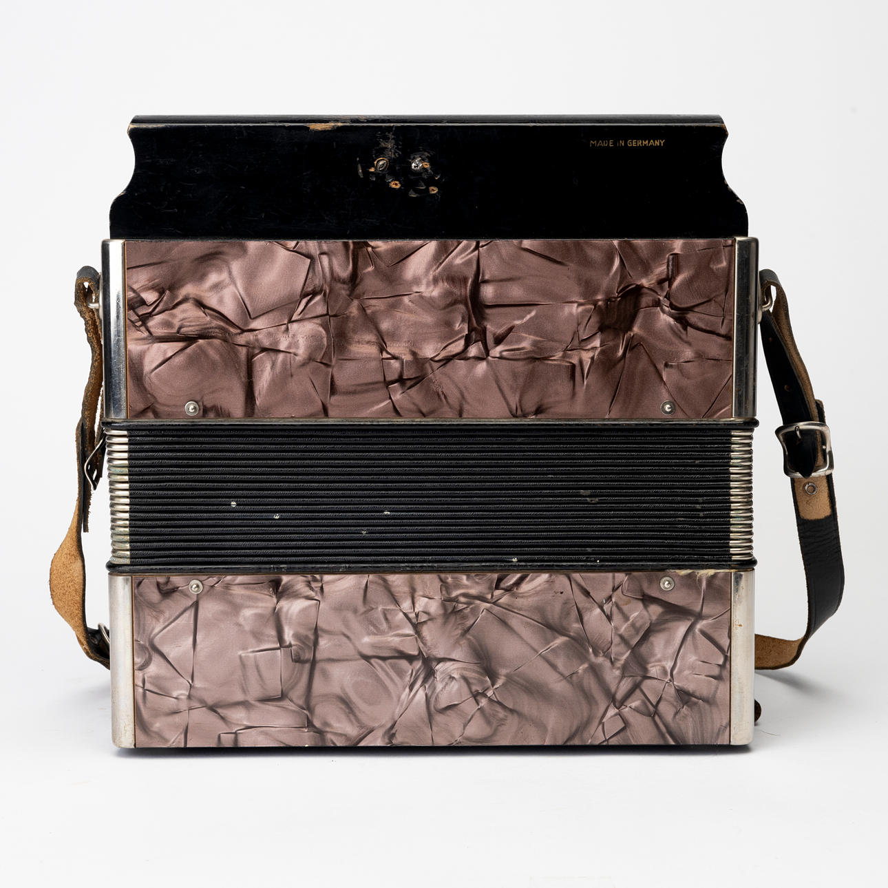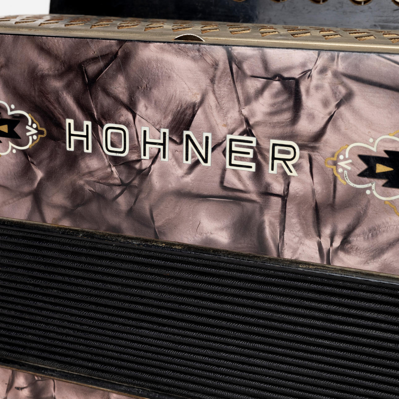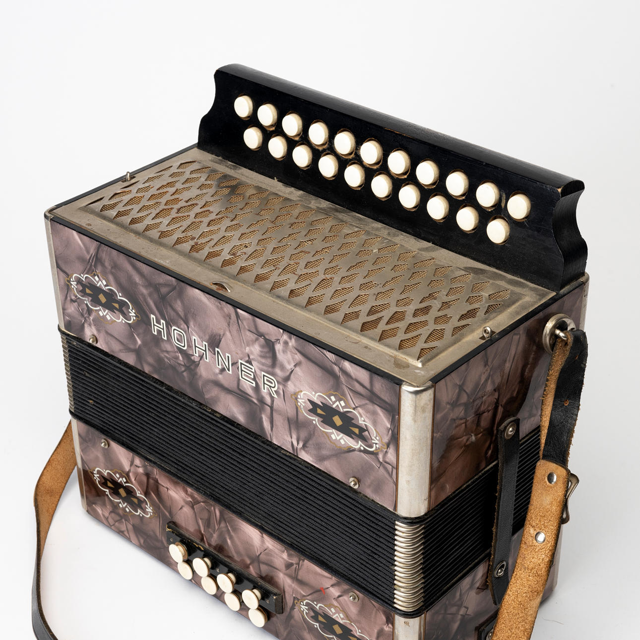 Button accordion Hohner, two-row. Dimensions 31 x 32 cm folded.