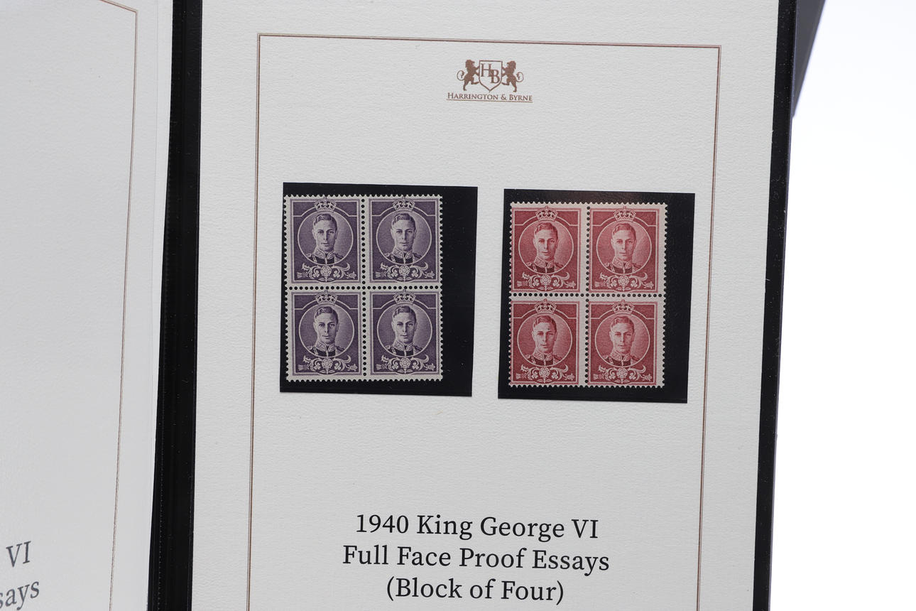 Including The War Tax Stamp Collection, 1945 Victory of Japan Postcard, 1948 Royal Silver Wedding unused Stamps, and 1940 George VI Full Face Proof Essays (block of four). All in booklets and with certificates. Largest booklet (26cms by 19cms). (4).