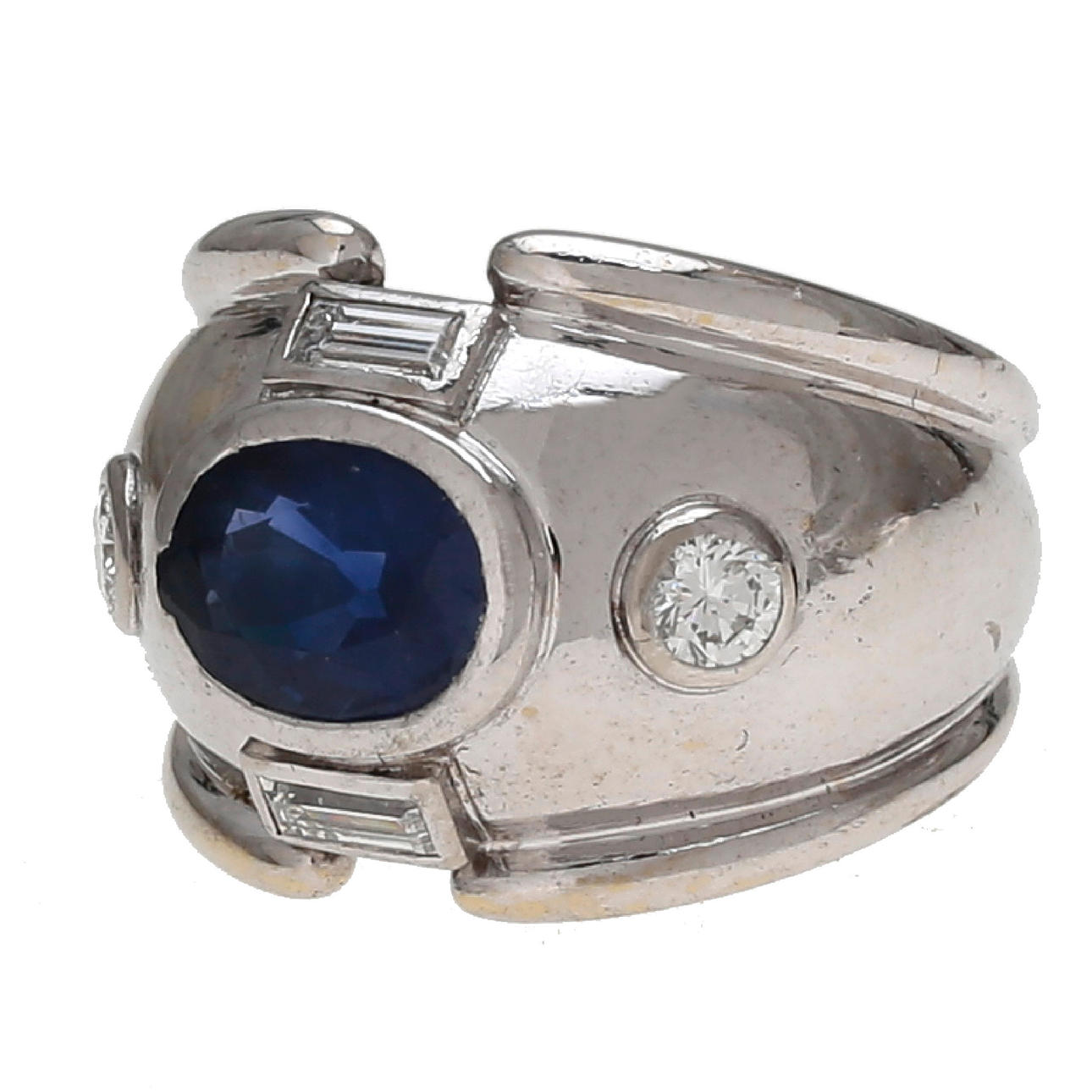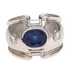 18K white gold, oval cut sapphire, approx. 2.31 cts., brilliant and baguette cut diamonds, approx. 0.35 cts. Size 13/53. 10.5 gr.