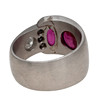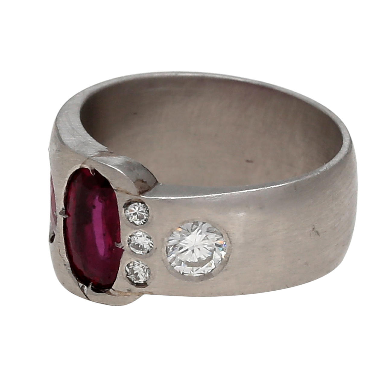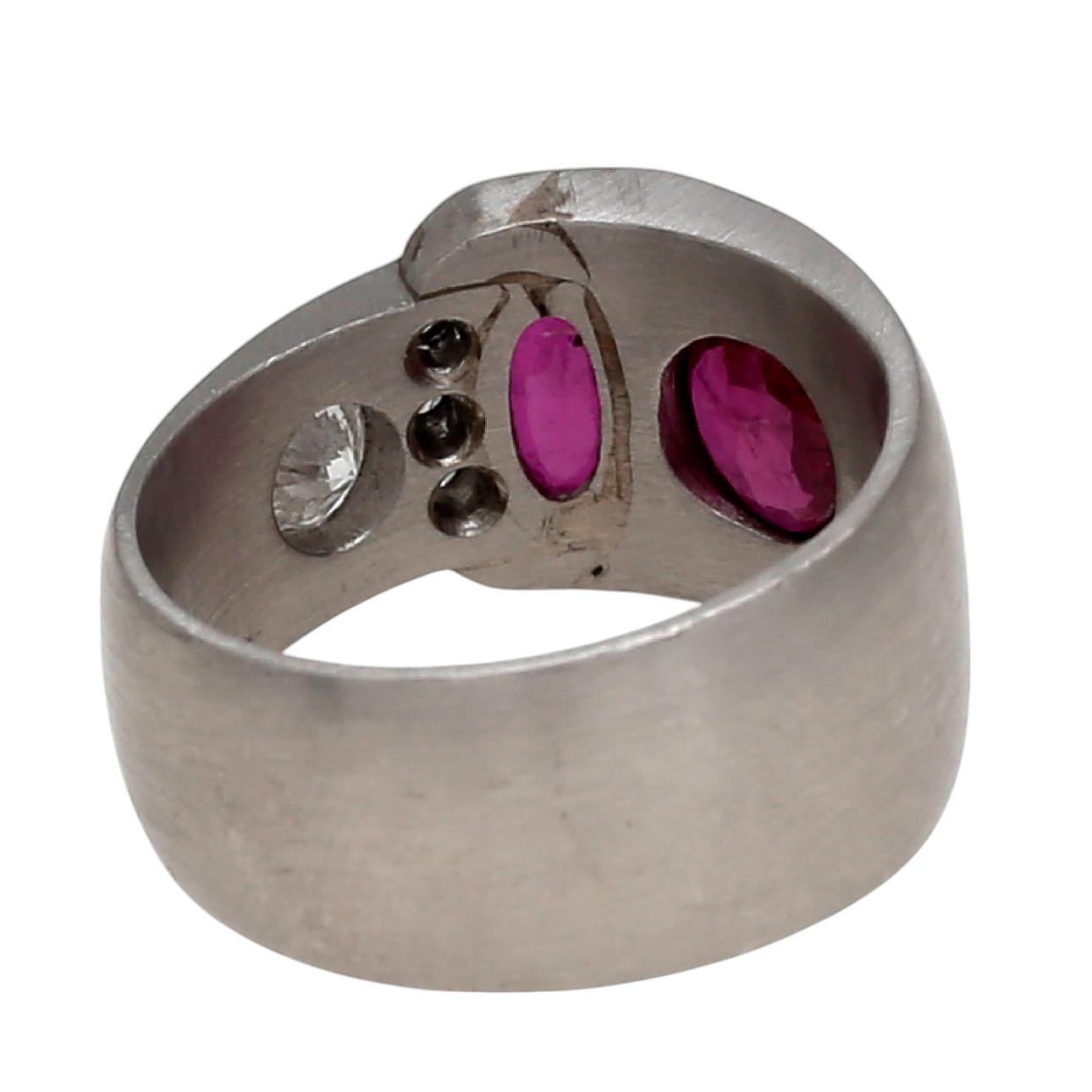 Platinum, brilliant cut diamonds, approx. 0.32 cts., and synthetic rubies. Size 13/53. 13.2 gr.
