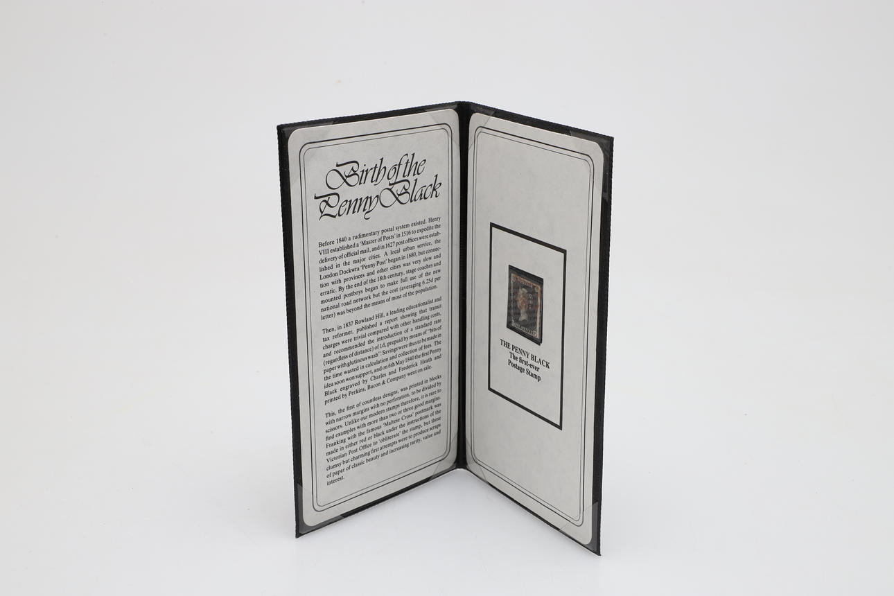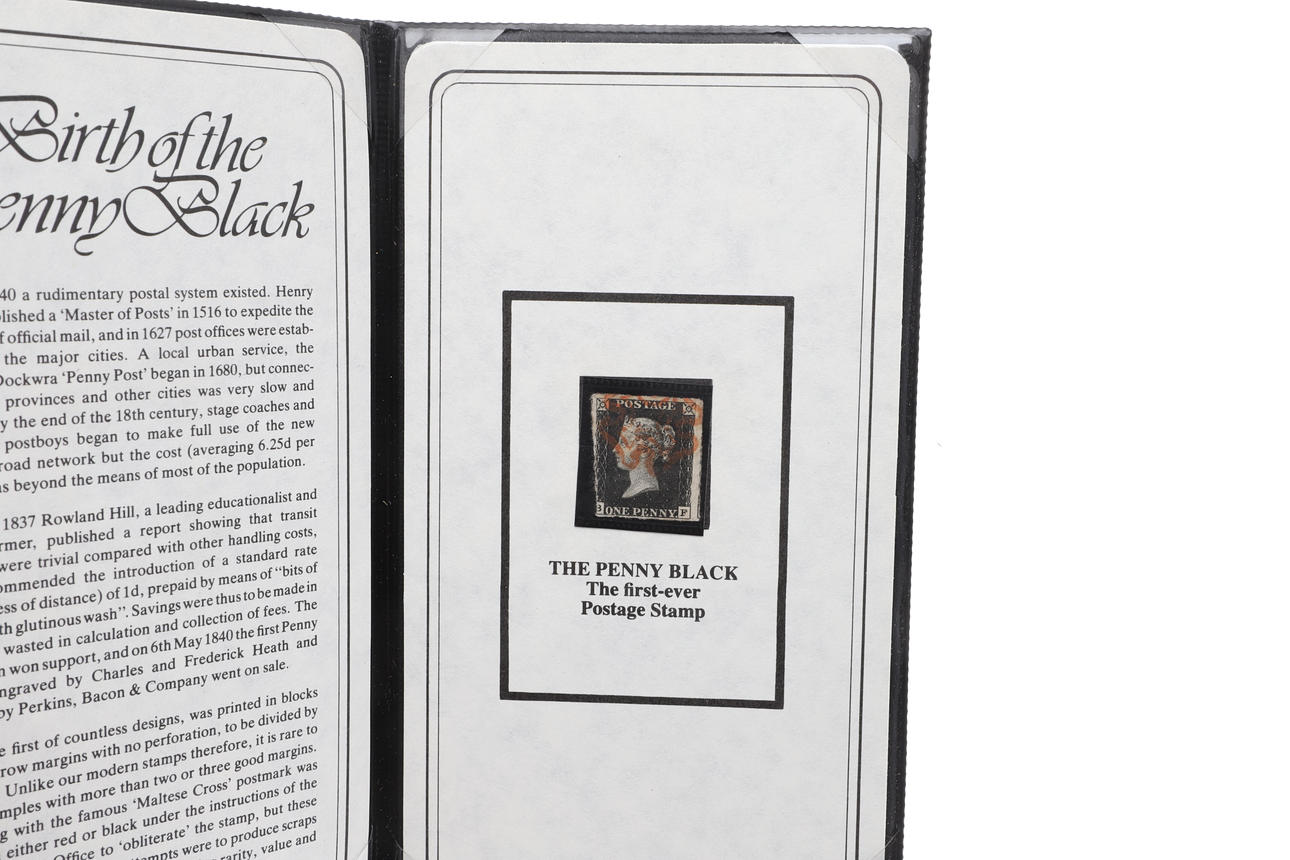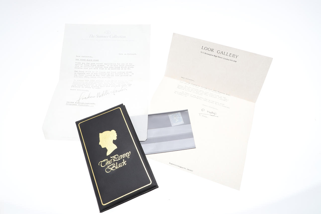 Including a Penny Black in a presentation booklet and letter (Sumner Collection), and a 2d blue stamp, with letter from the Look Gallery. Postage envelope size, 24cms by 18cms.
