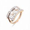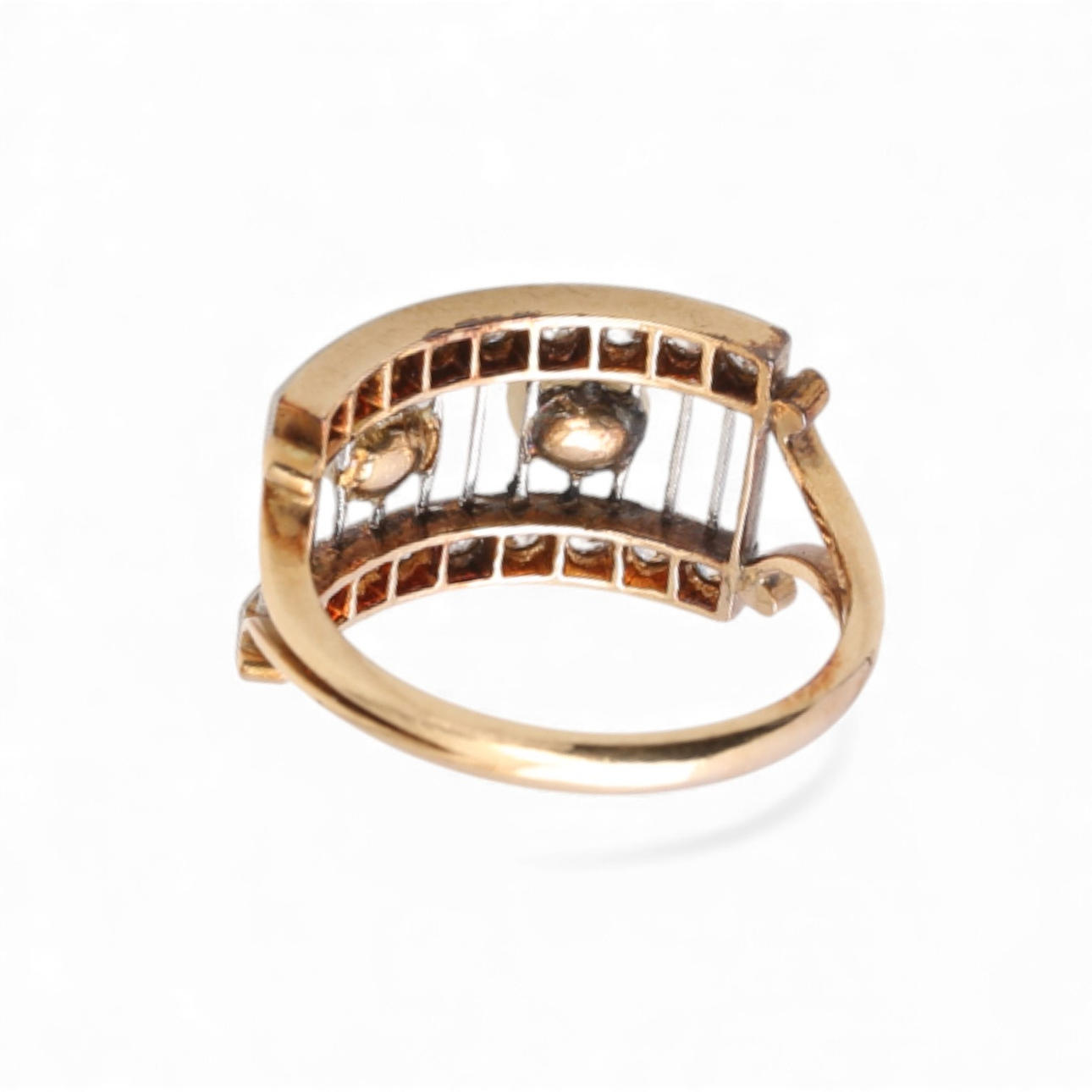 18K gold with platinum views, antique brilliant cut diamonds, 16/16 and 8/8, approx. 0.55 cts and cultured pearls 3.5 - 5 mm in diameter. Fronts: 1.1 cm. Size: 16/56. 4.9 gr.