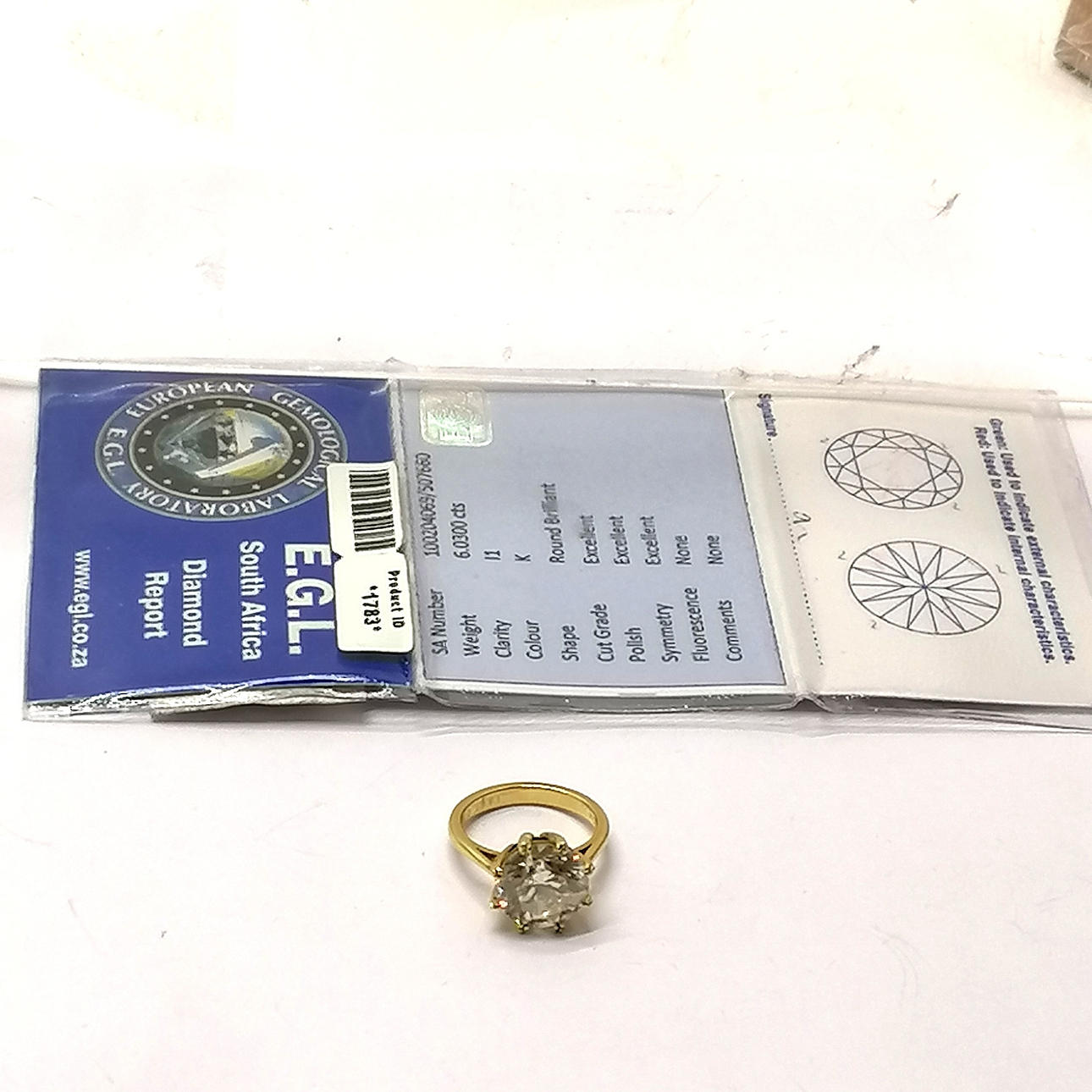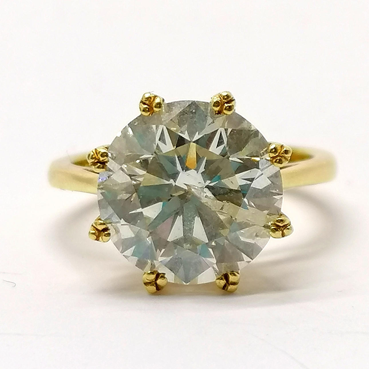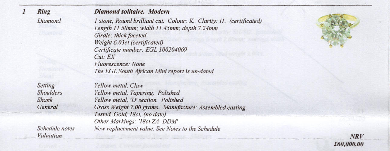 18ct gold 6ct diamond solitaire ring - size M & 7g total weight ~ Diamond certificate states 11.5mm diameter x 7.2mm deep & 6.03cts Colour K Clarity I1 & new replacement value stated as £60,000.