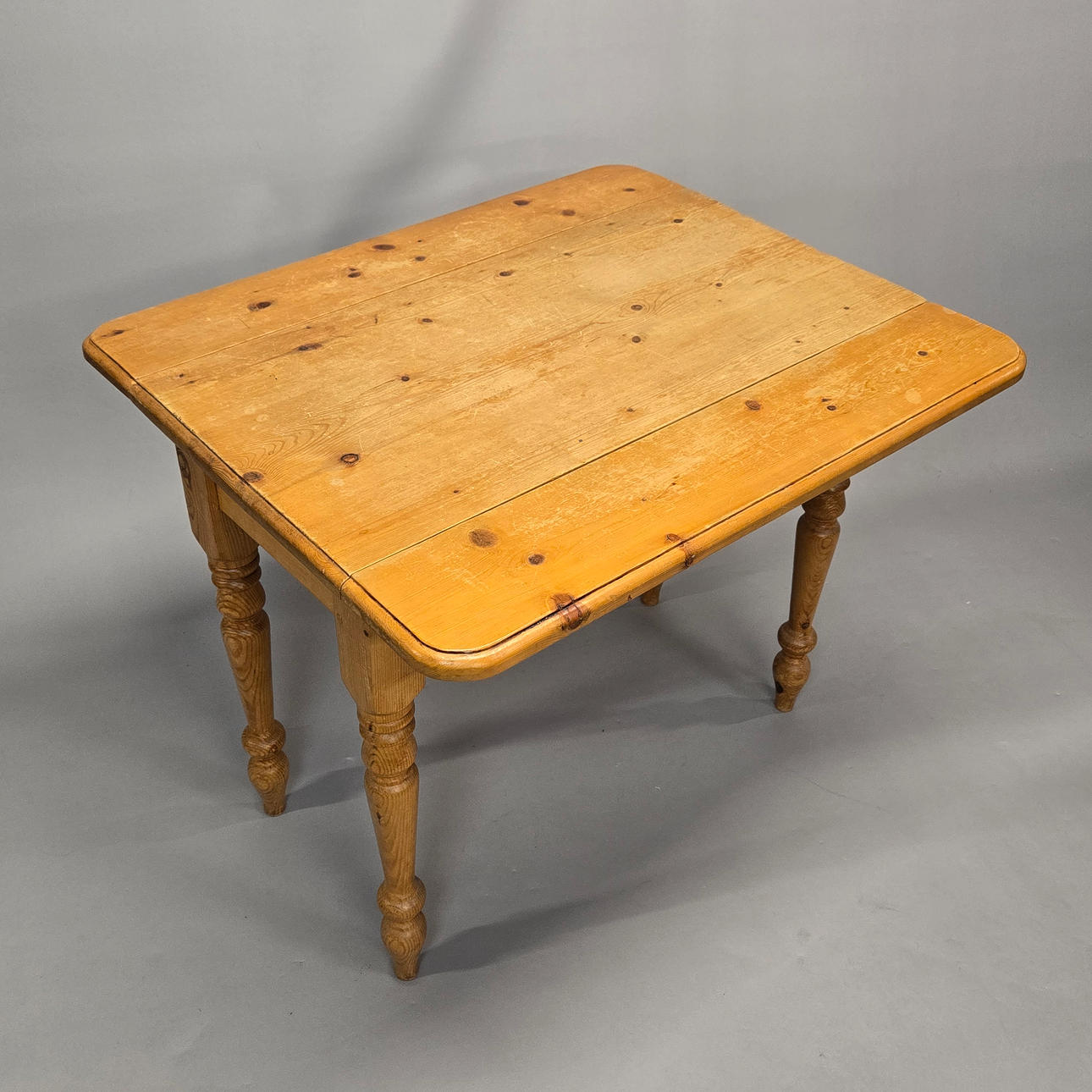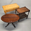 A pine drop leaf table with an inlaid mahogany oval table and an oak tea trolley on castors, drop leaf table size 65 x 90 x 77cm.