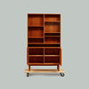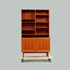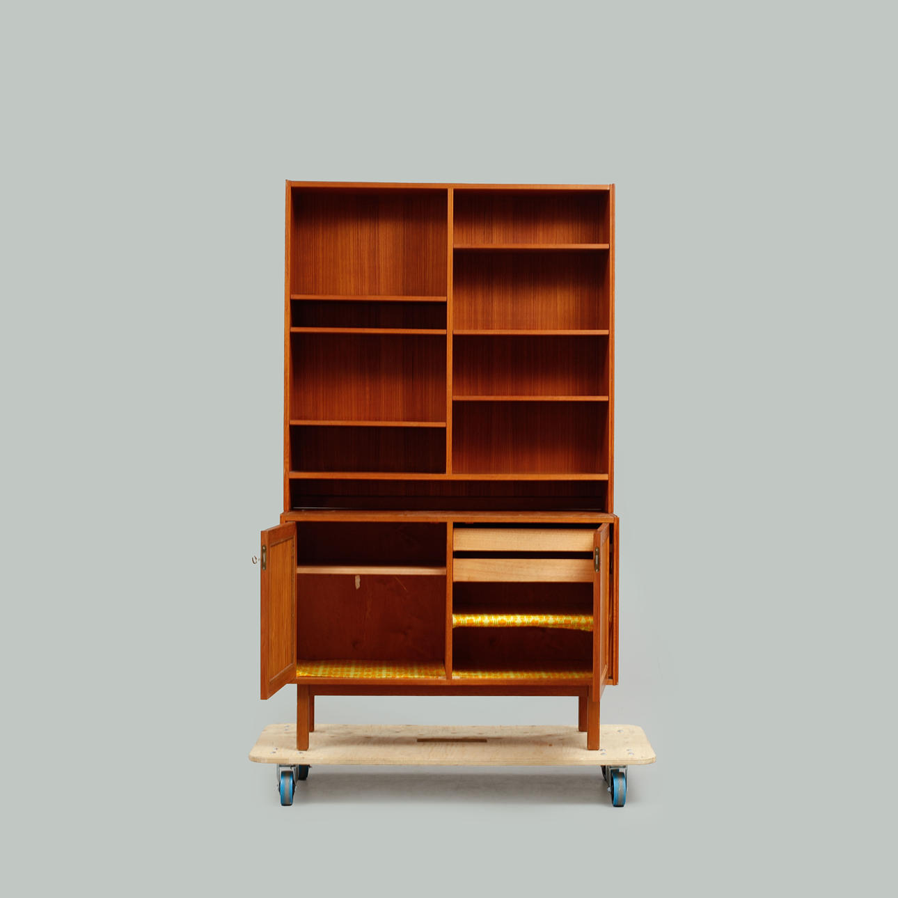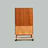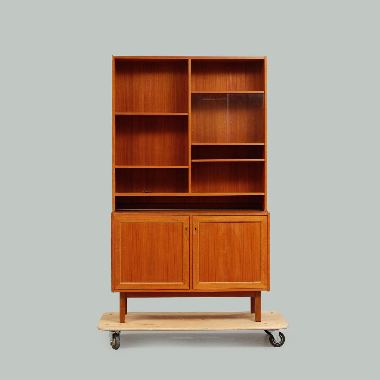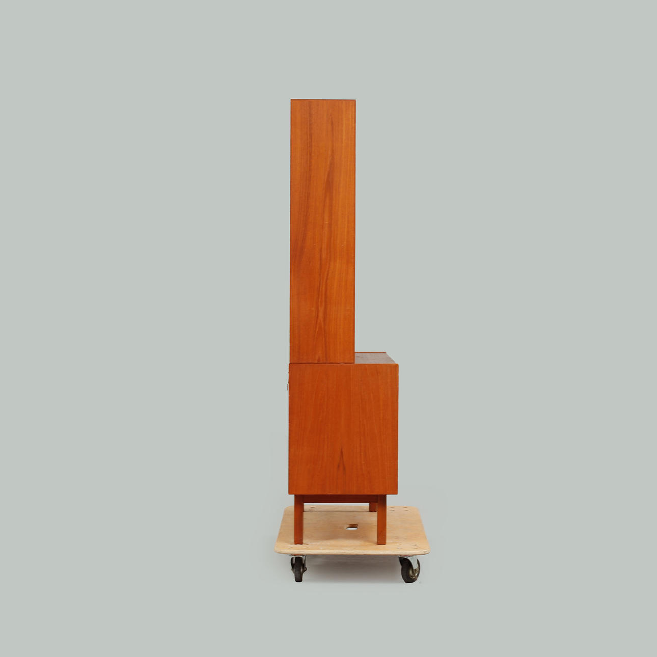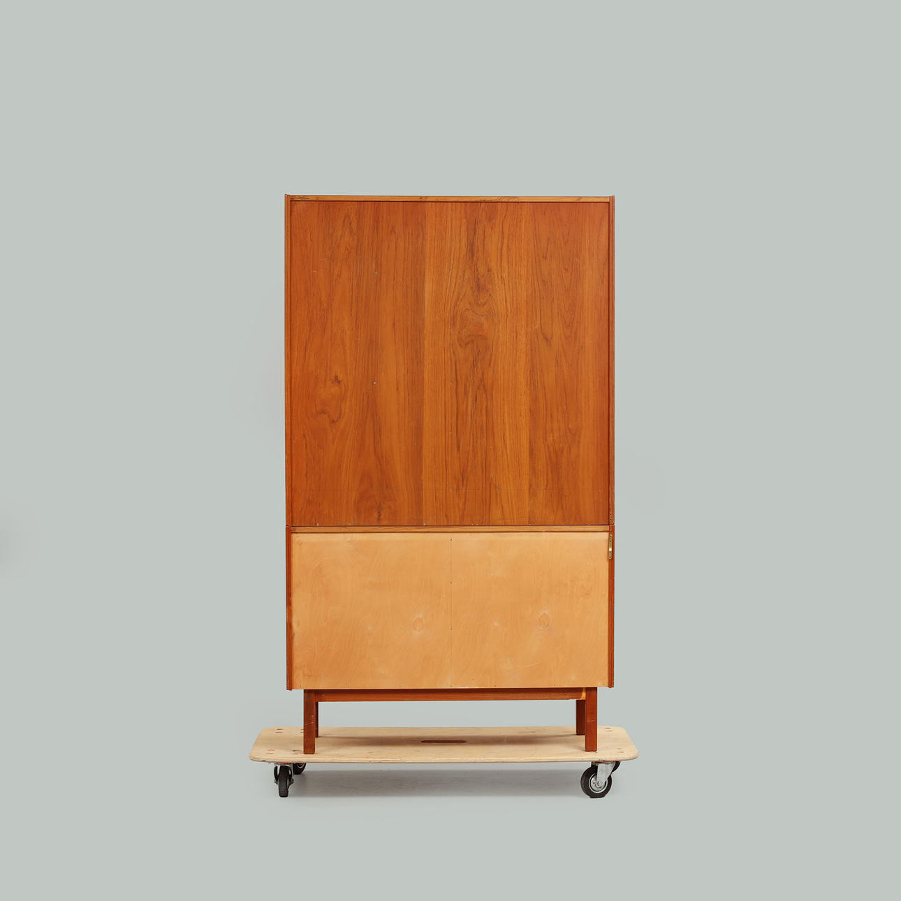 Teak and teak veneer. Two doors with shelf and drawer interior. Width approx. 100 cm, depth 42 cm, height 170 cm.