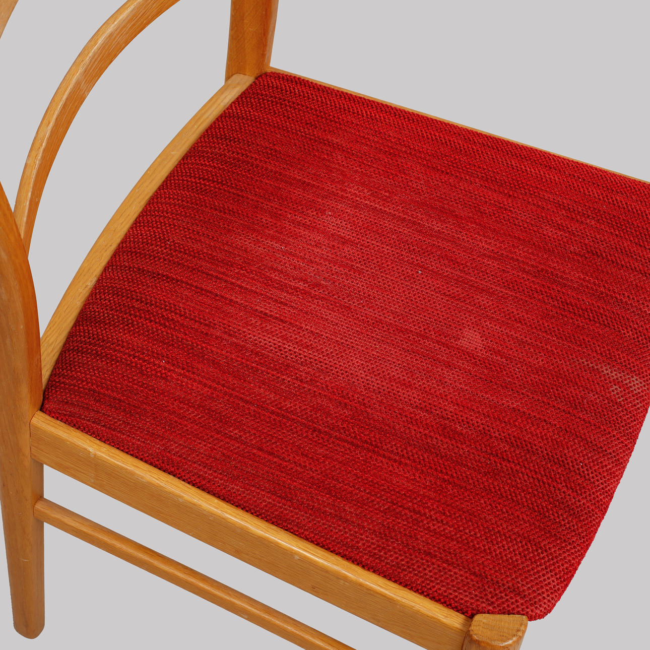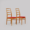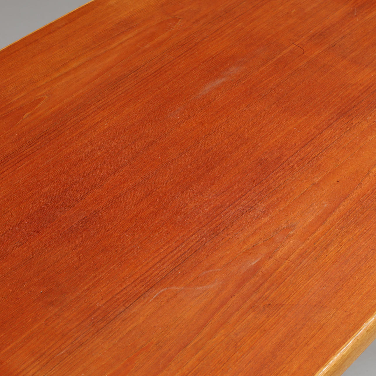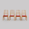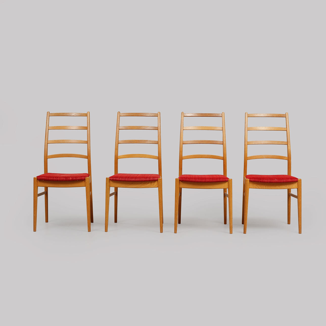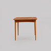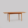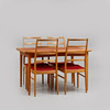 Oak and teak. Table with Dutch excerpt and four chairs with loose textile upholstered seat. Table length approx. 35 + 120 + 35 cm, width approx. 82 cm. Height approx. 73 cm. Seat height approx. 44 cm, back height approx. 94 cm.