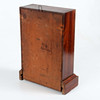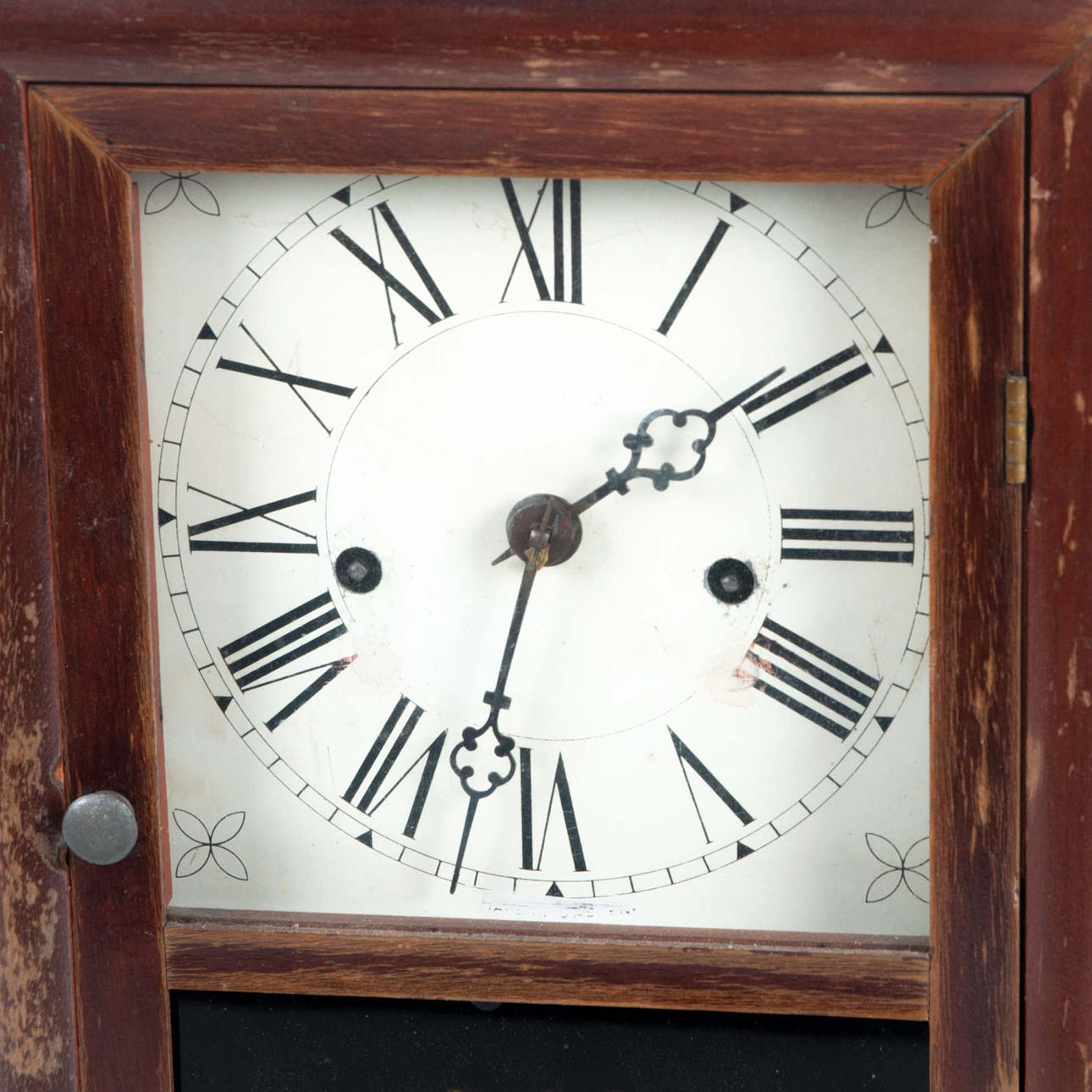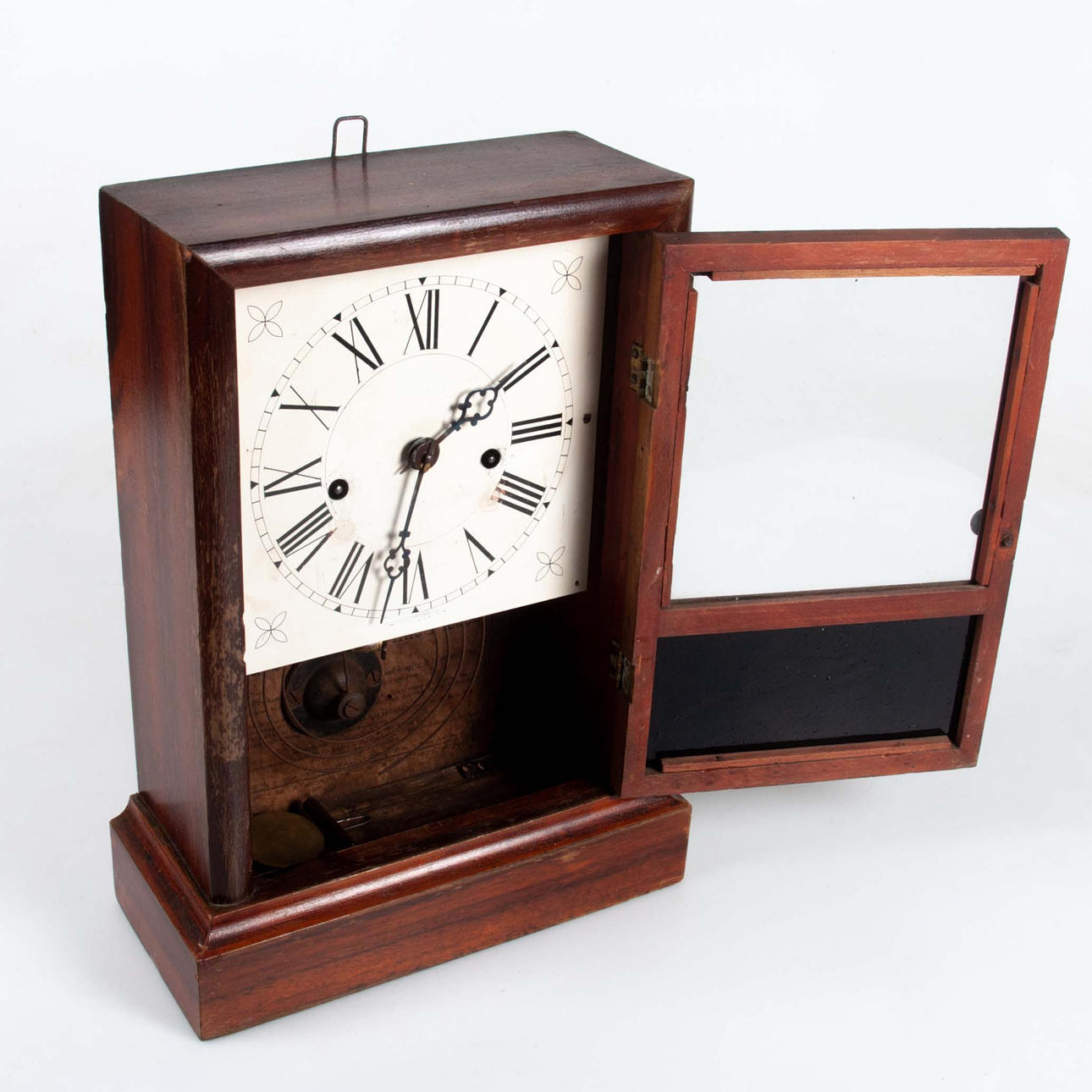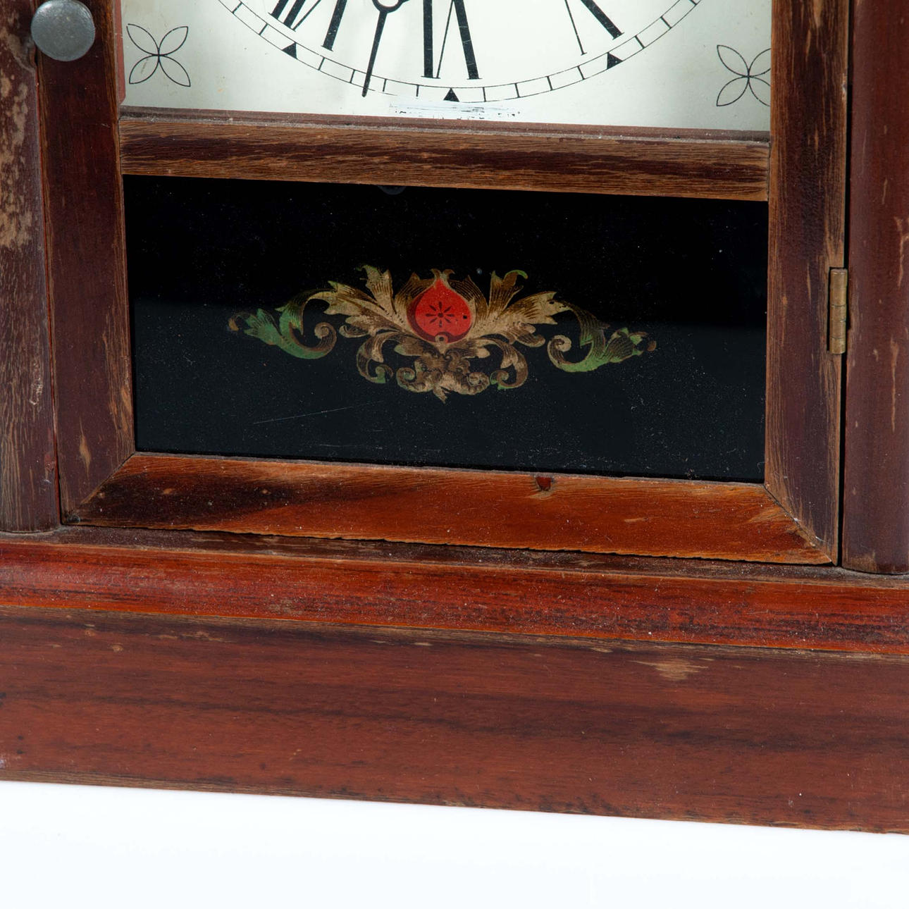 Wood veneer and stained glass, painted dial with Roman numerals. Later suspension device