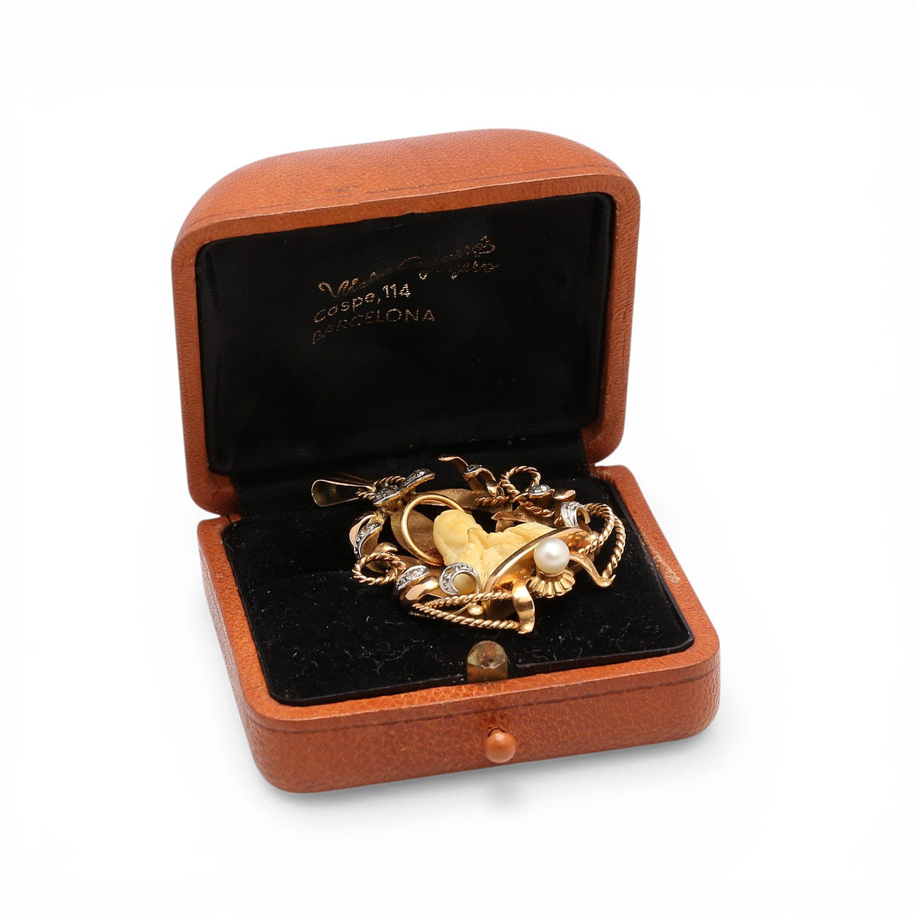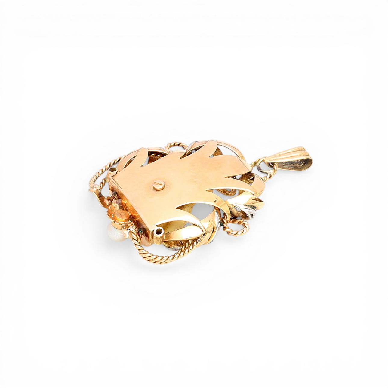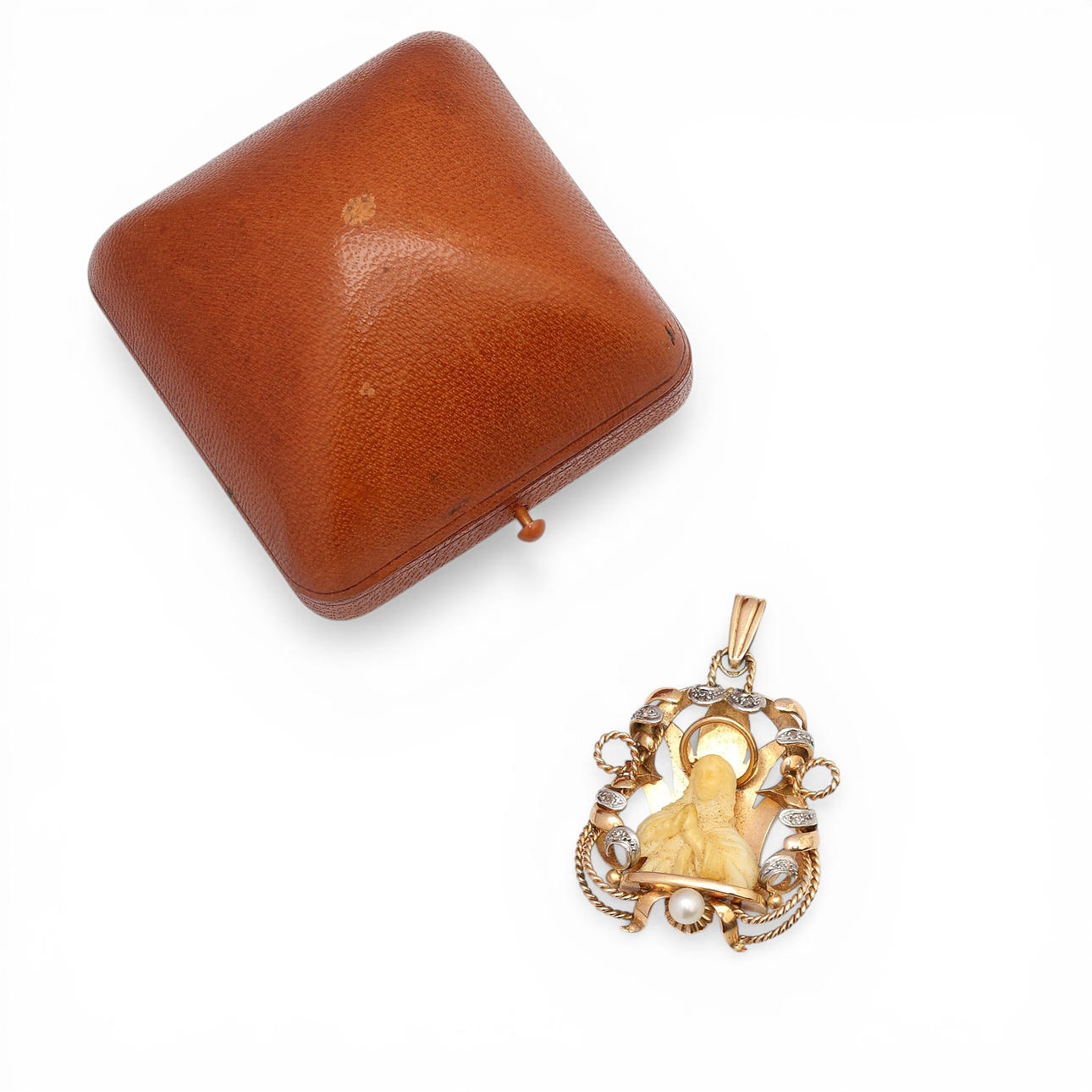 18K gold with platinum views, rose cut diamonds, approx. 0.02 cts., and central figure in ivorine, depicting Madonna. 4.5 x 3 cm. 9.9 gr.