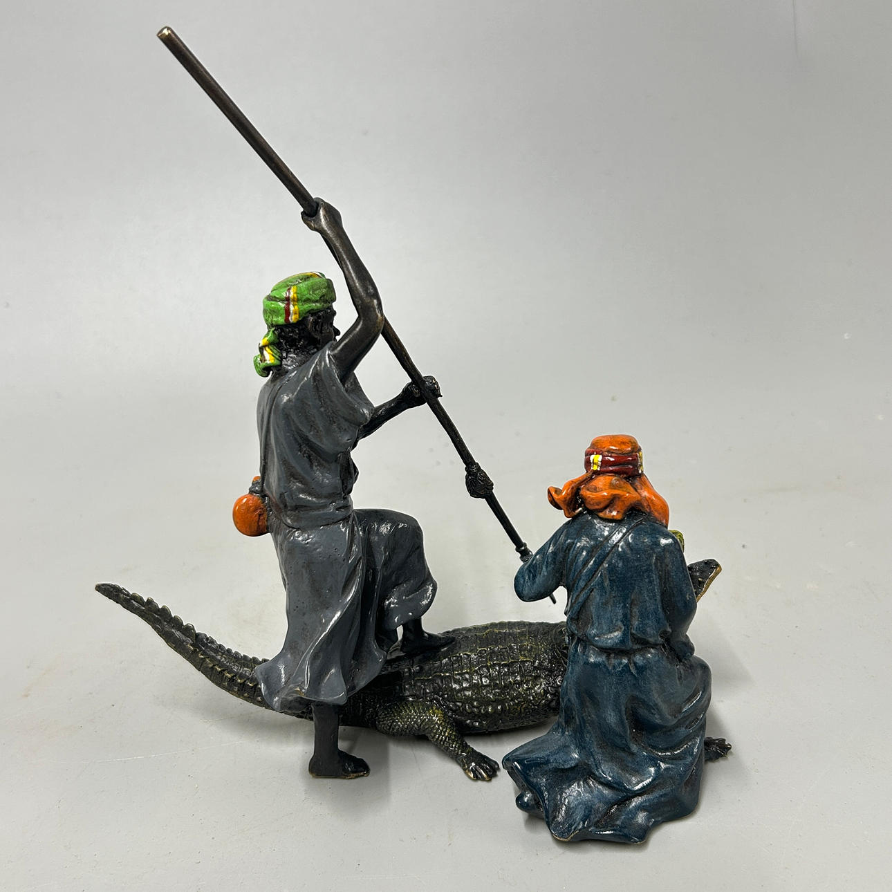 A Vienna cold painted bronze Arab figure of two men and crocodile, length 22cm, depth 12cm, height 23cm.