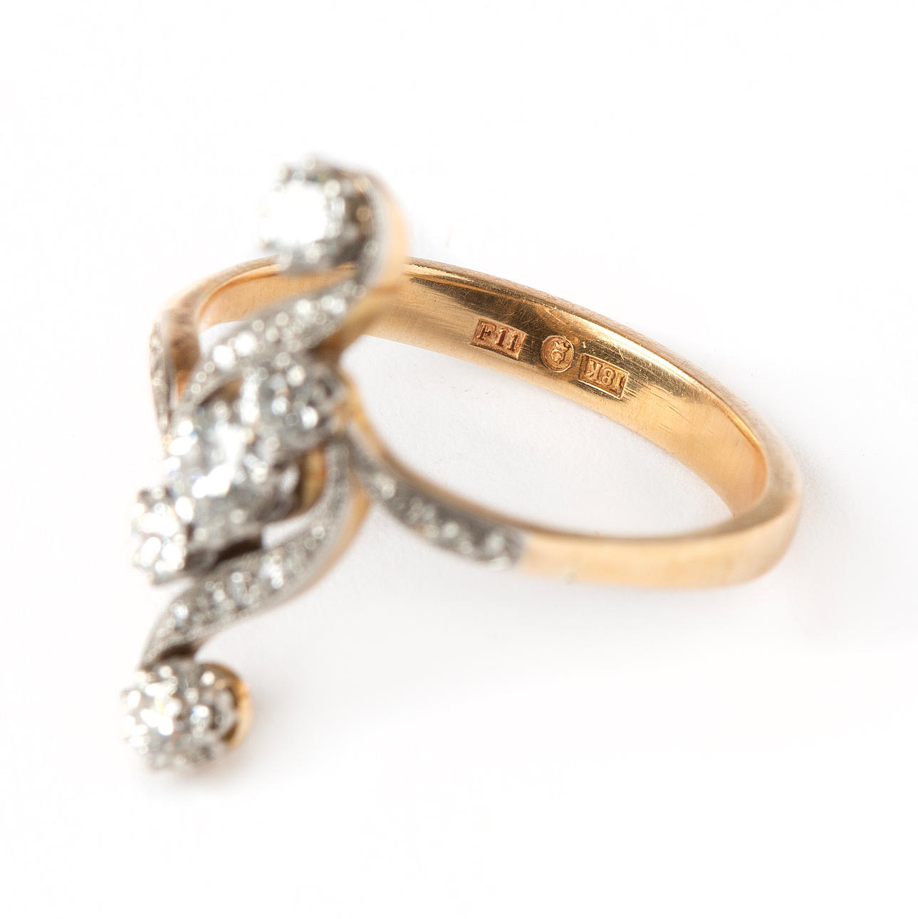 A 18K gold ring with old cut diamonds.