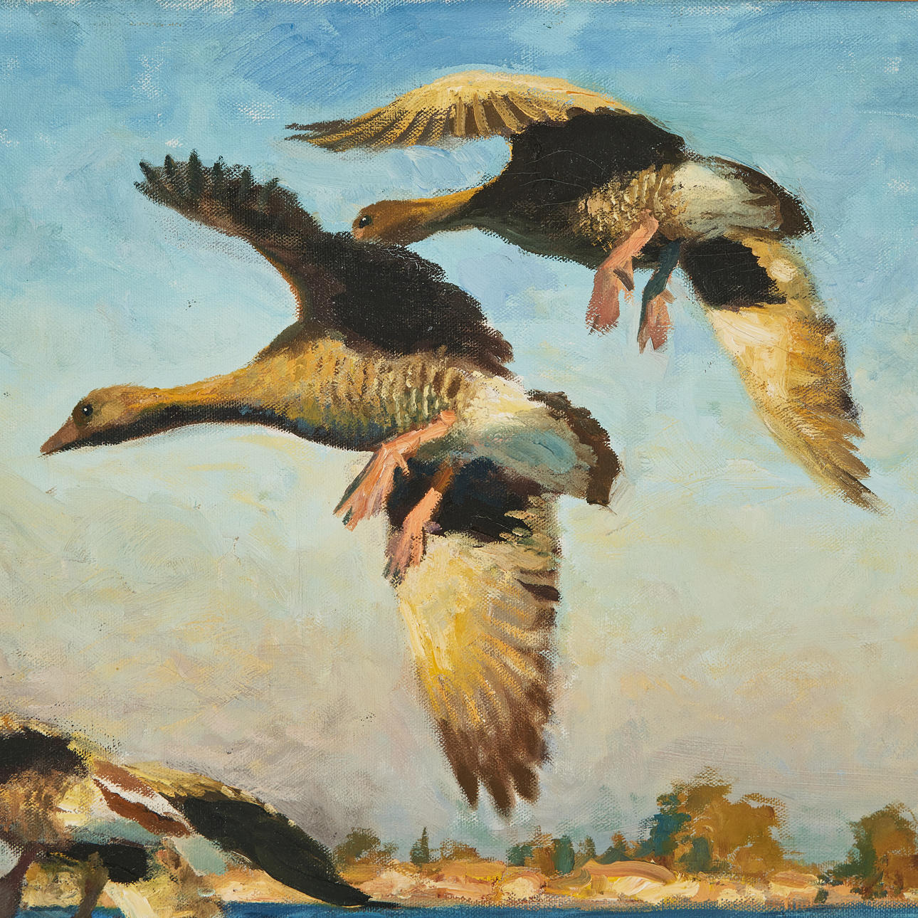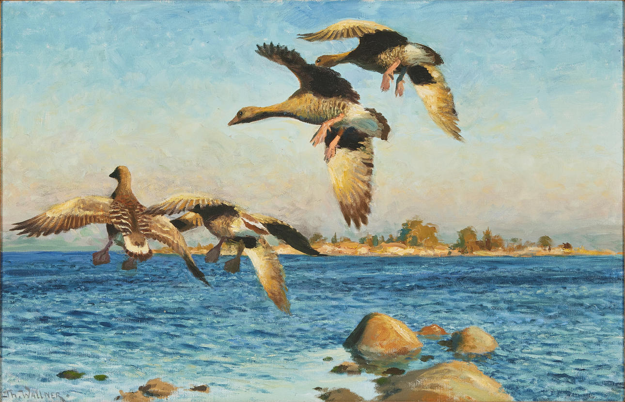 4947077. THURE WALLNER. Stretching geese, oil on canvas, signed Th Wallner.