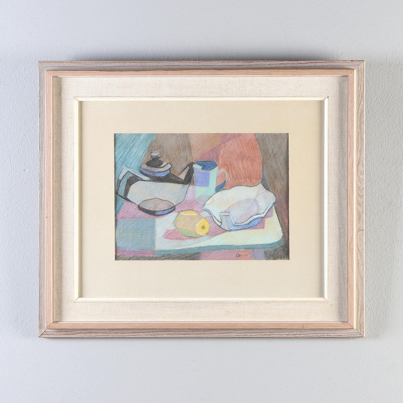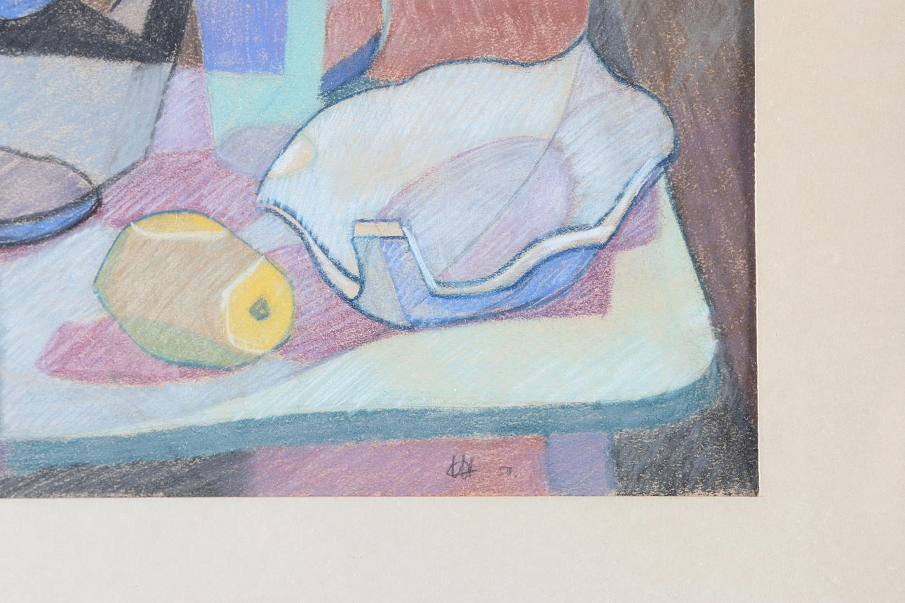 4947271. OIDENTIFIERAD KONSTNÄR. Pastel on paper, indistinctly signed, possibly C.W. Dated -50. Still life with pitcher and fruit.