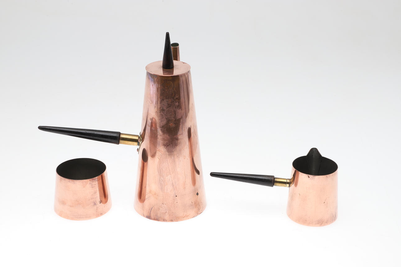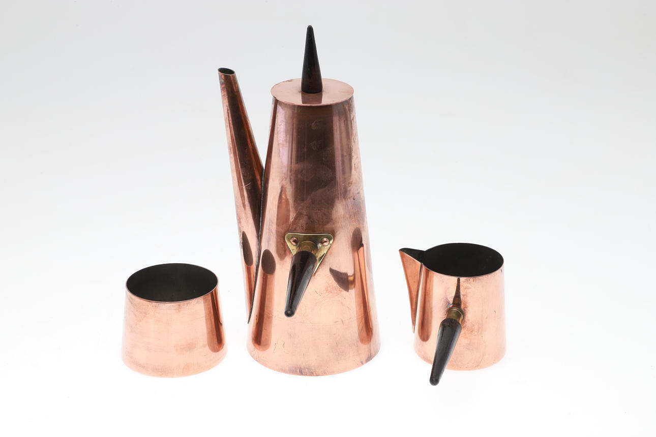 A Copral copper part coffee service, to include a copper coffee pot, sugar jug, milk jug and large plate. Size of pot, 24cm (h) x approx. 21cm wide including handle. (4).