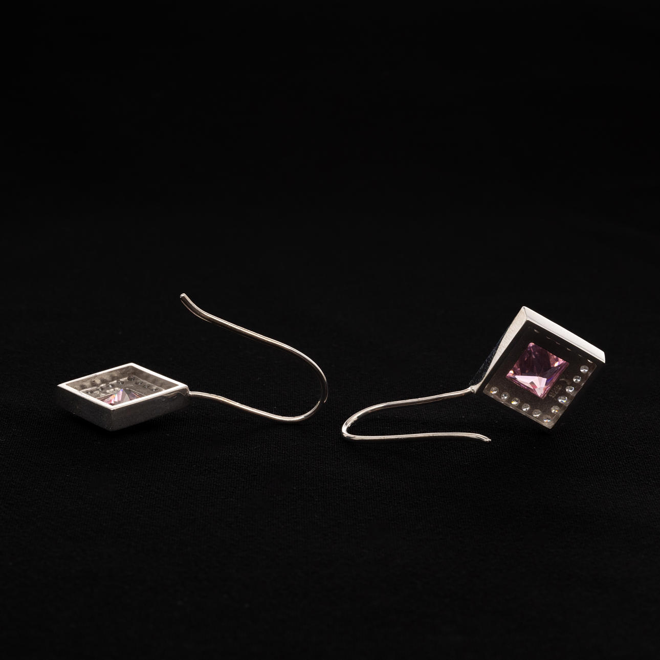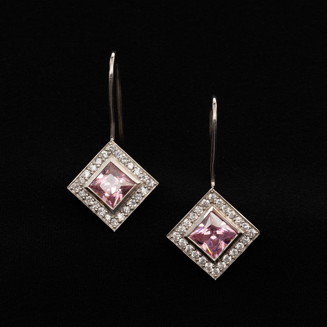 A pair of sterling silver earrings with princess-cut pink cubic zirconia and white brilliant-cut cubic zirconia
