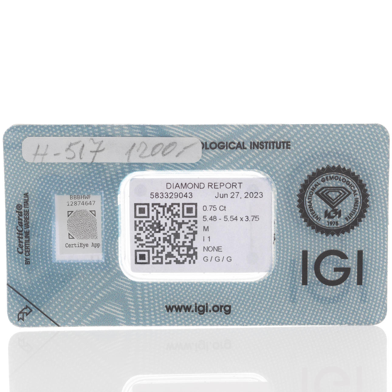 Certificate included dated June 27, 2023 IGI with No 583329043.