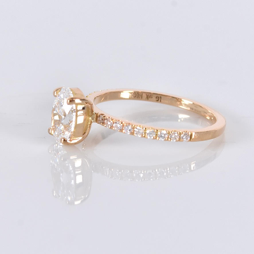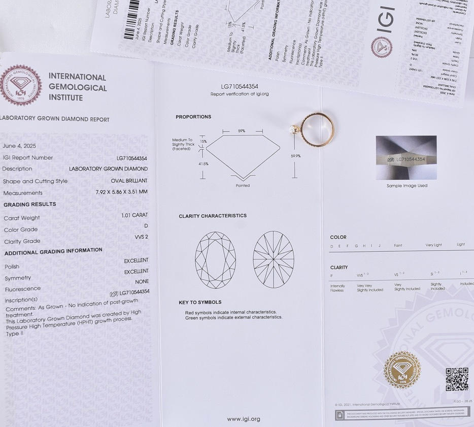 Possessed with a larger oval cut diamond of 1,01ct River/VVS2 (D/VVS2) IGI Cert no. LG710544354 and smaller brilliant cut diamonds of 0.18ct in matching quality