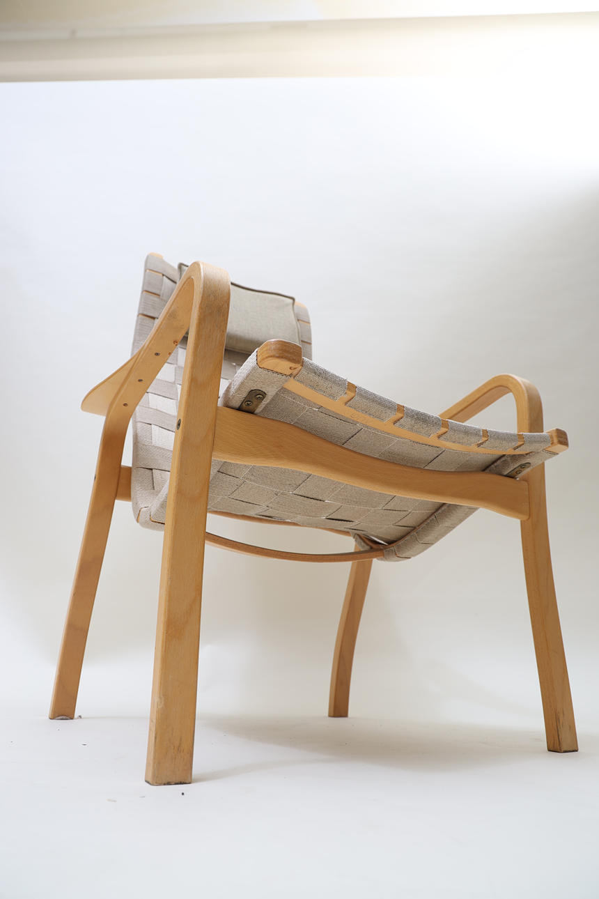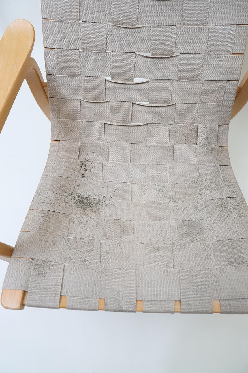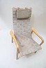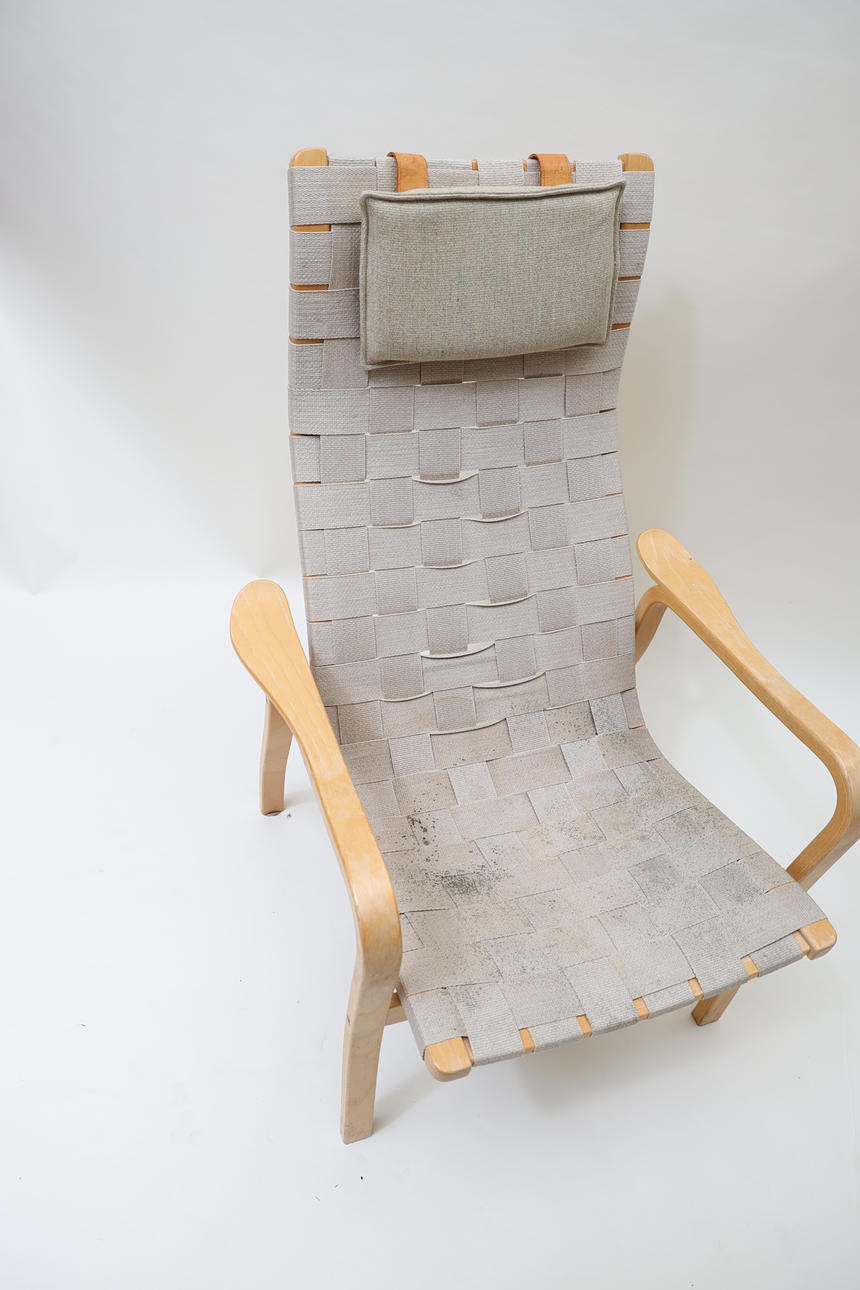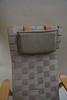 Laminated book, seat and back made of canvas. Neck pillow made of textile with straps made of leather.