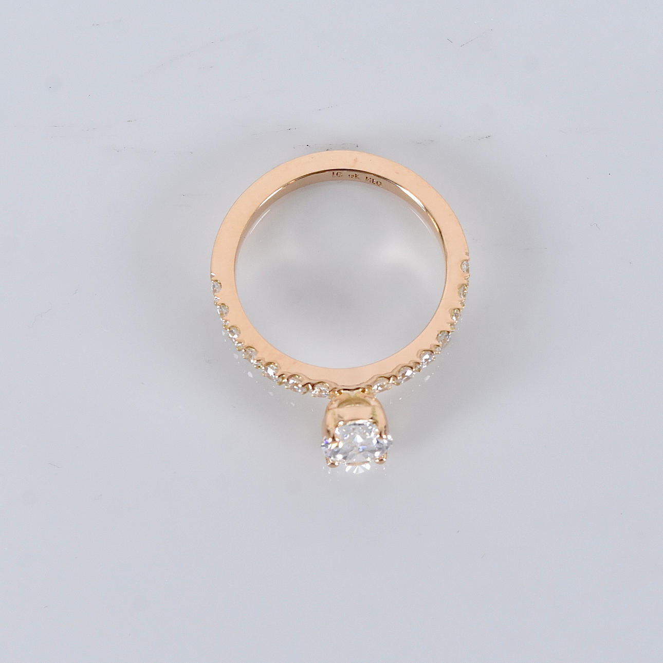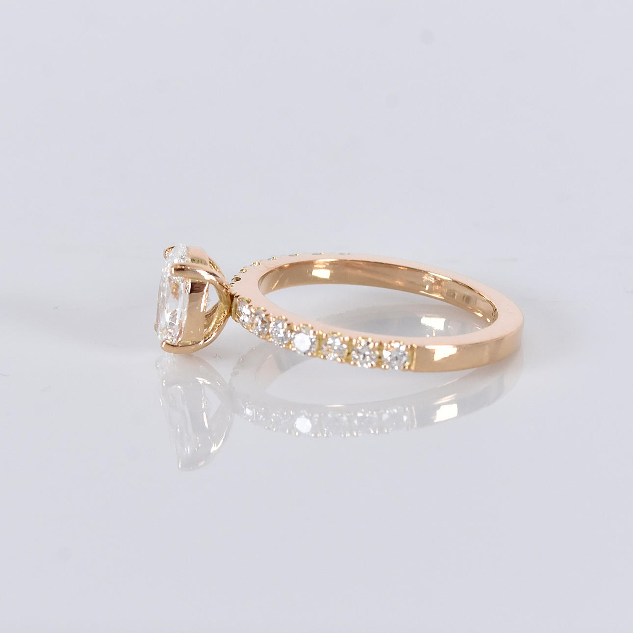 Possessed with a larger oval cut diamond of 1,05ct River/VVS2 (E/VVS2) IGI Cert no. LG702540182 and smaller brilliant cut diamonds of 0.28ct in matching quality
