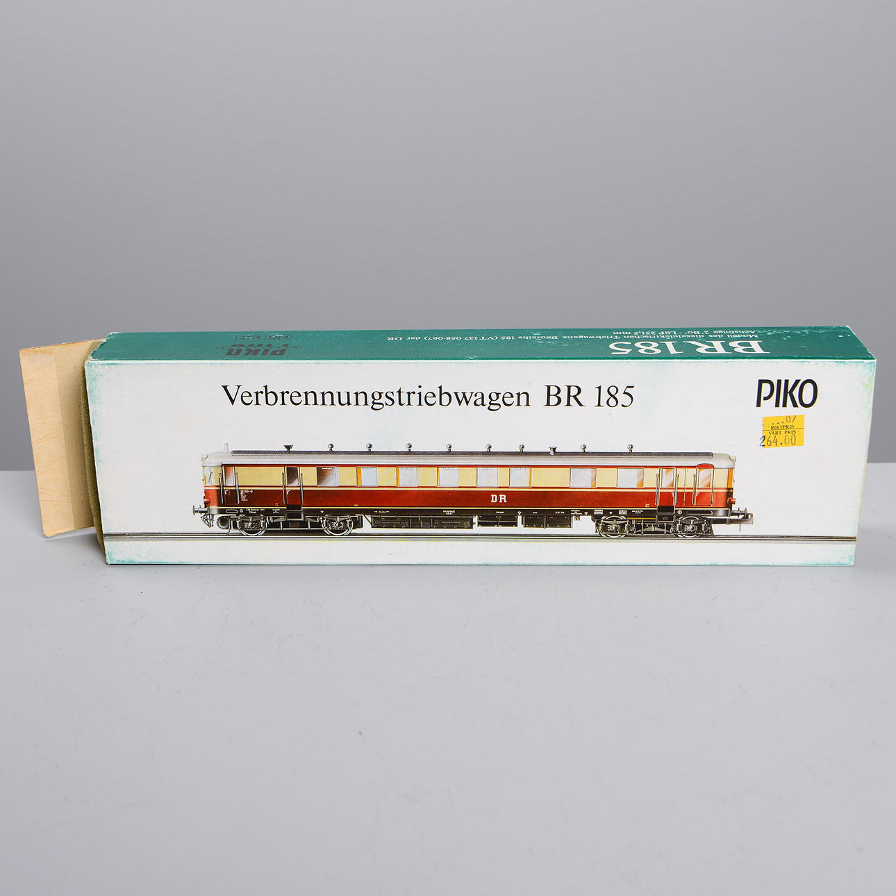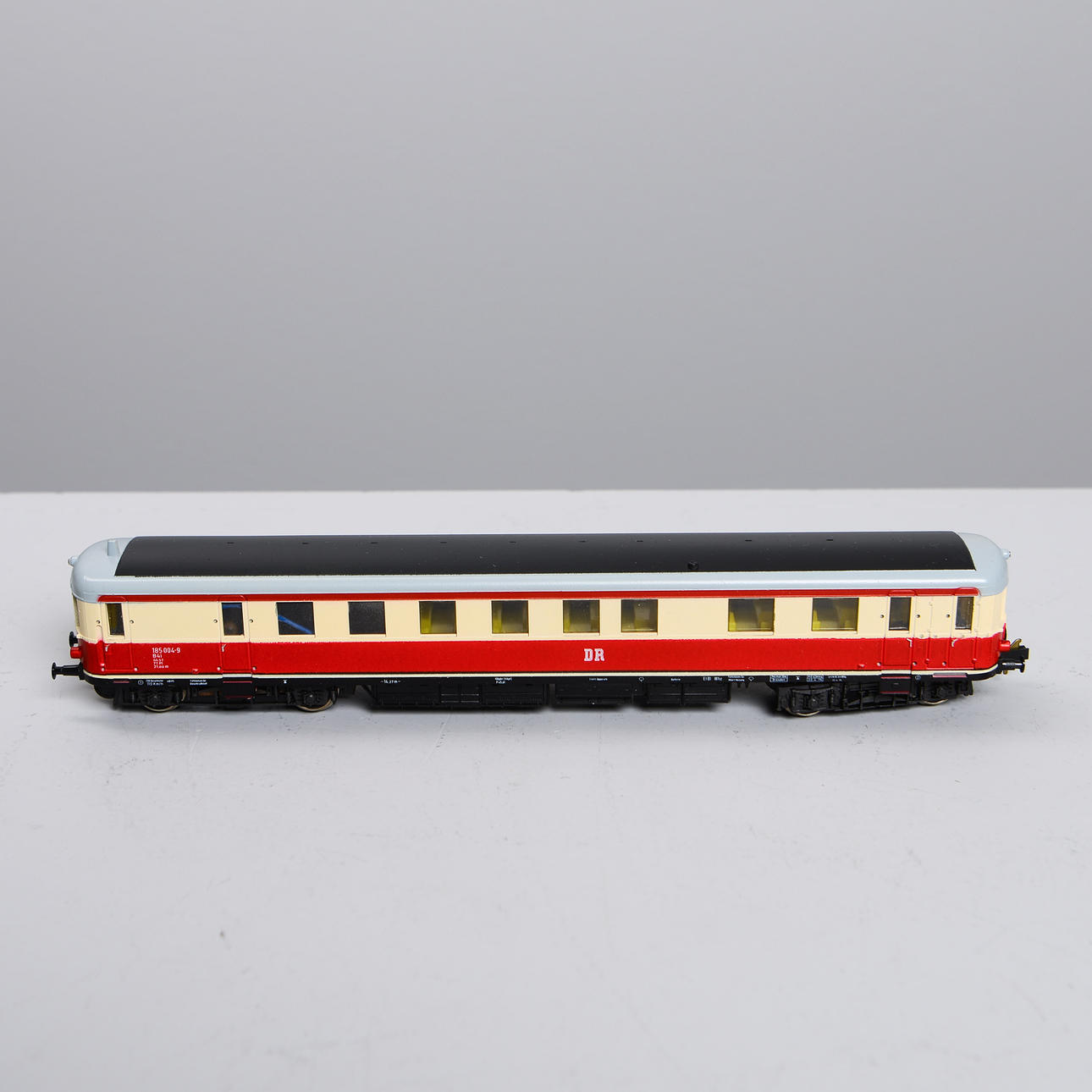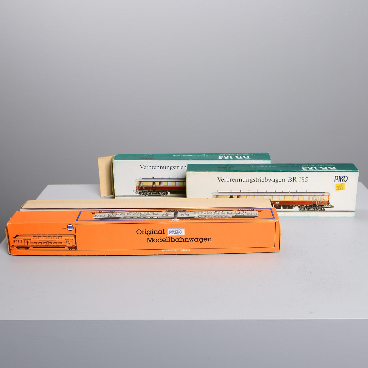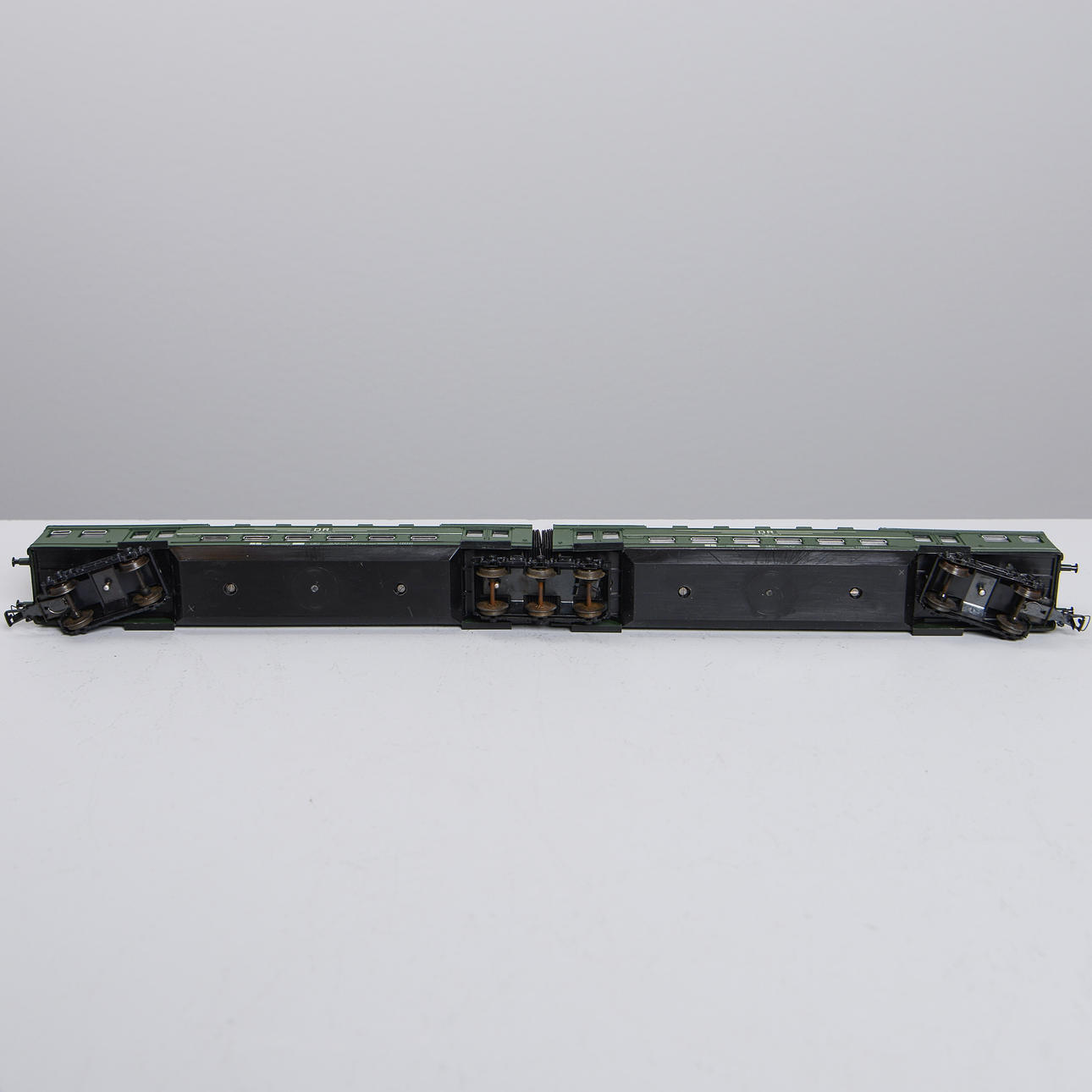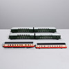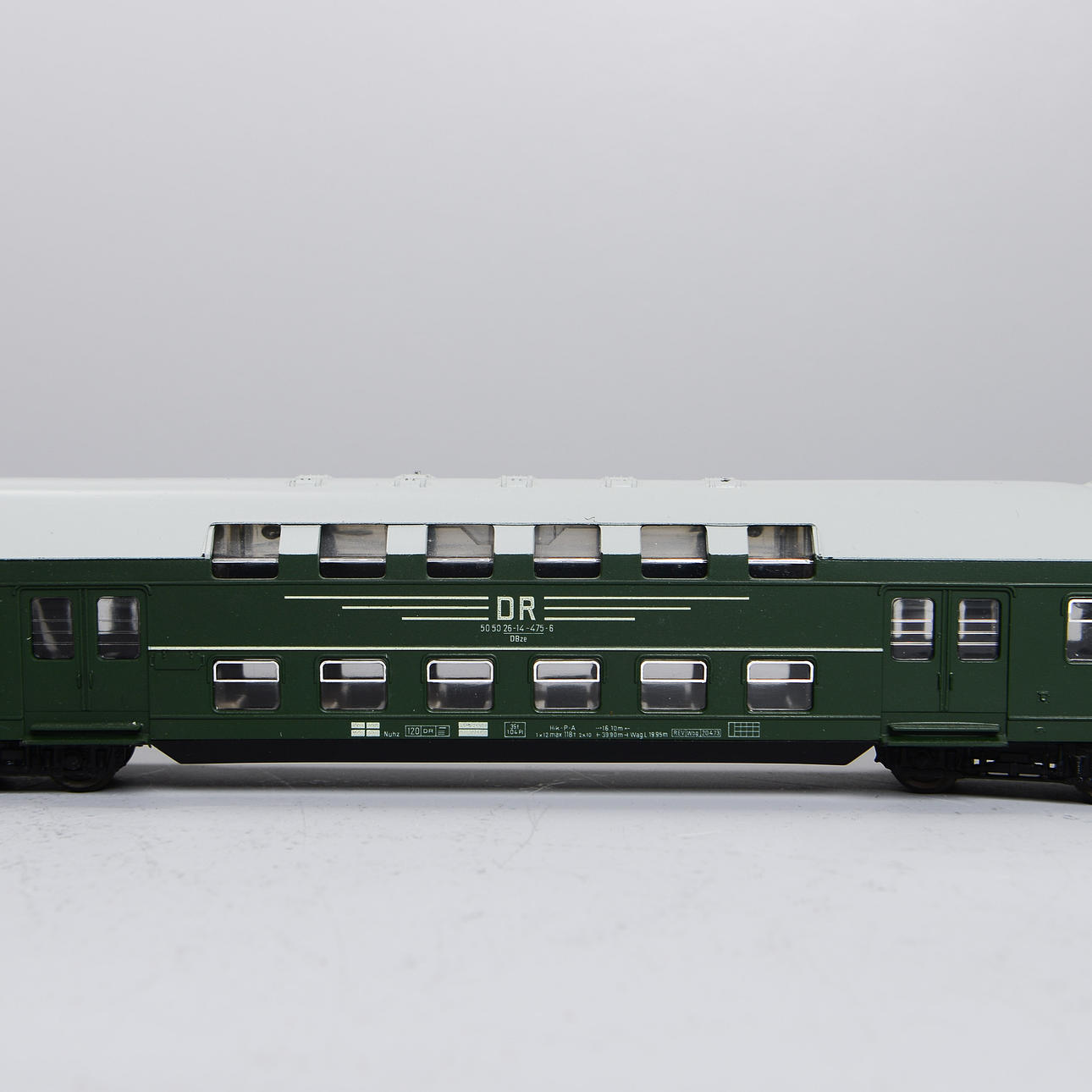 4 double deck wagons, one in original carton. L: 50 cm. Motor carriage and trolley in original cartons. L: 36 cm.