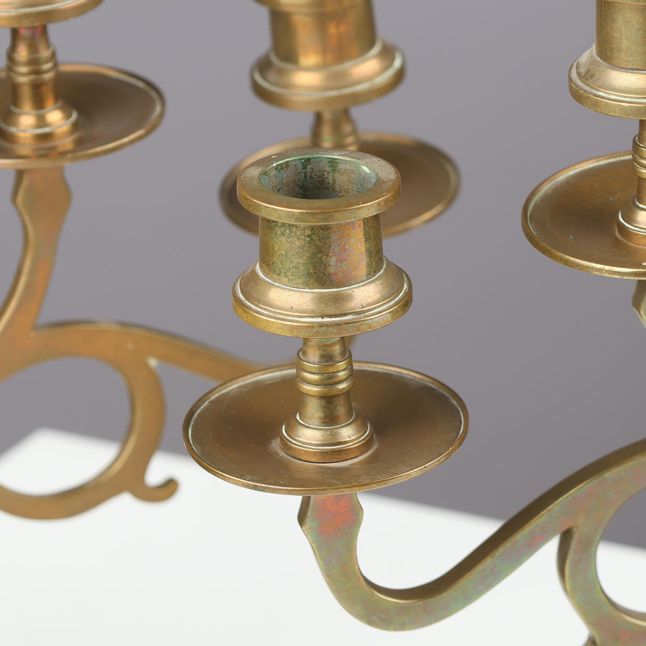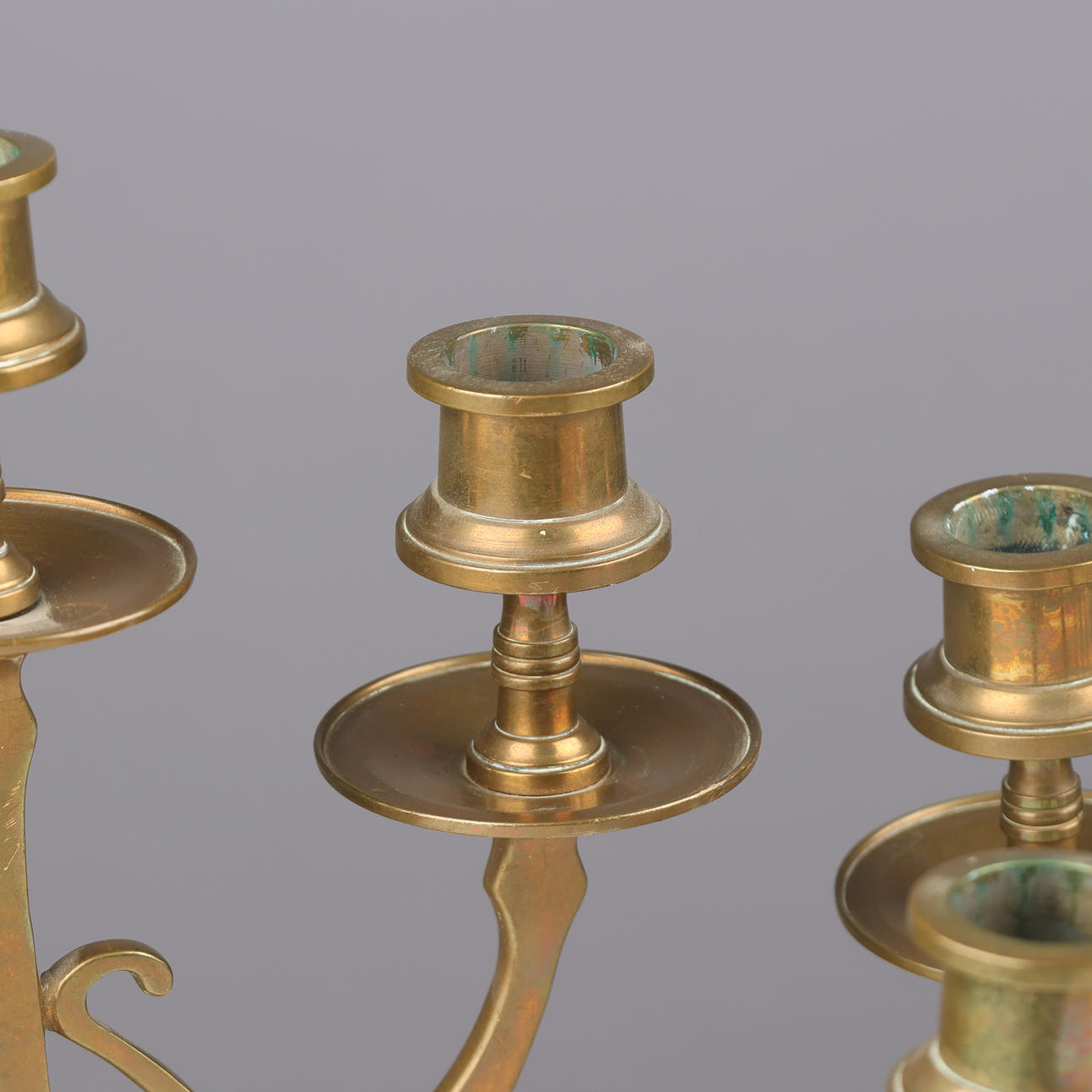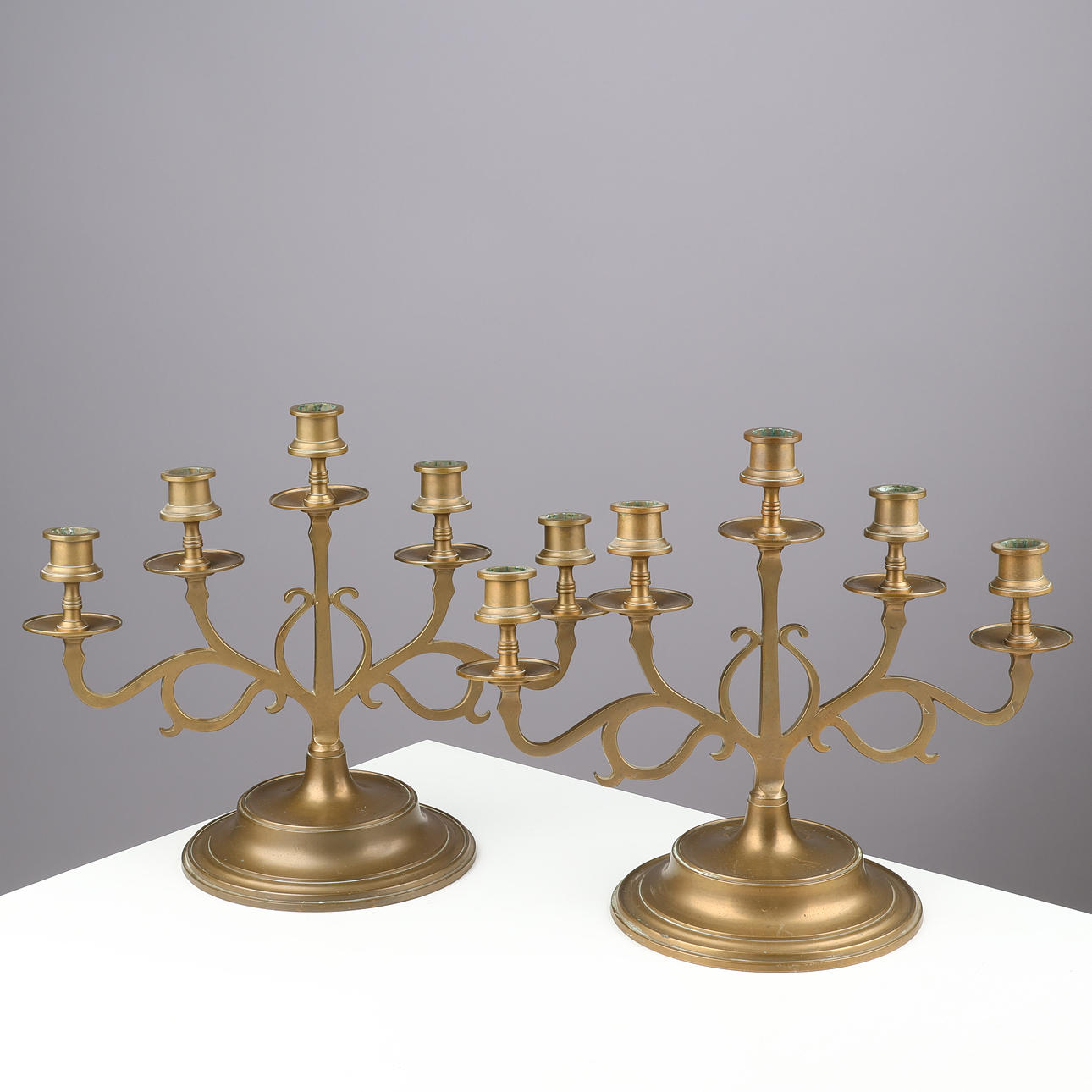 A pair of five-armed brass candlesticks on a round base.