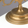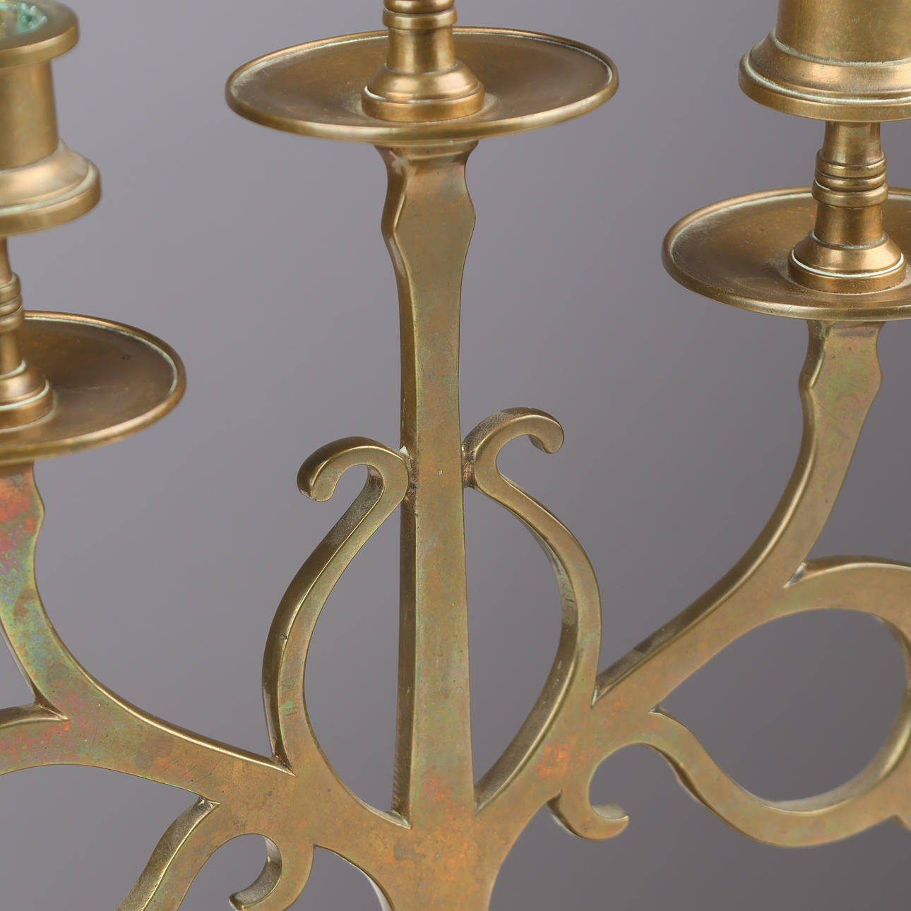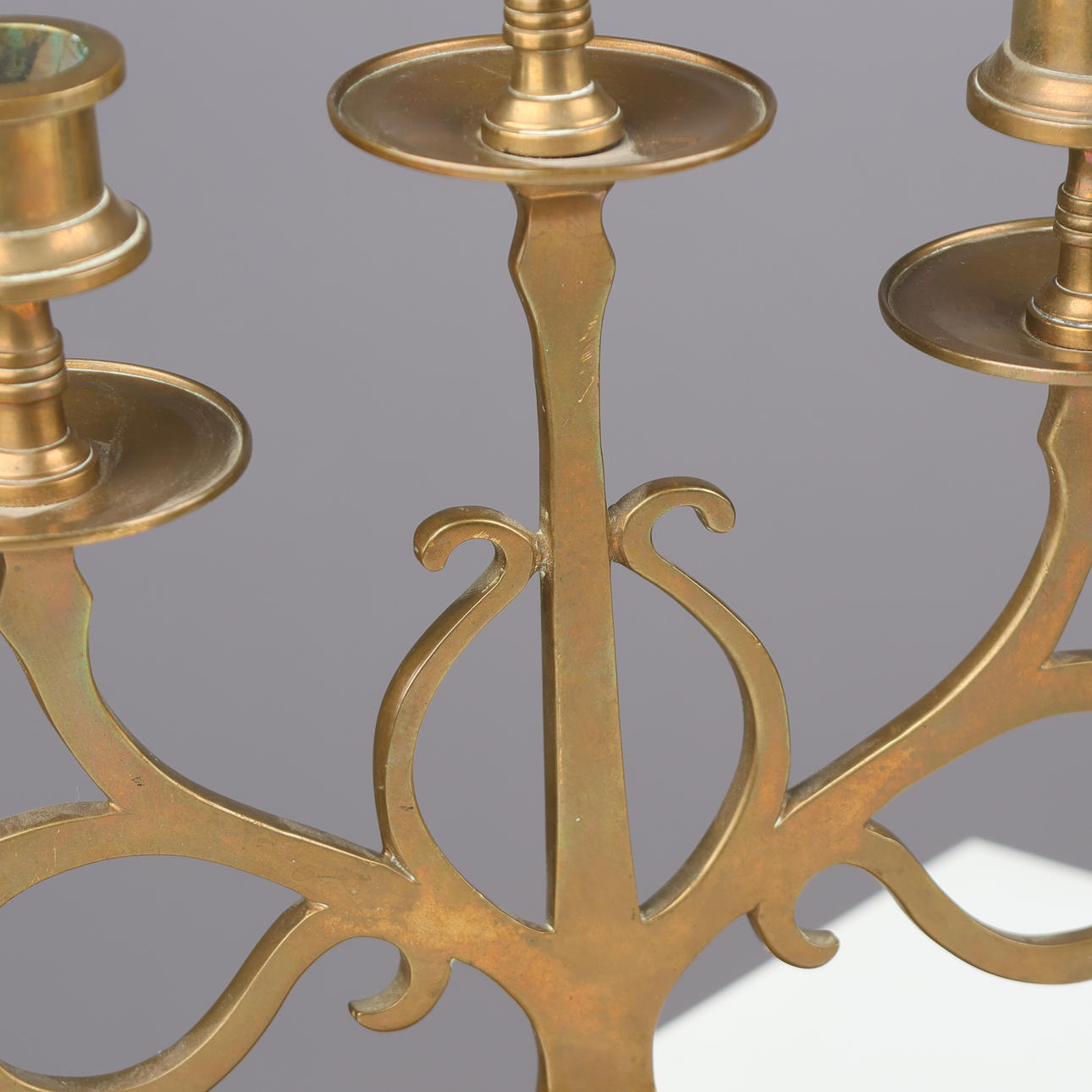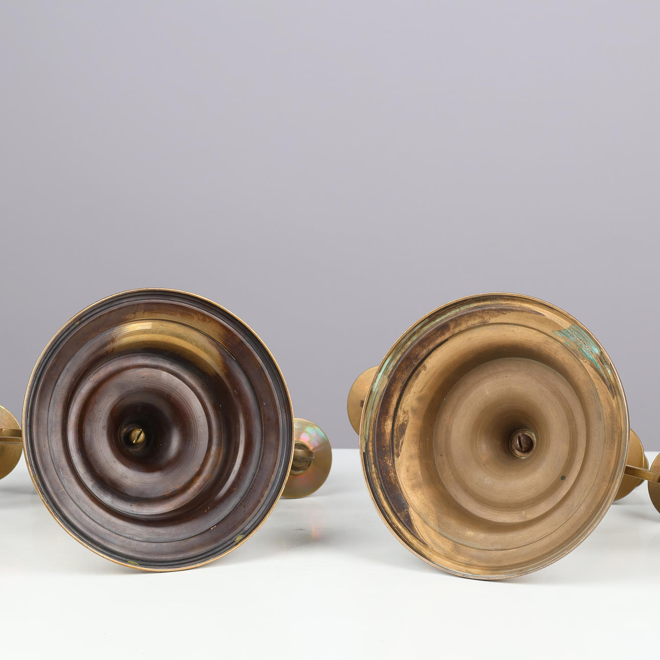A pair of five-armed brass candlesticks on a round base.