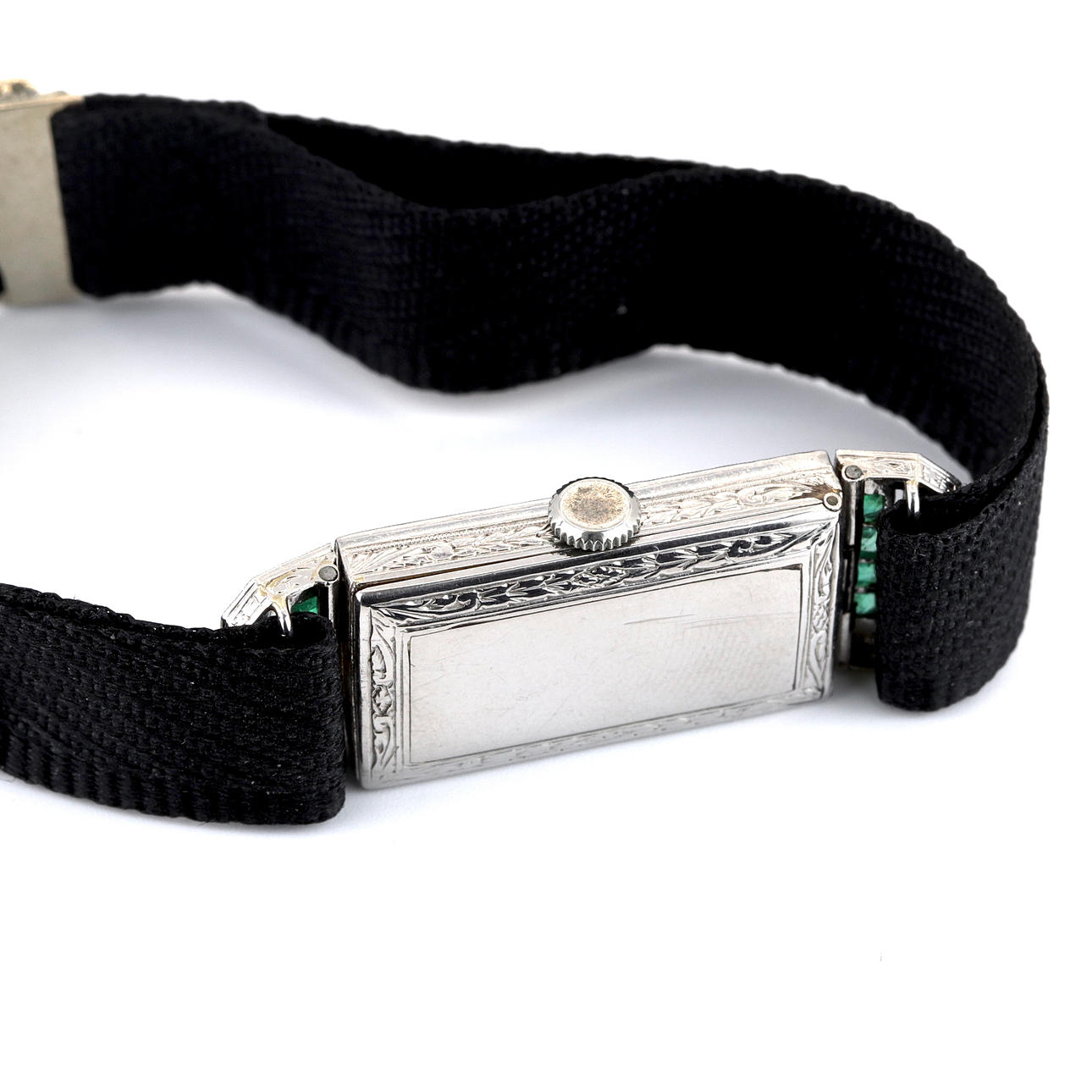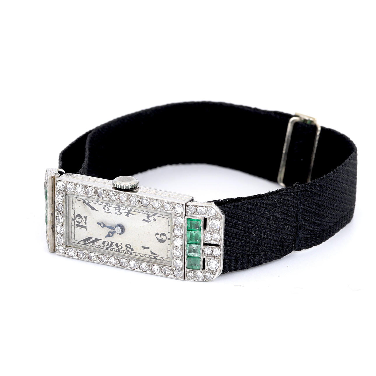 4948674. ART DECO PLATINUM DIAMOND AND EMERALD WATCH.