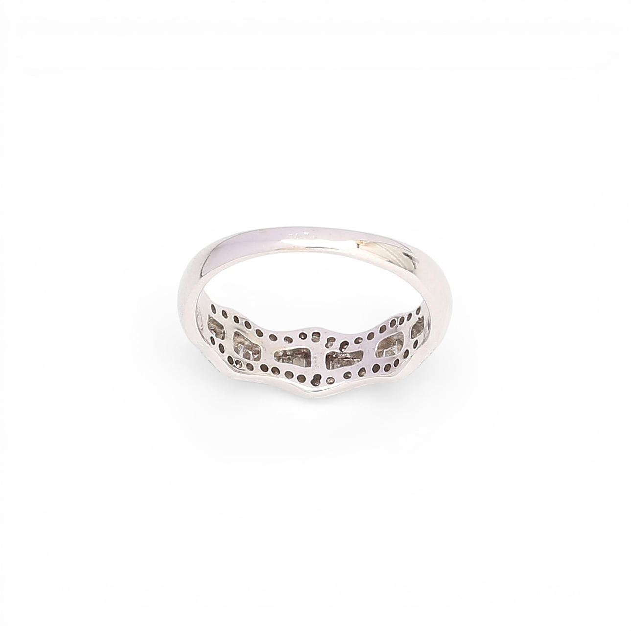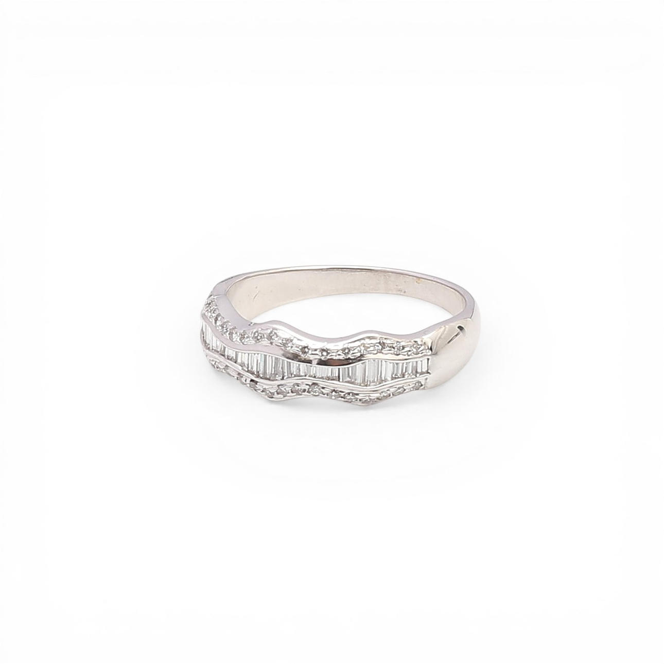 18K white gold and brilliant, baguette and trapeze cut diamonds, approx. 0.45 cts. Size 15/55. 3.4 gr.