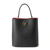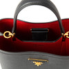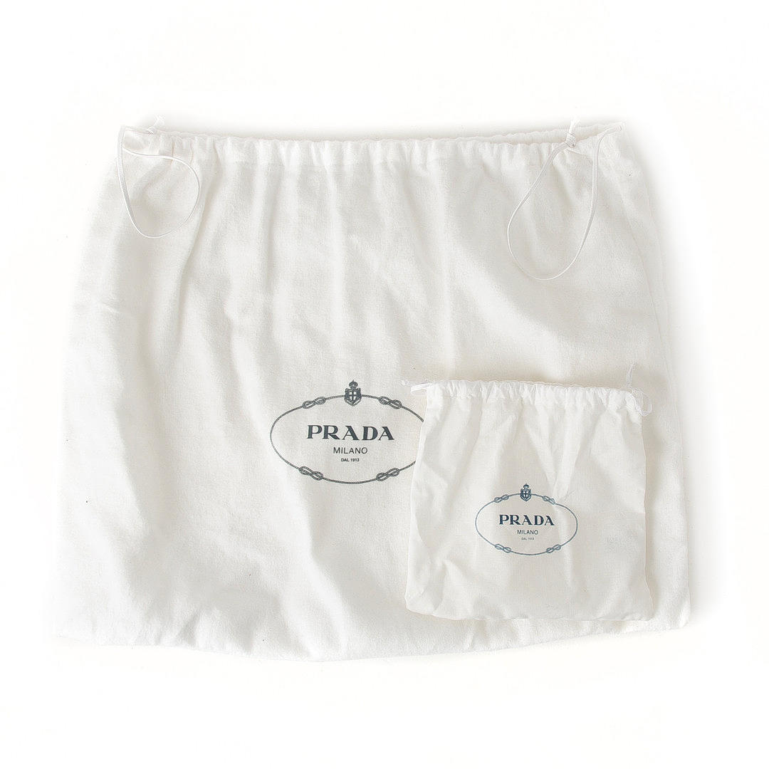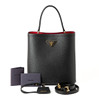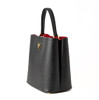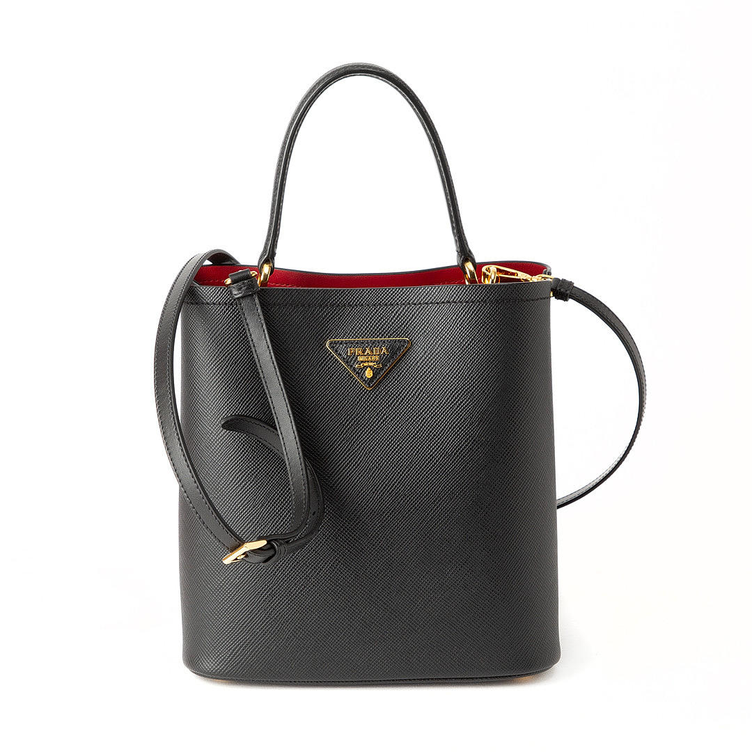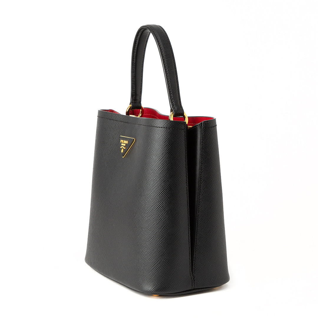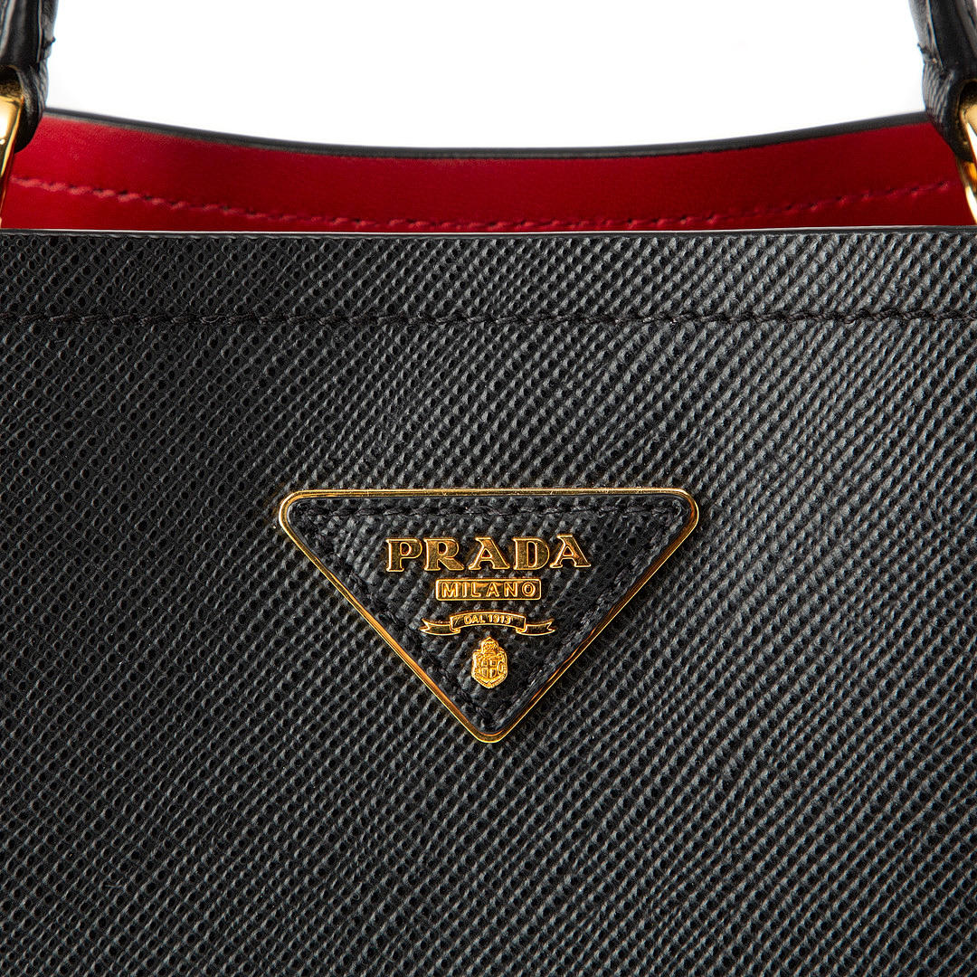 Made of saffiano leather. Black with red inside. Details of gold-colored metal. Including removable shoulder strap and travel tag.
