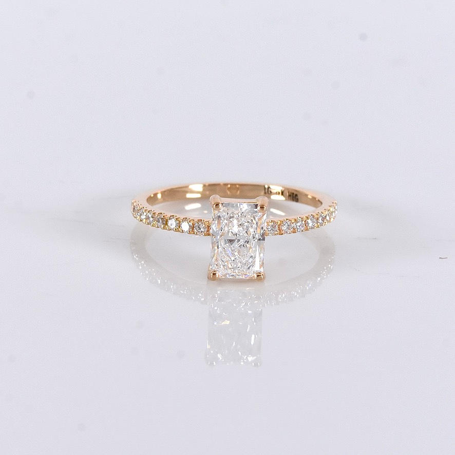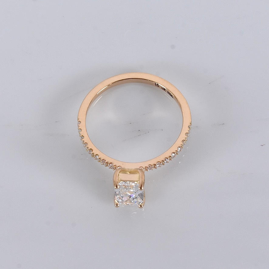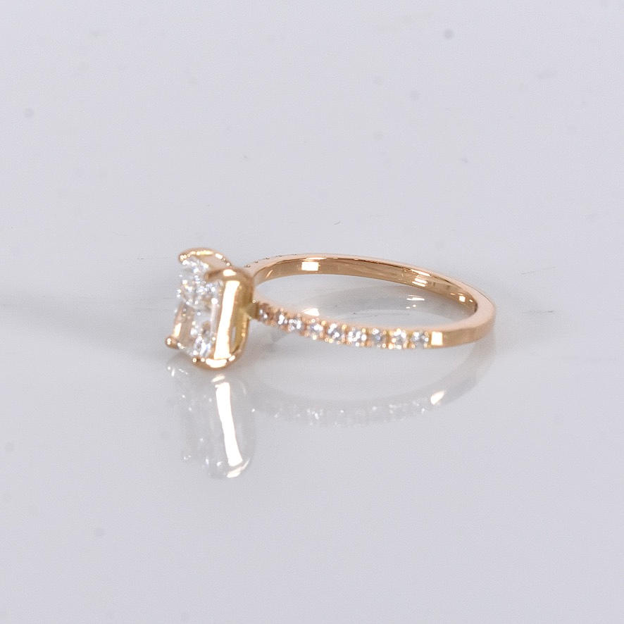 Possessed with a larger radiant-cut diamond of 1,03ct, River/VVS2 (D/VVS2) IGI Cert no. LG722542571 and smaller brilliant-cut side diamonds totalling 0.18ct in matching quality