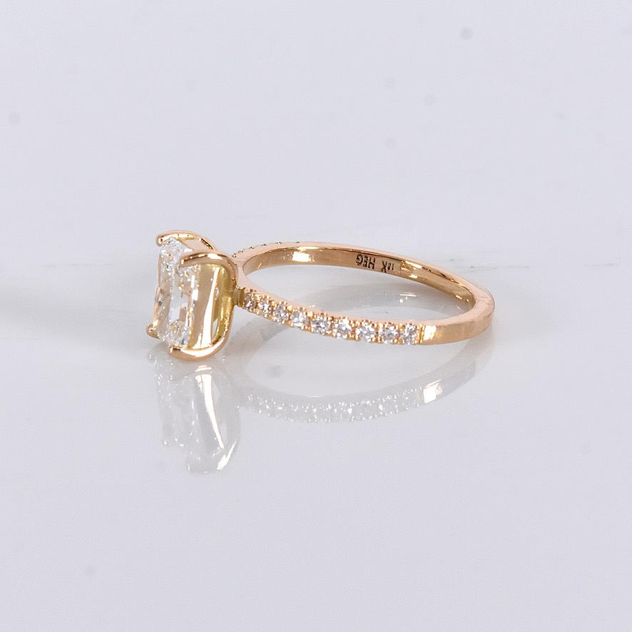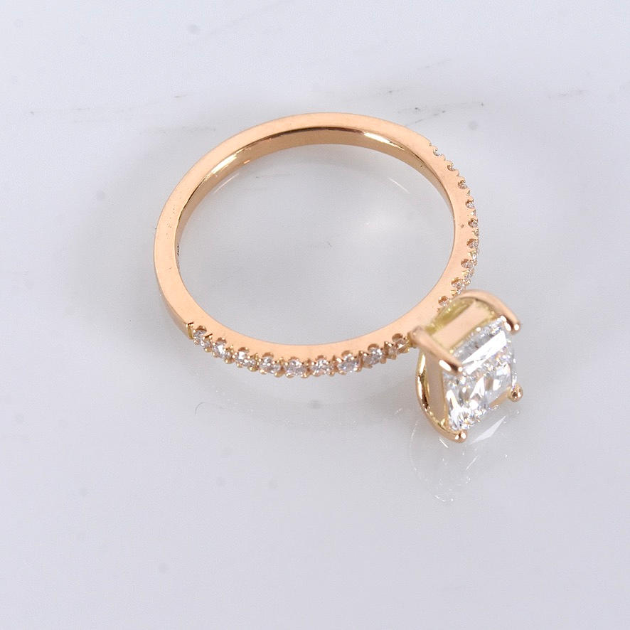 Possessed with a larger radiant-cut diamond of 1,03ct, River/VVS2 (D/VVS2) IGI Cert no. LG713564907 as well as smaller brilliant cut side diamonds totalling 0.18ct in matching quality