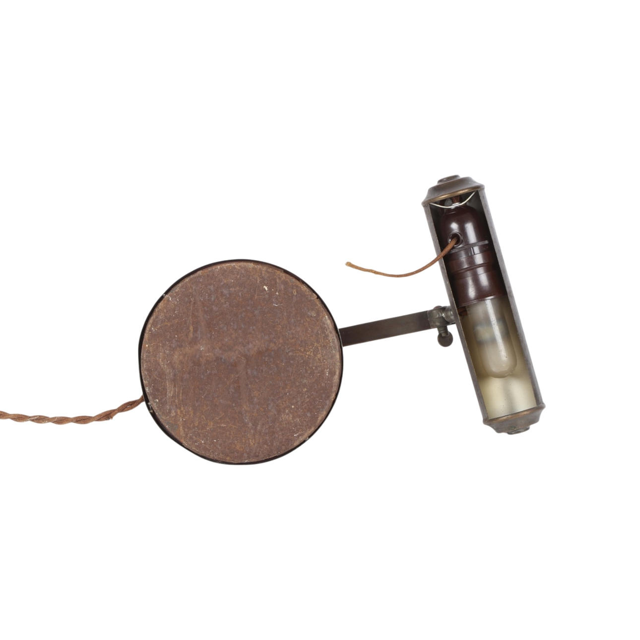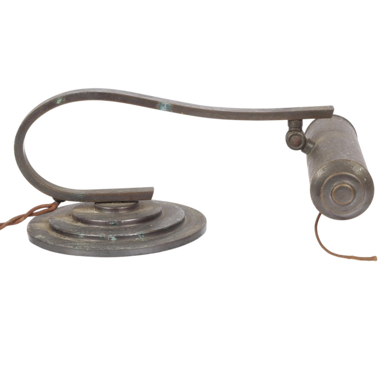Art deco piano lamp in green patinated with curved stem, adjustable screen with string switch. Finished on weighted, profiled footboard. Probably made at Lyfa or Fog & Mørup, 1920s. H. 14.5, L. 31, B. 22 cm.