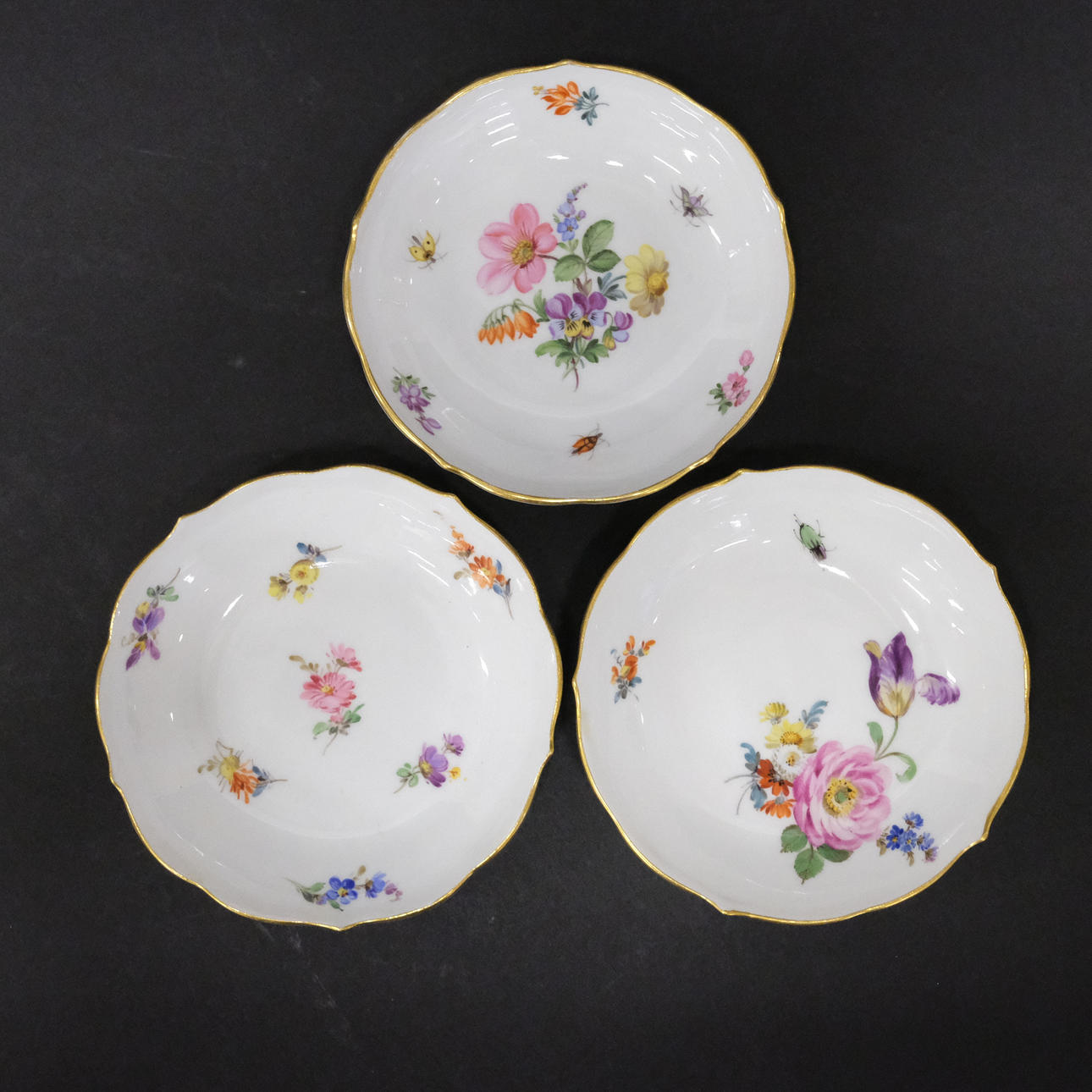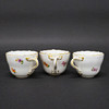 Partially gilded and floral decor. Three cups, height 5cm, diameter 6,5cm. Three barrels, diameter 10,7cm. 1st sorting.