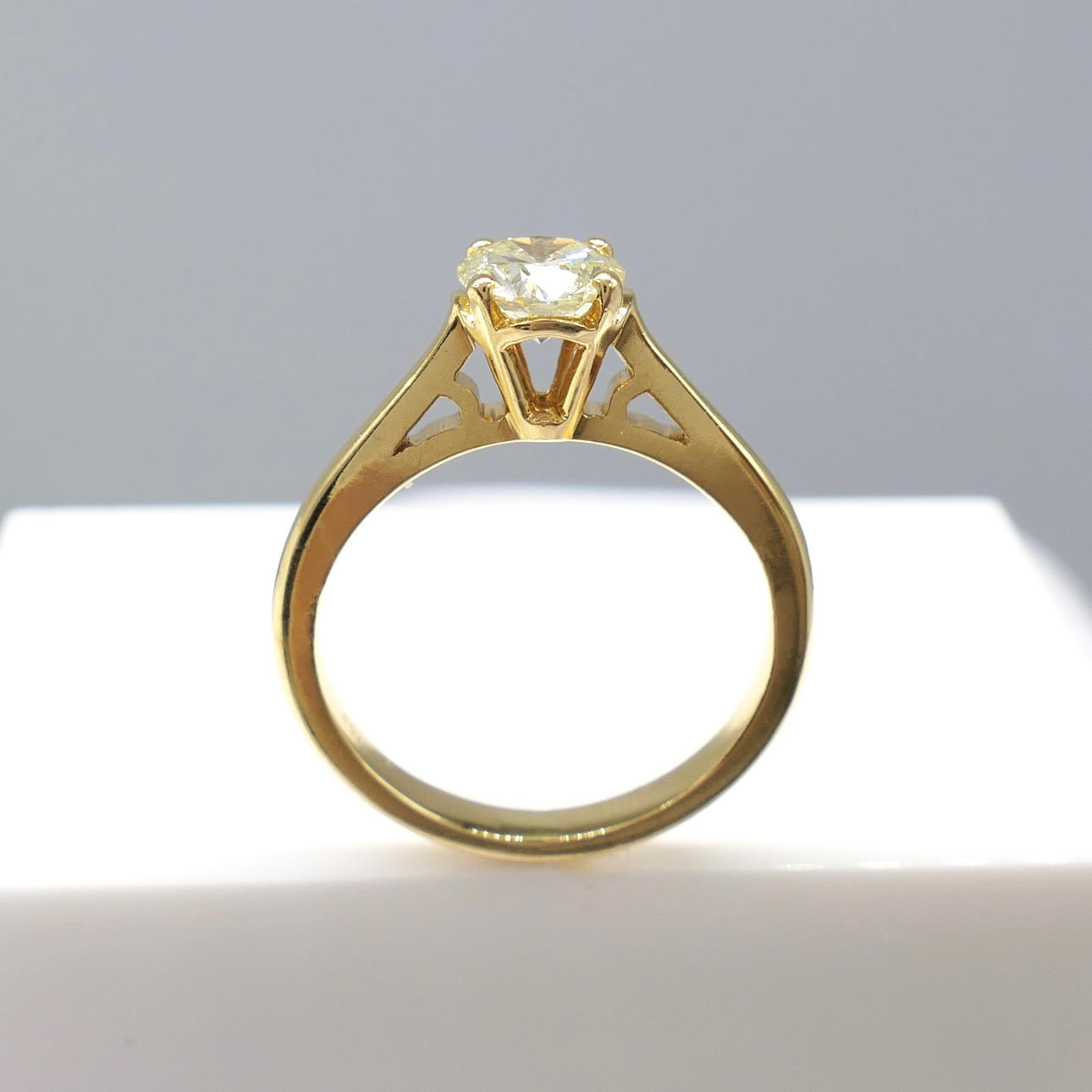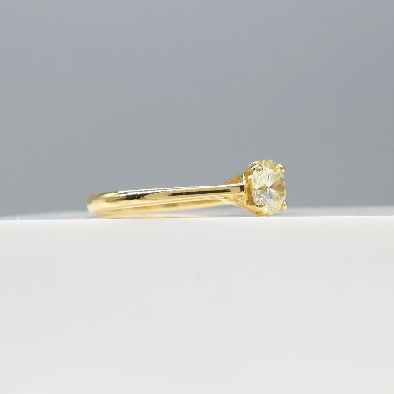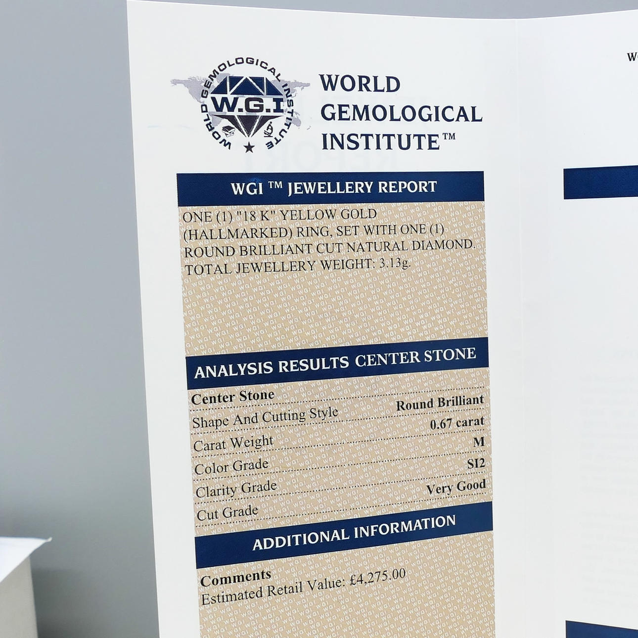 An 18k yellow gold solitaire ring 4-claw set with a 0.67ct round brilliant-cut diamond. Supplied with a World Gemological Institute certificate and gift box.