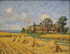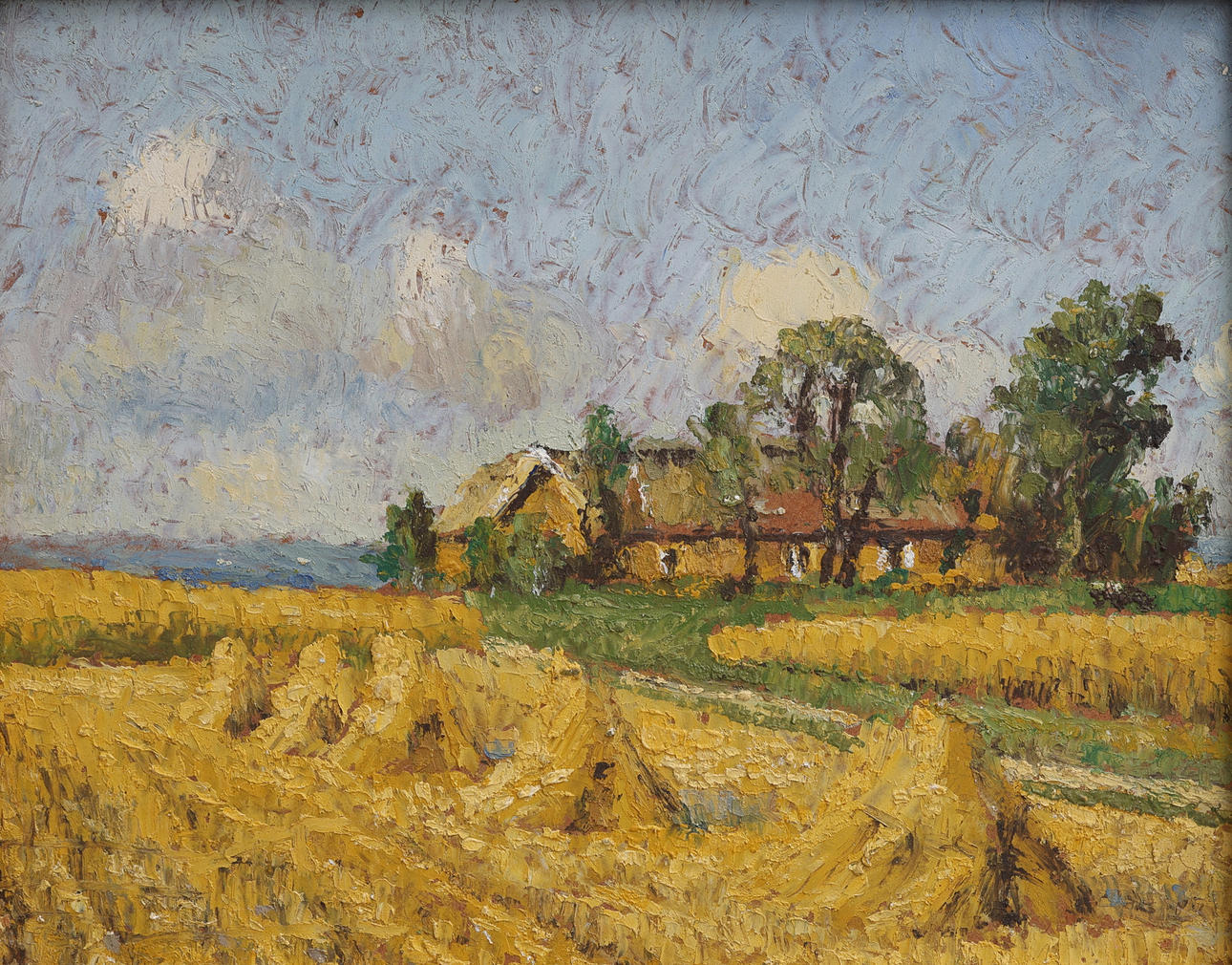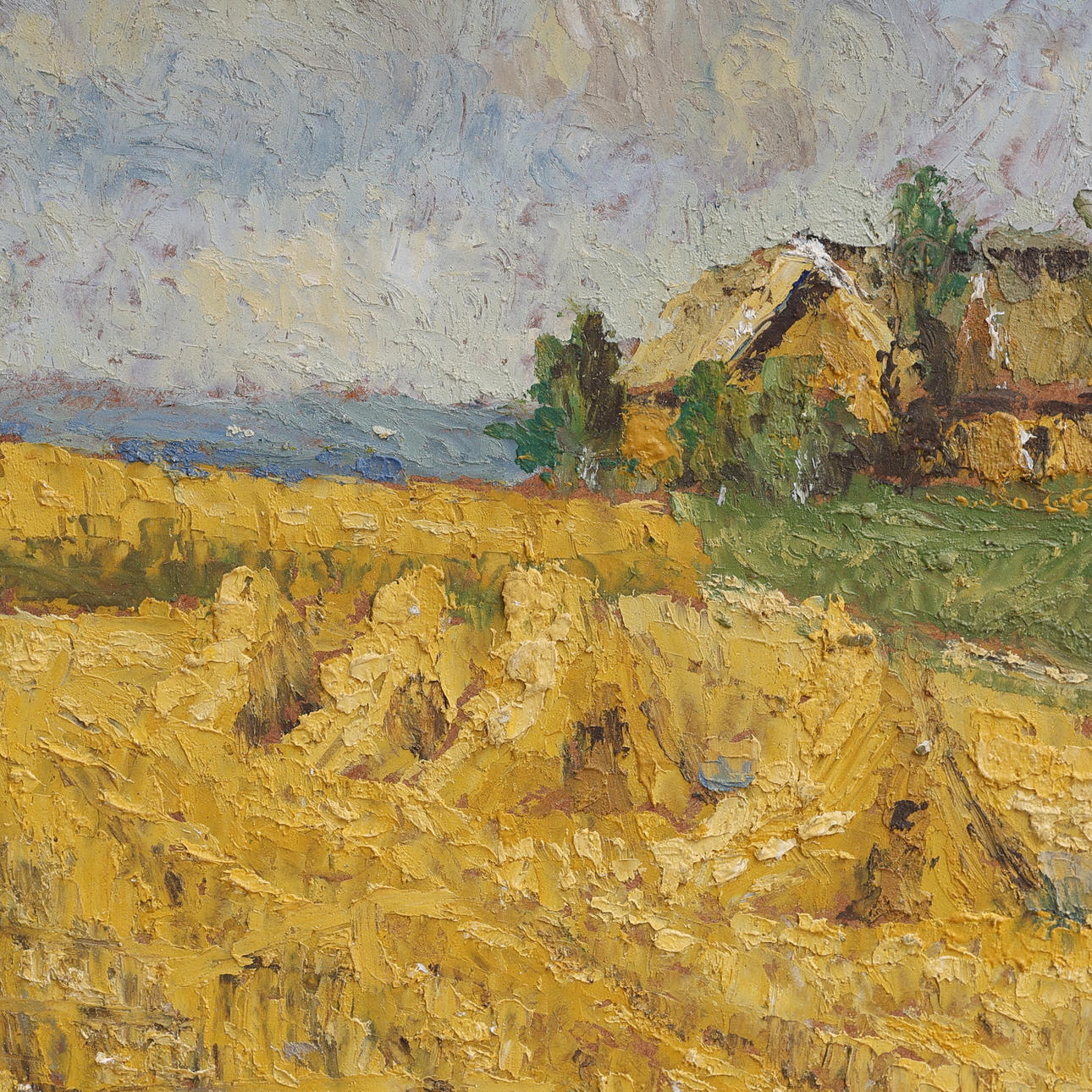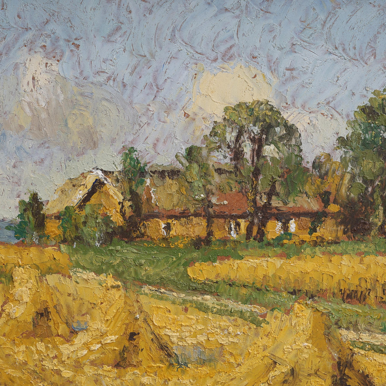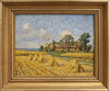 OIDENTIFIERAD KONSTNÄR. OIL ON PANEL, HOUSES ALONG FIELDS.