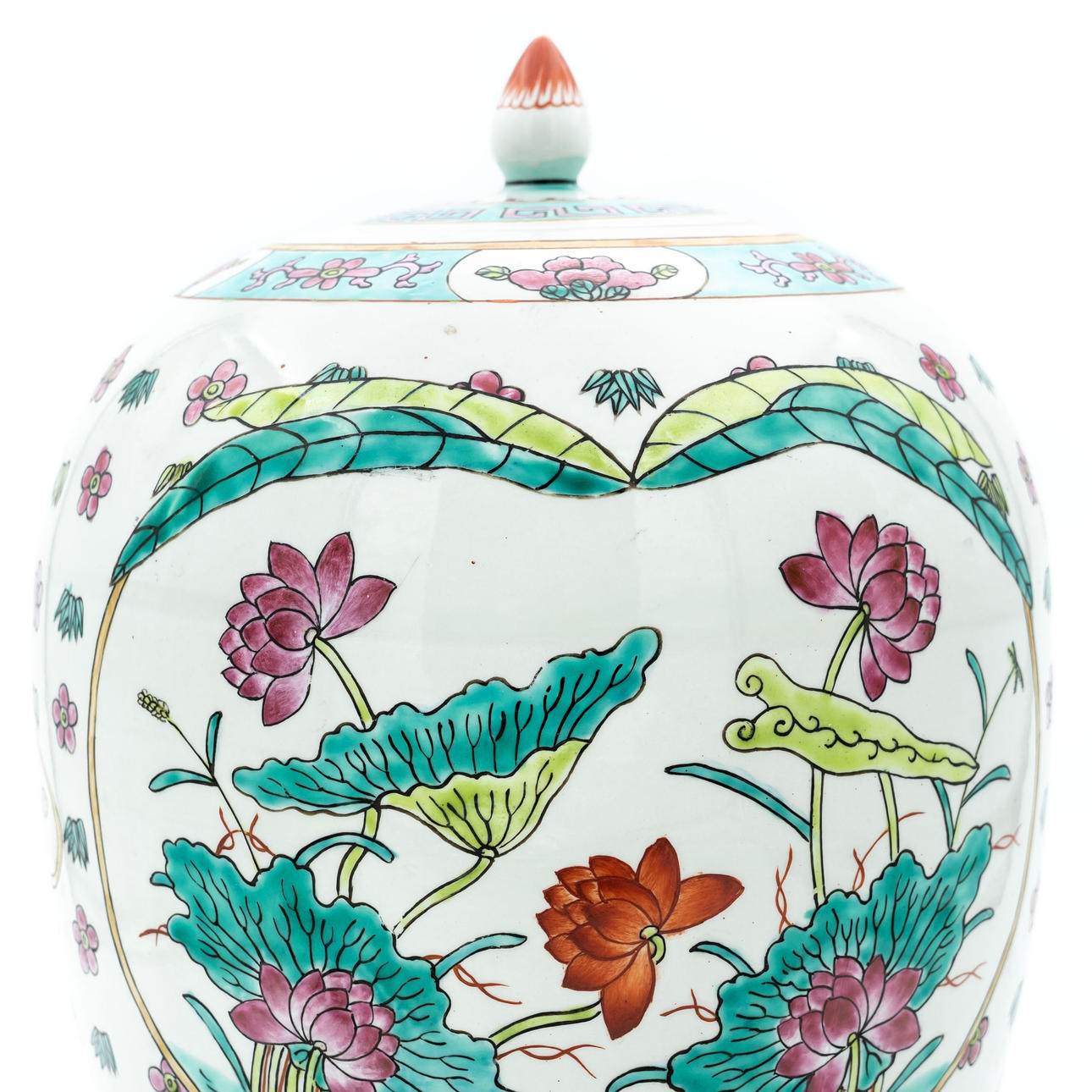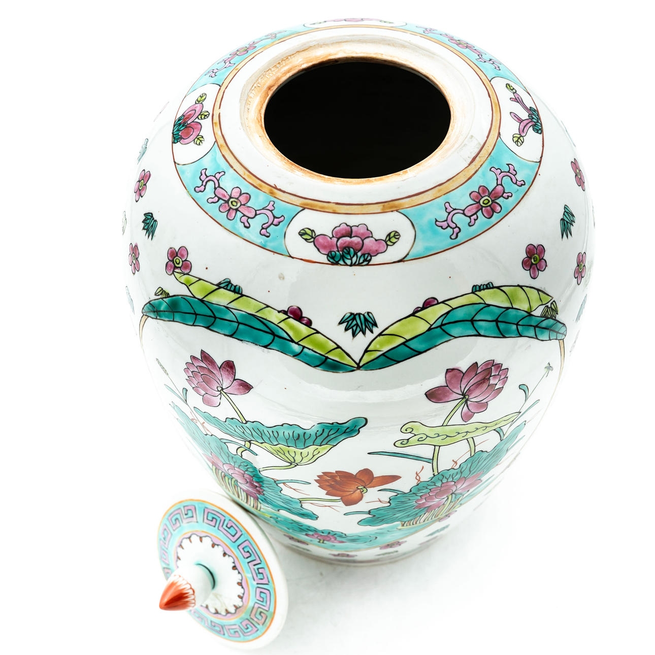 Chinese urn made of porcelain with hand-painted decor.
