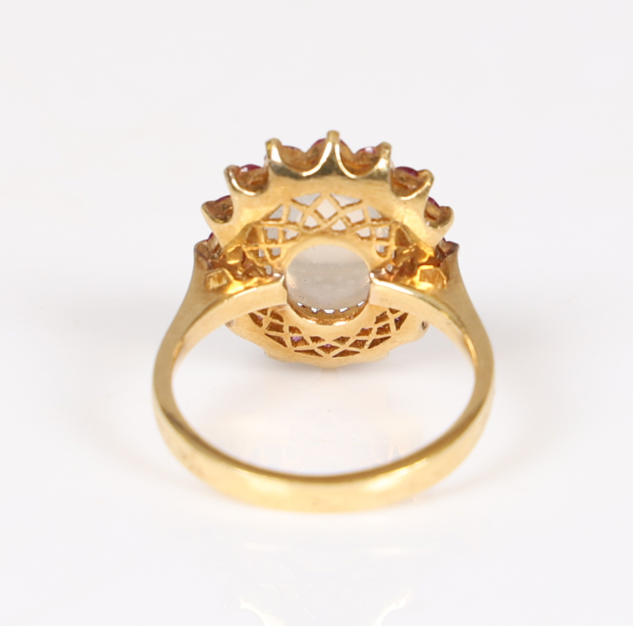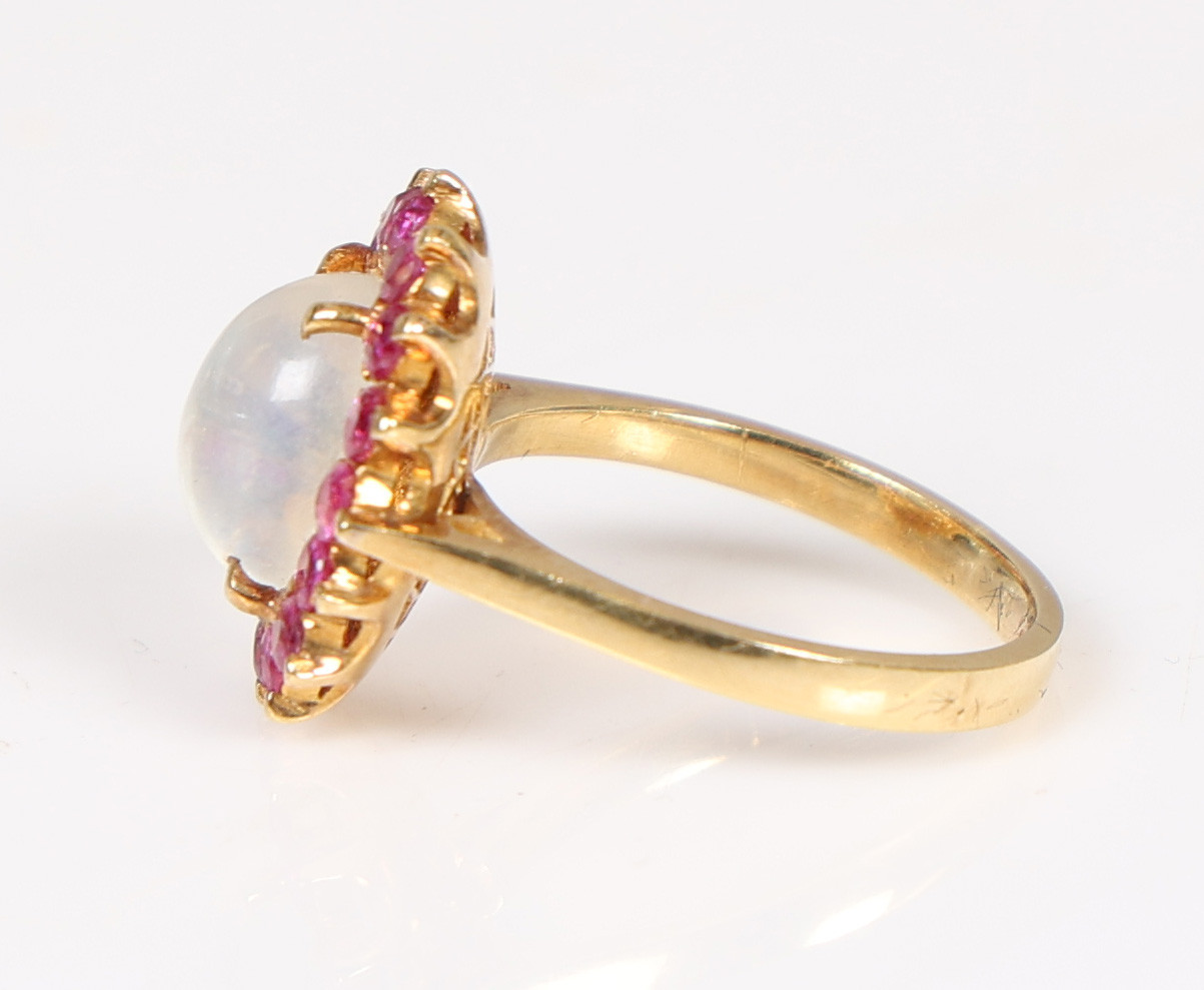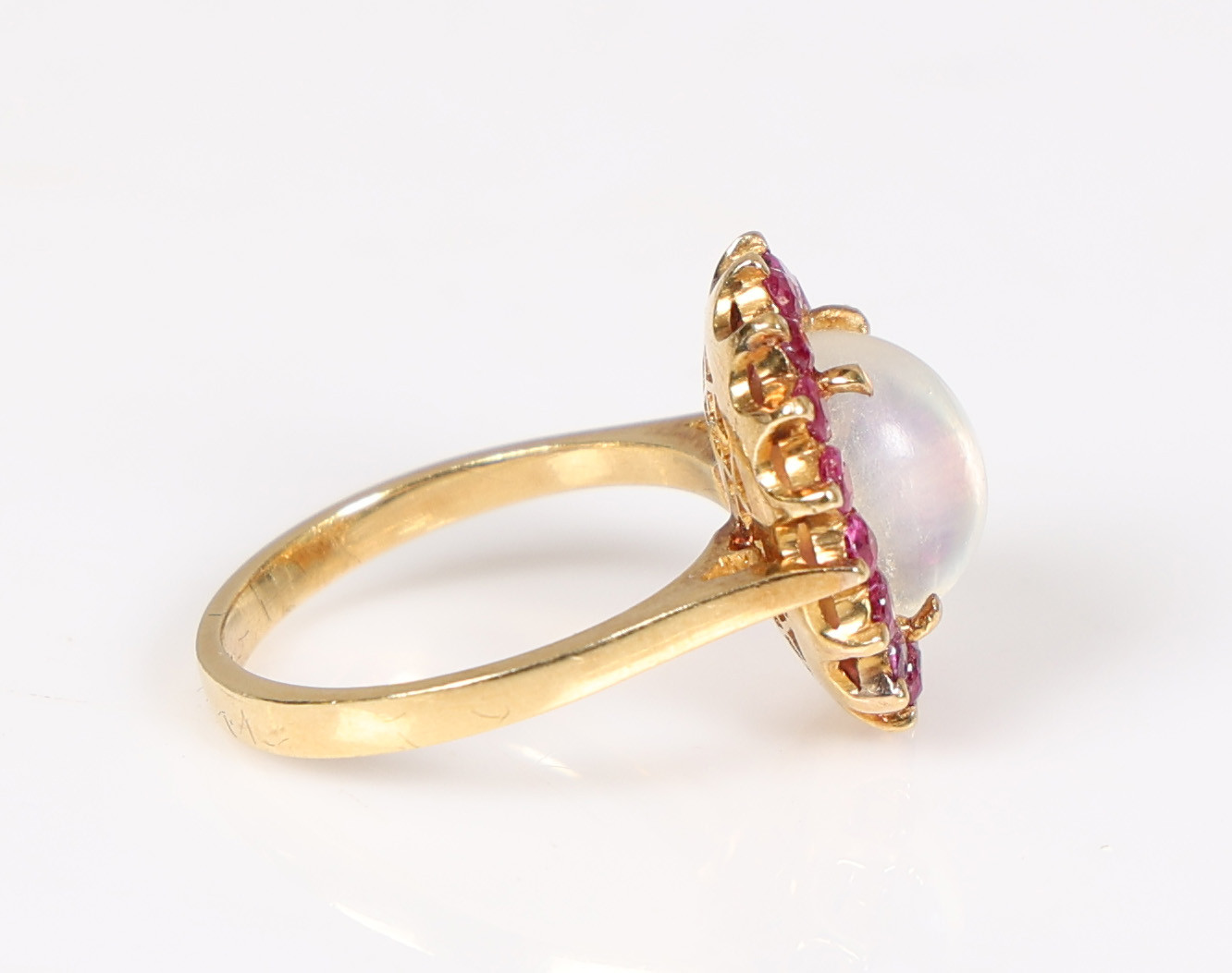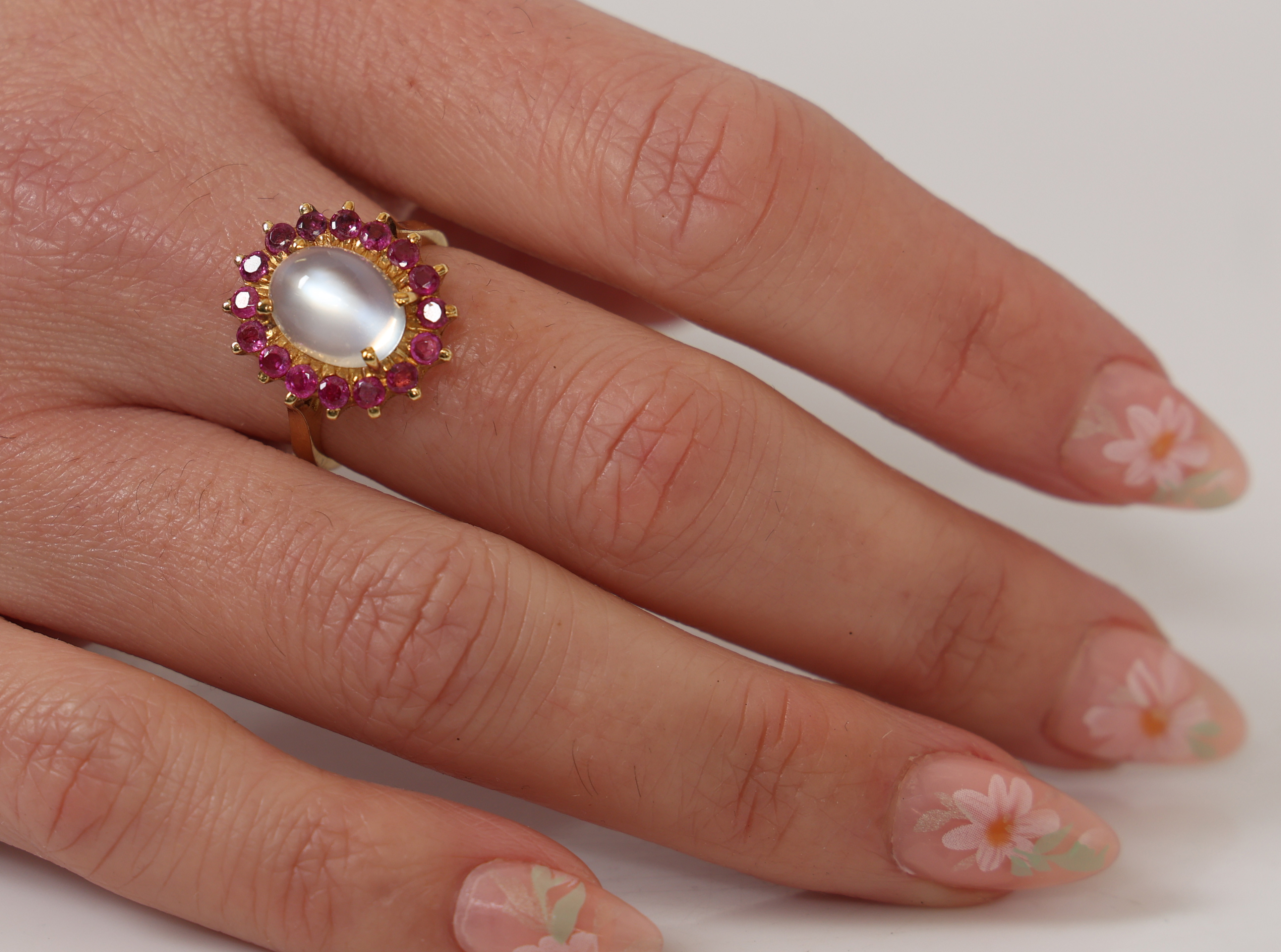 27. 4951782. MOONSTONE & RUBY CLUSTER RING.
