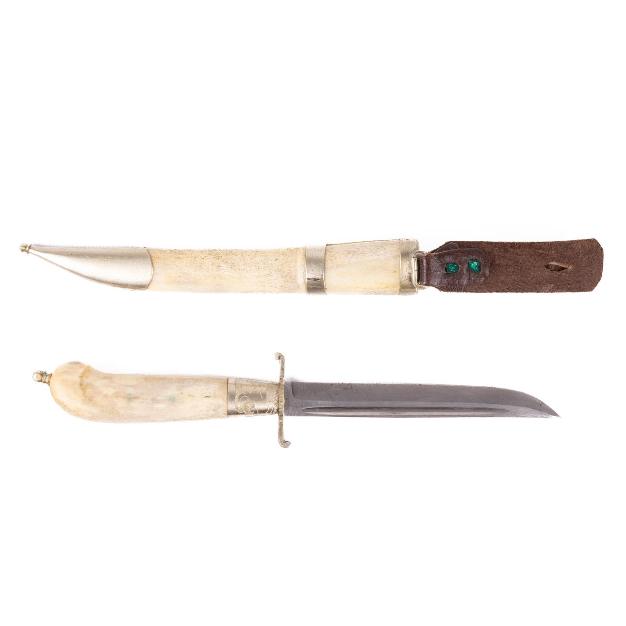 Shank in bone/horn with fittings in nickel silver, sheath in legs/horns with fittings in nickel silver. Pouring in leather. Length knife 26 cm.