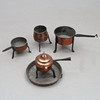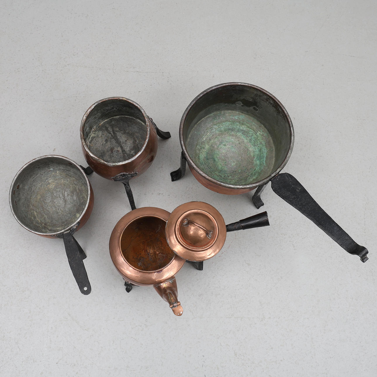 A Collection of copper objects consisting of three pieces of kettles, a mold and a coffee pot with a lid. Height about 5.5-28 cm.