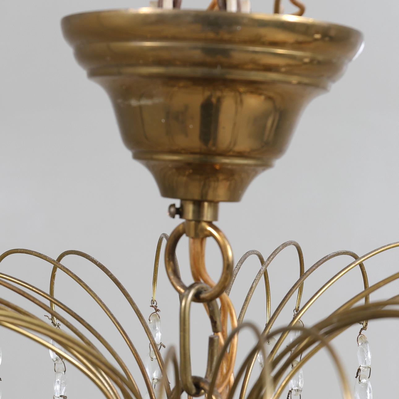 Frame made of brass. Hinged with prisms. Six light arms with loose glass cuffs. Eight points of light.