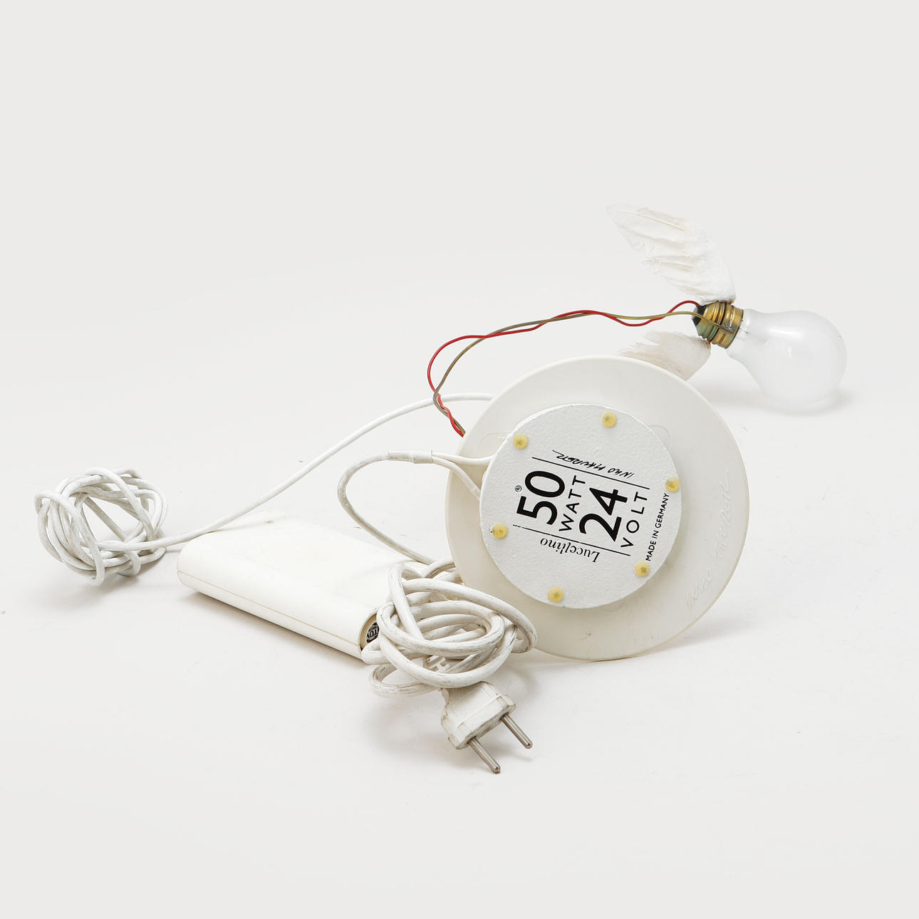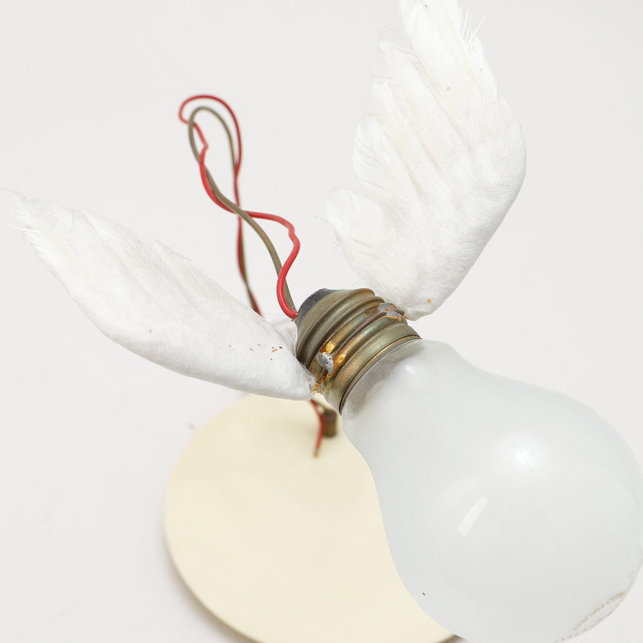 Feet in metal and plastic, Manure lamp on metal wire with feathers in the form of wings. Height approx. 33 cm.