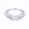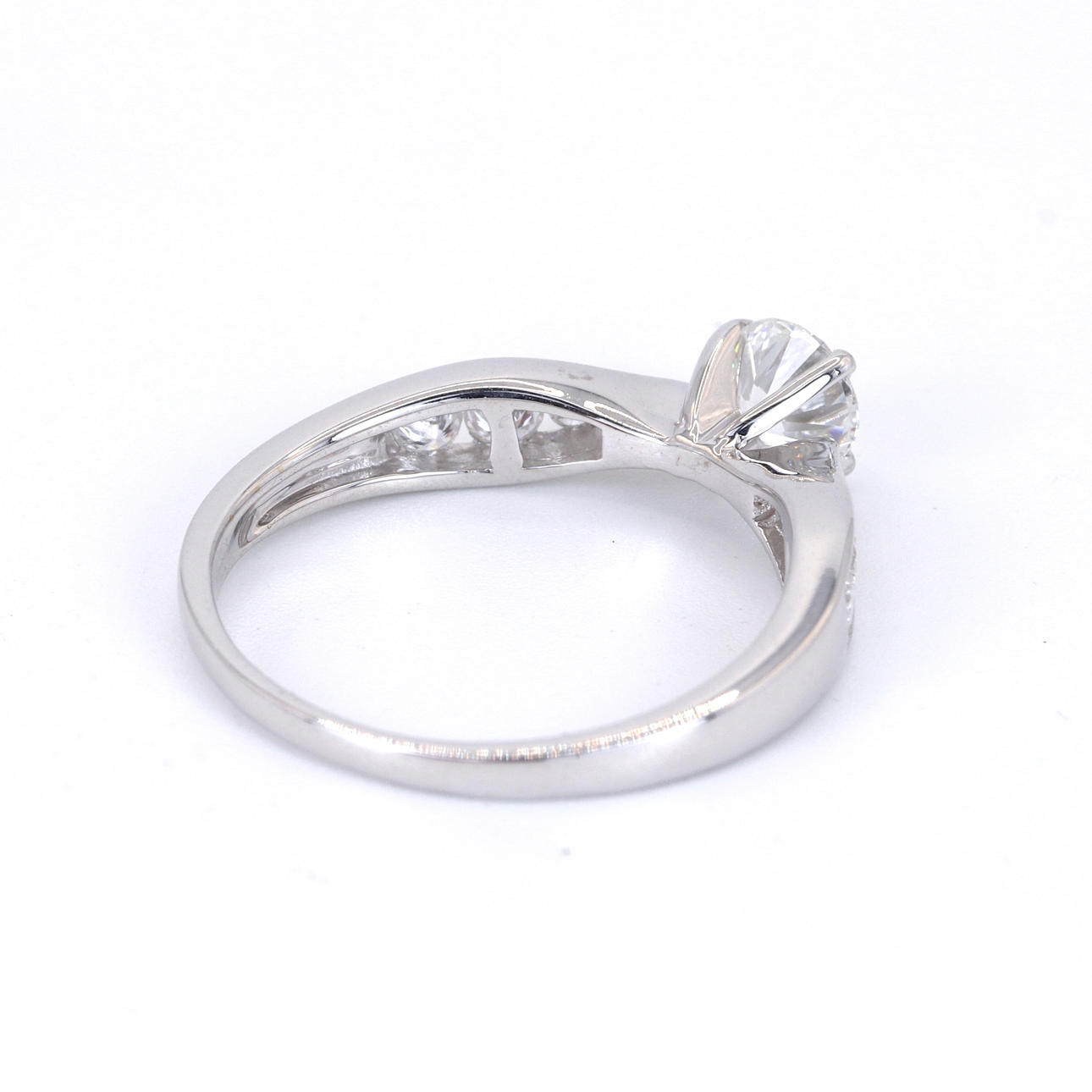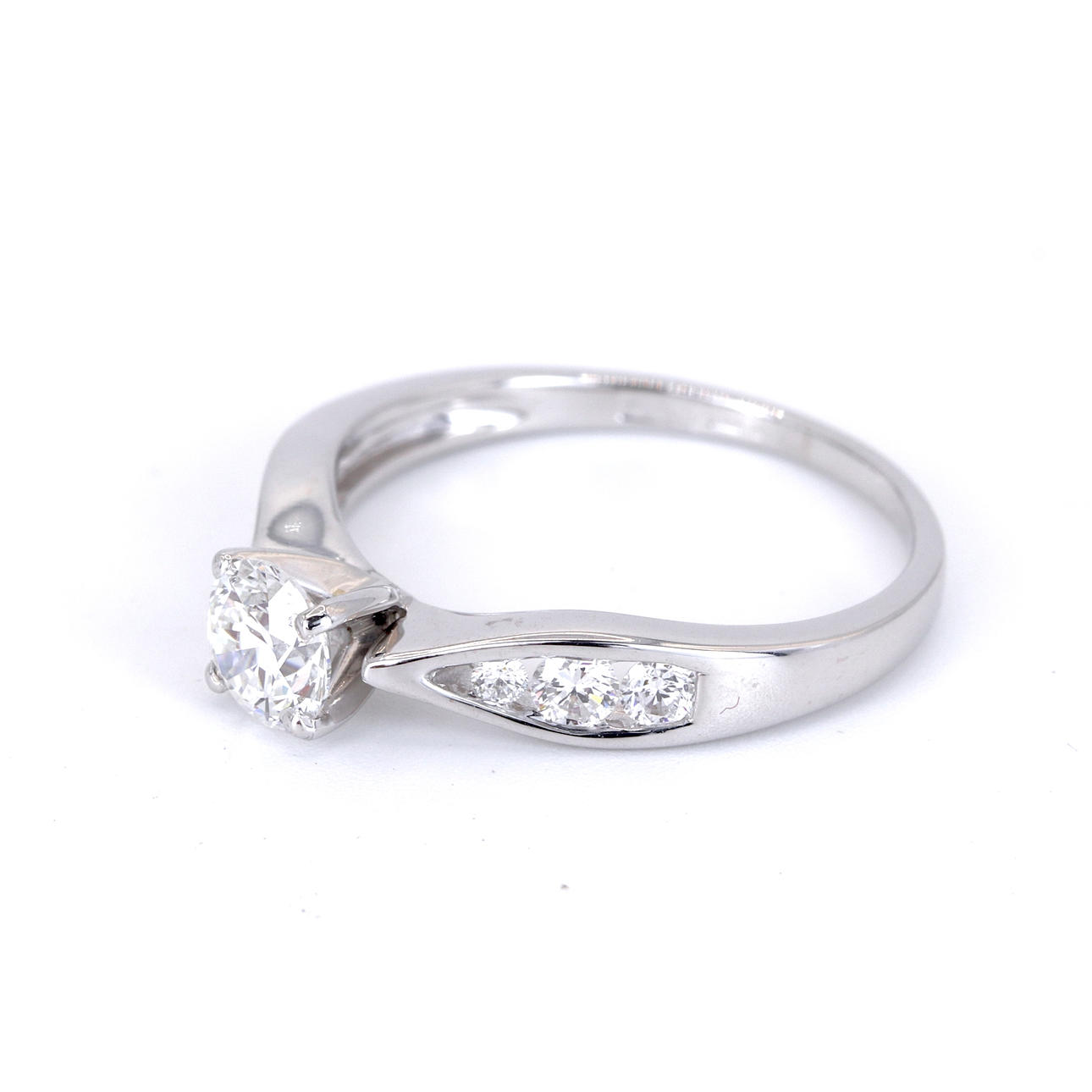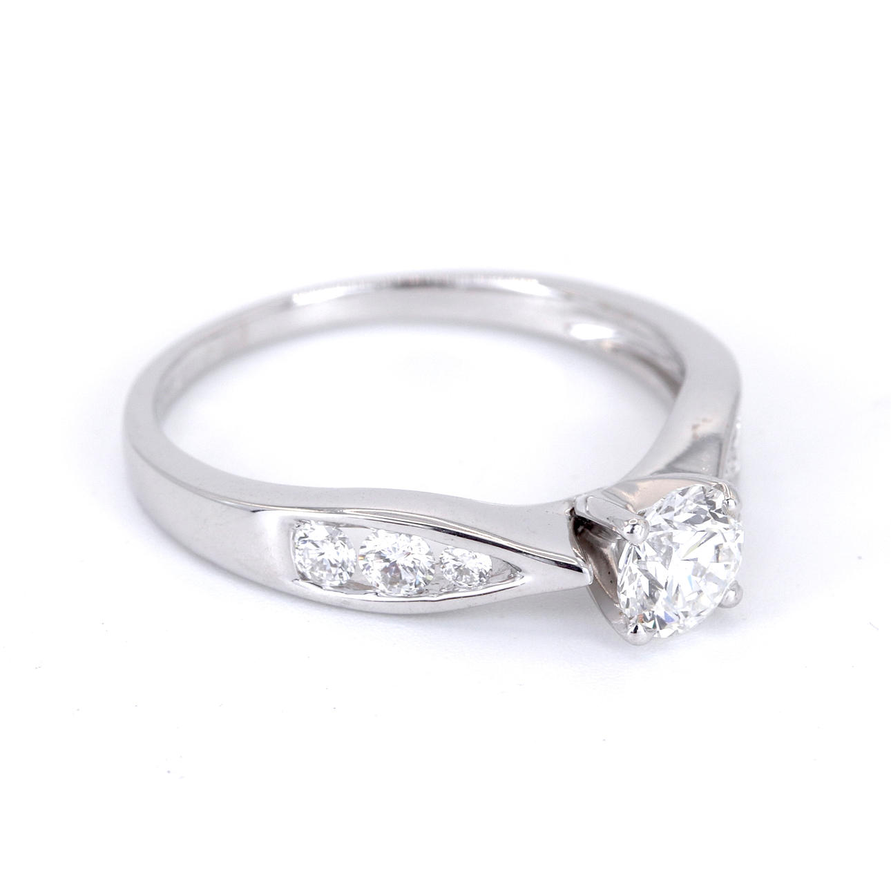 Diamonds: Centre: 0.50ct. Sides: 0.12ct Total: 0.62ct approx. Colour: G-H. Clarity: VS-SI.