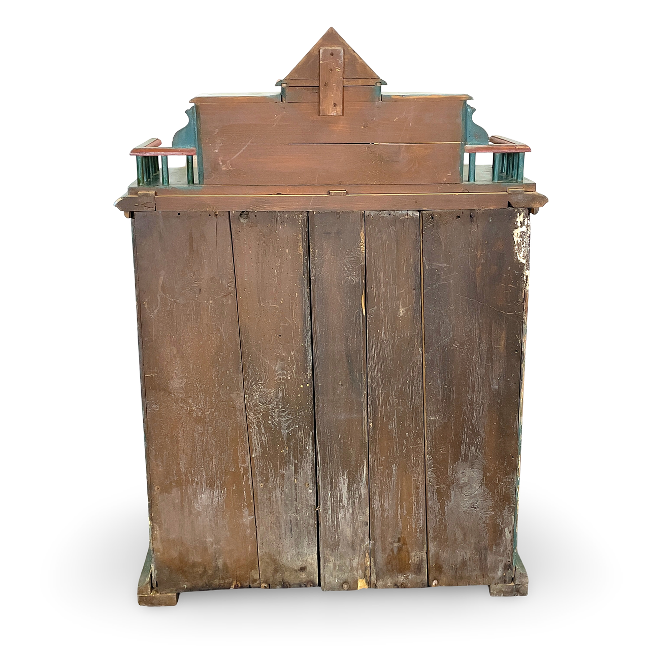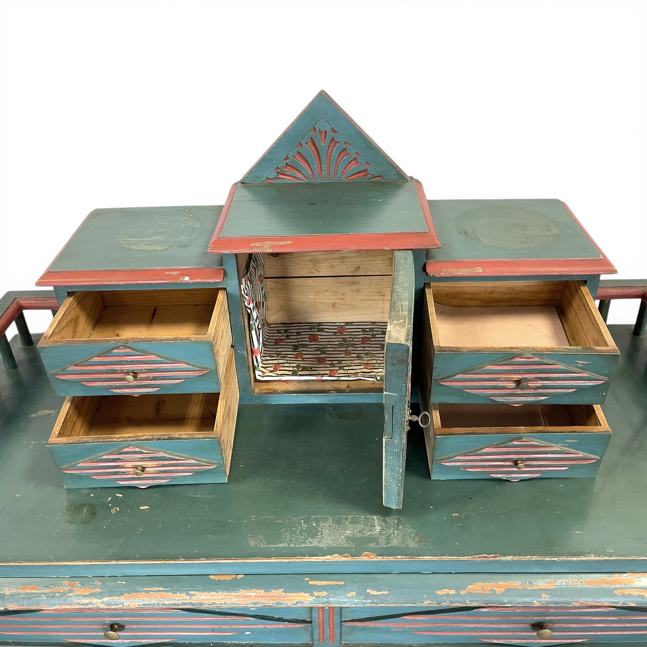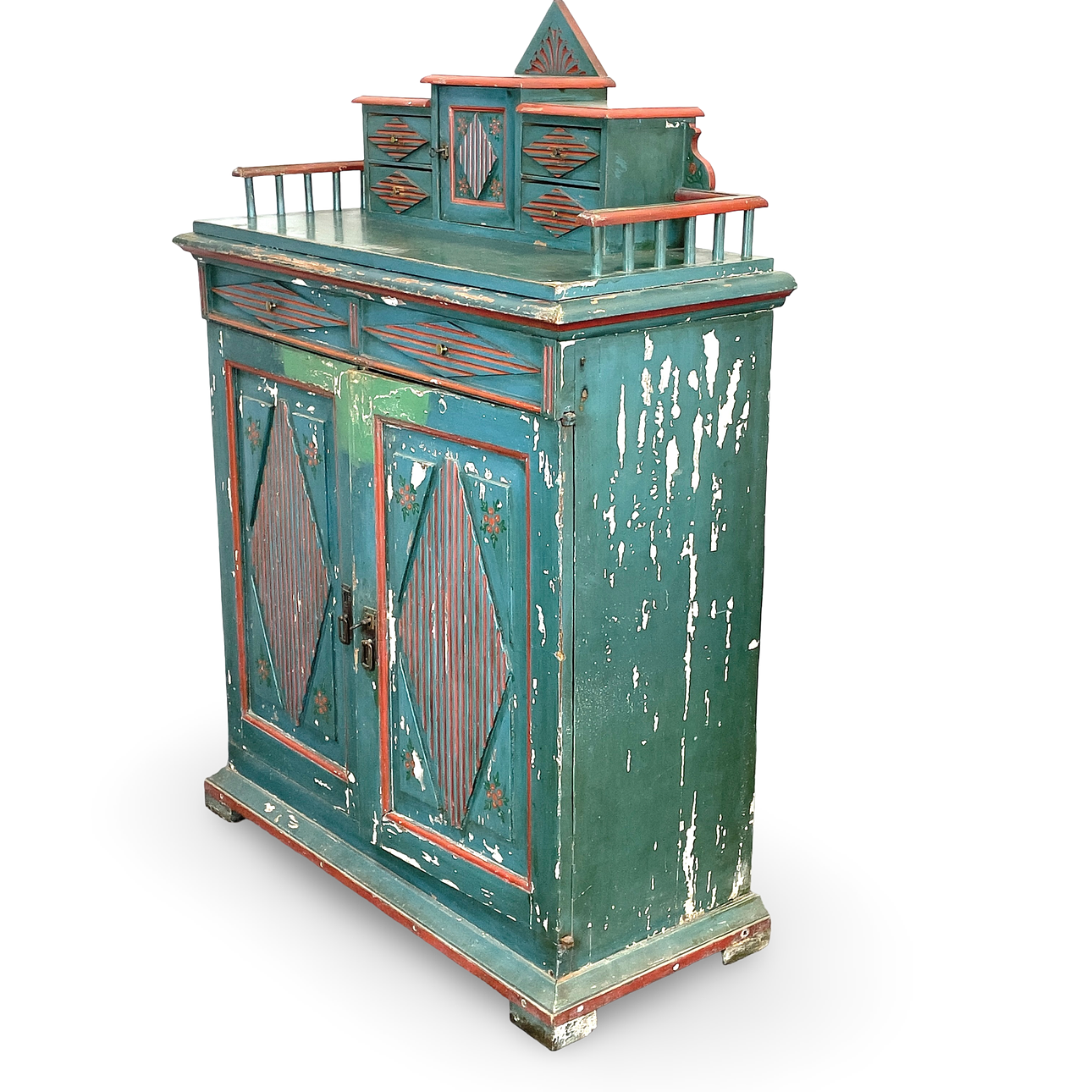 Cabinet with essay, painted, essay with drawers, lower part with doors and drawers, back shelf, doors and drawers with rhombuses, height ca 143 cm, width approx. 102 cm, depth approx. 45 cm.