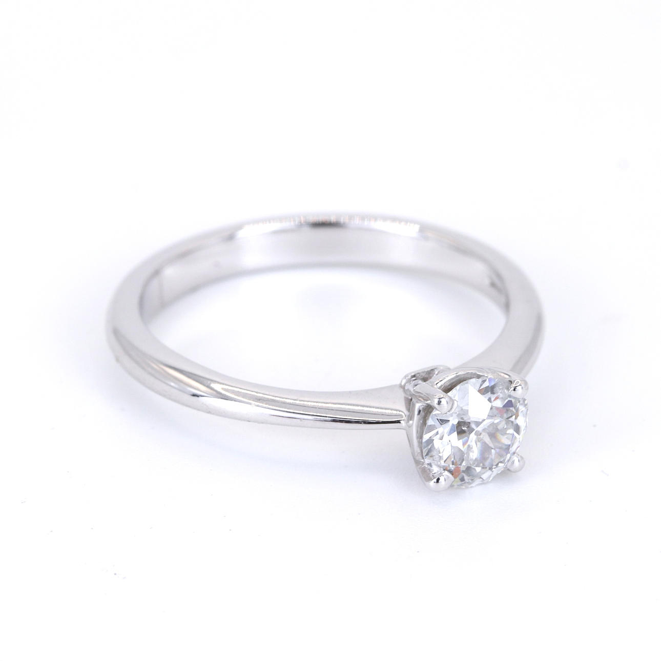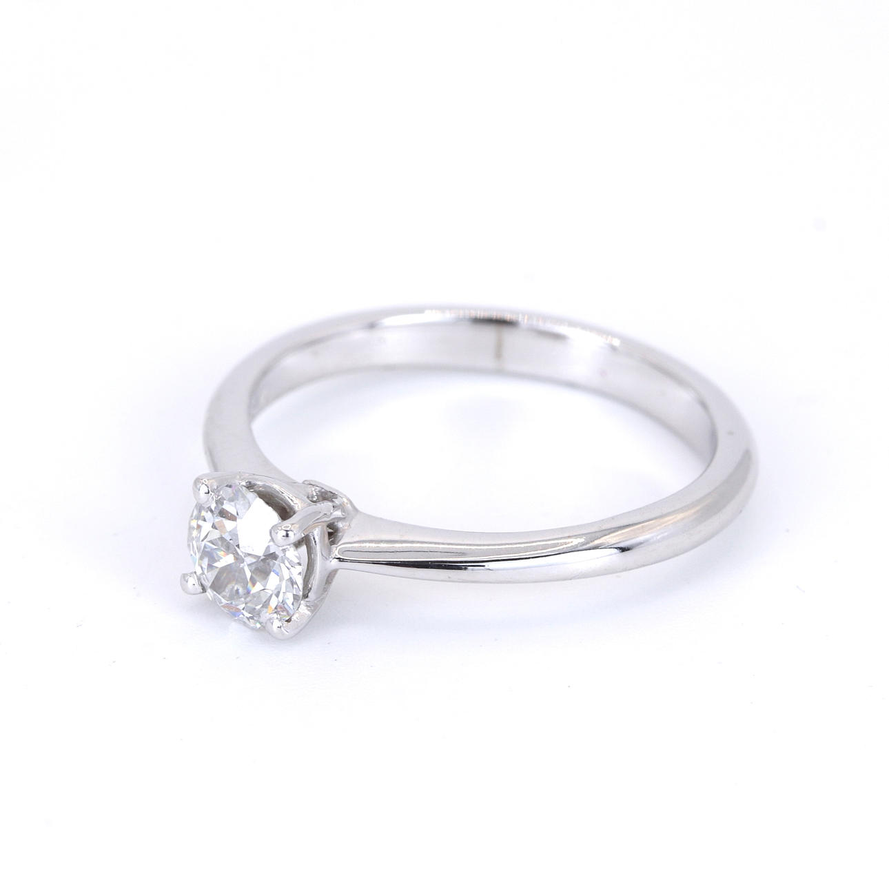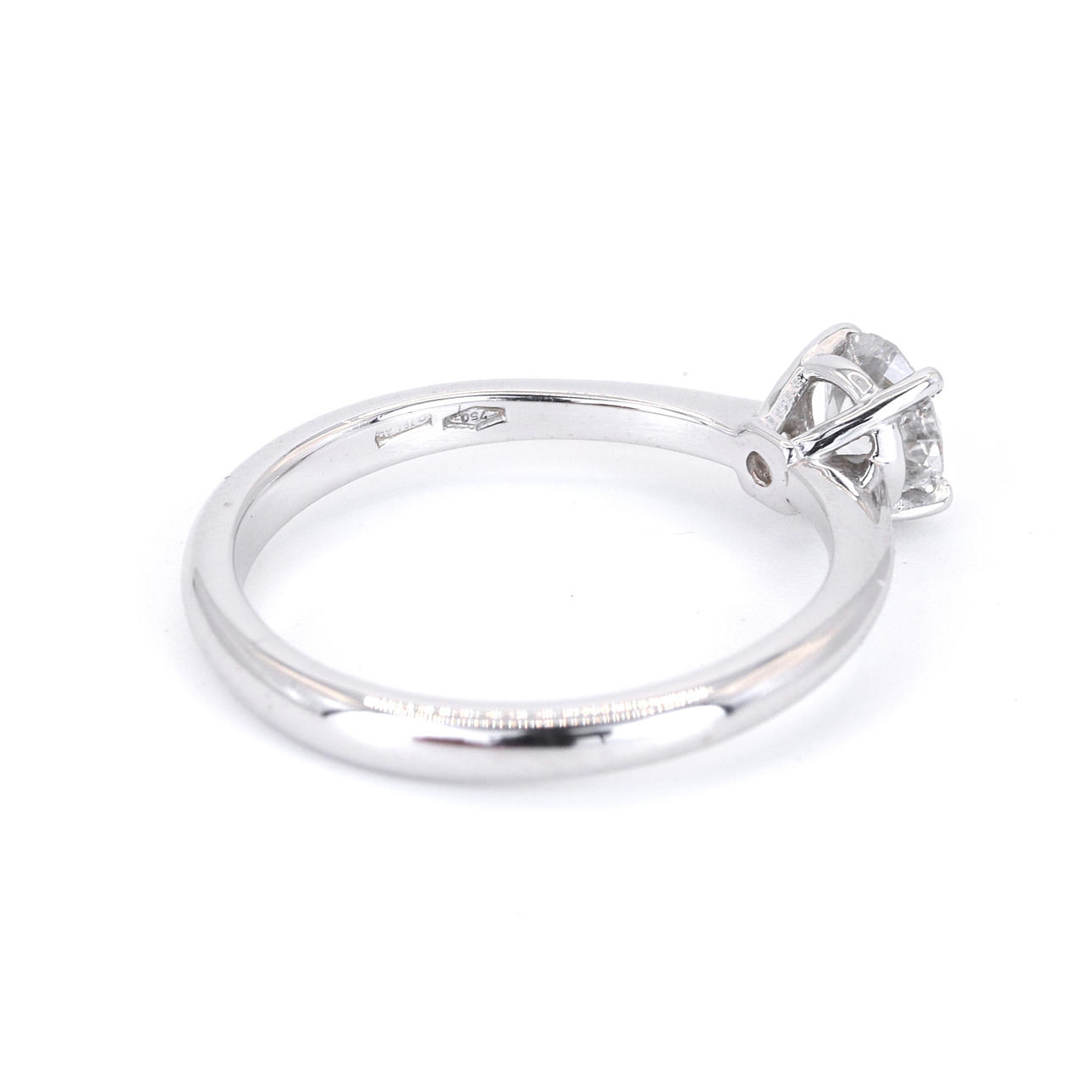 An 18ct white gold solitaire ring set with round brilliant cut diamond. Dia. 0.56ct . Colour: H. Clarity: SI.