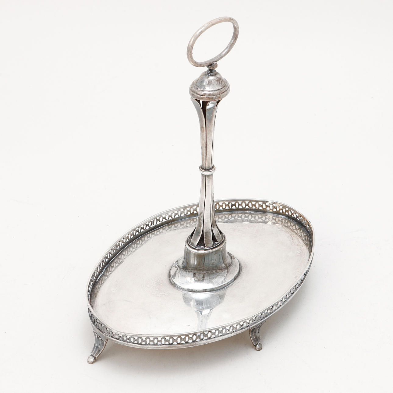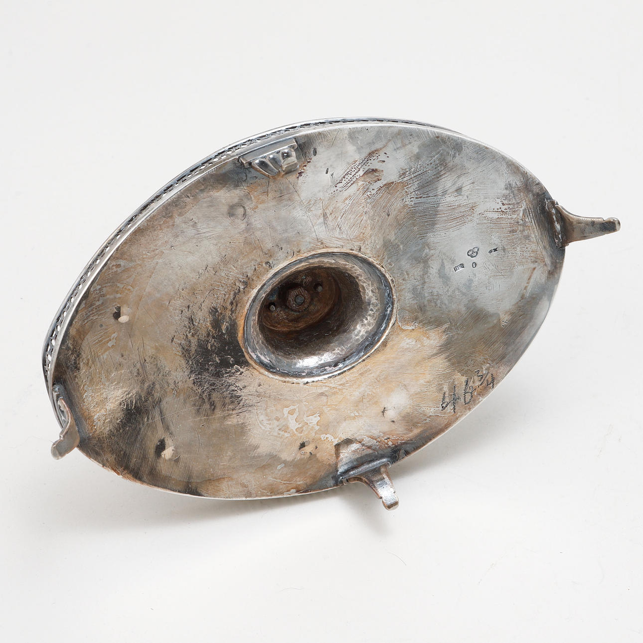Oval shape with openwork sarg. Unclear master stamp. Length approx. 22 cm, width 13 cm, height approx. 25 cm. Weight about 369 grams.