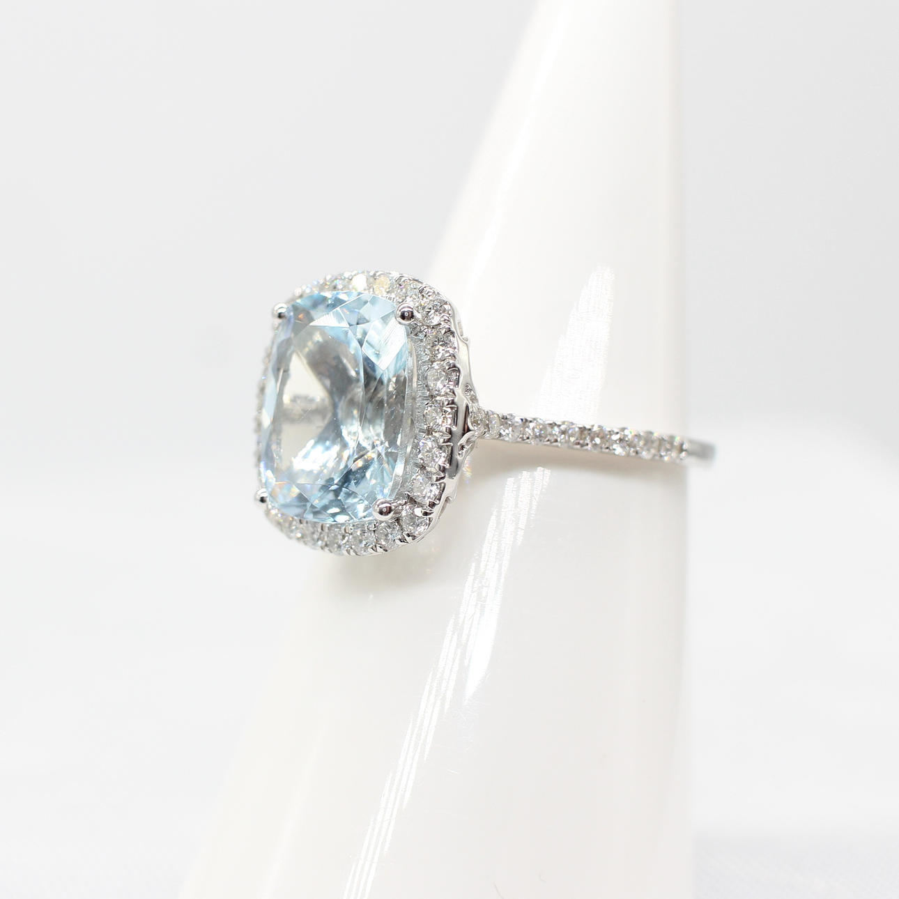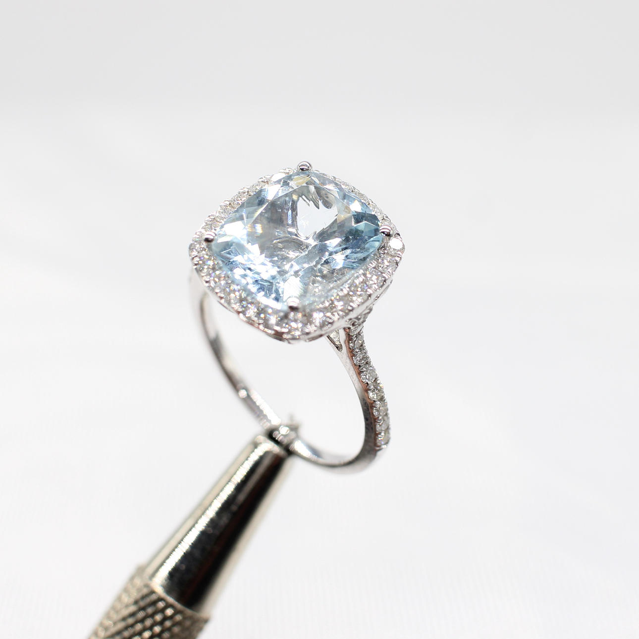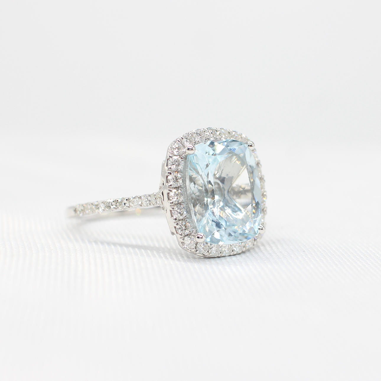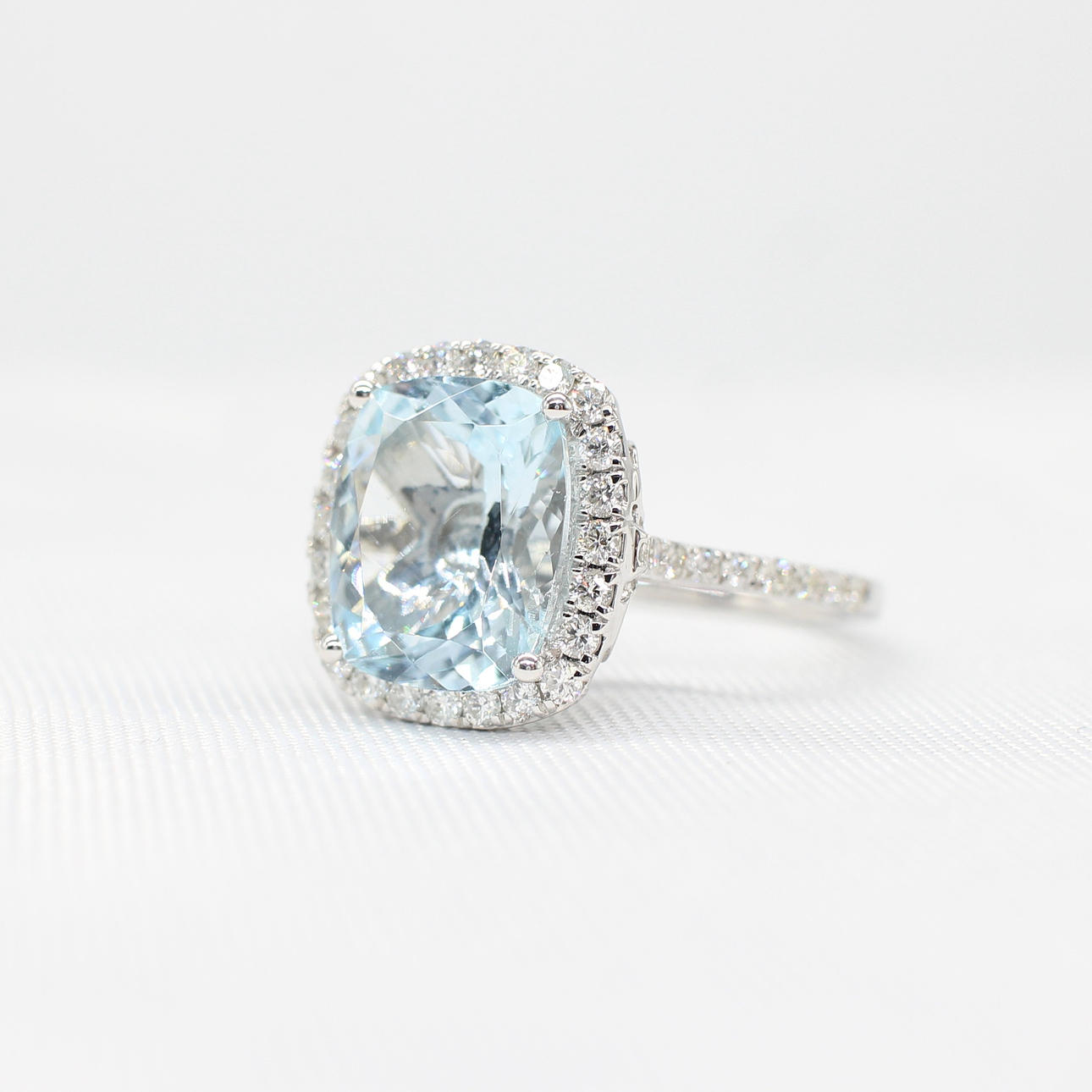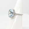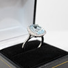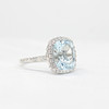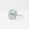 A large cushion cut aquamarine and round brilliant cut diamond cluster ring in 9k white gold (hallmarked).