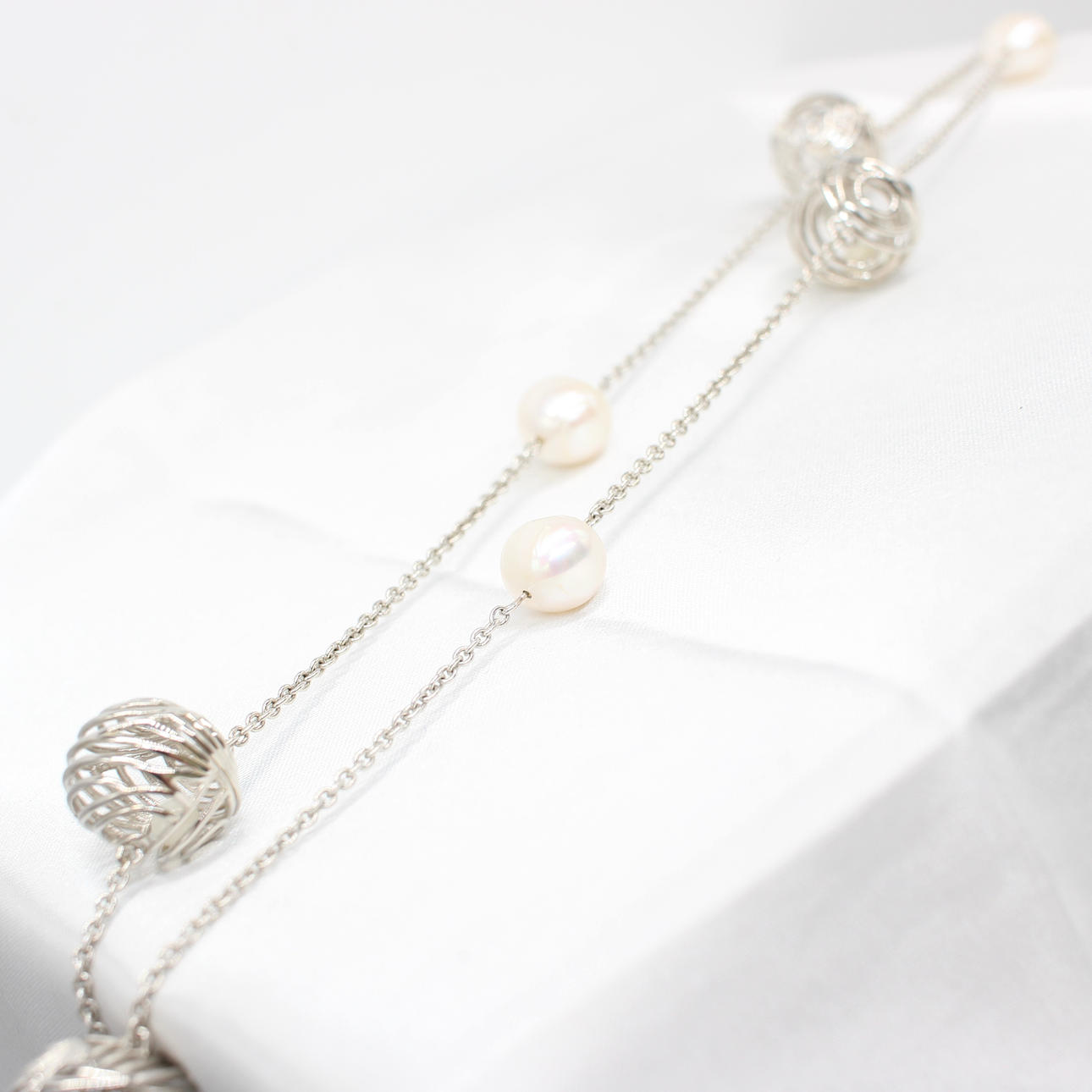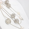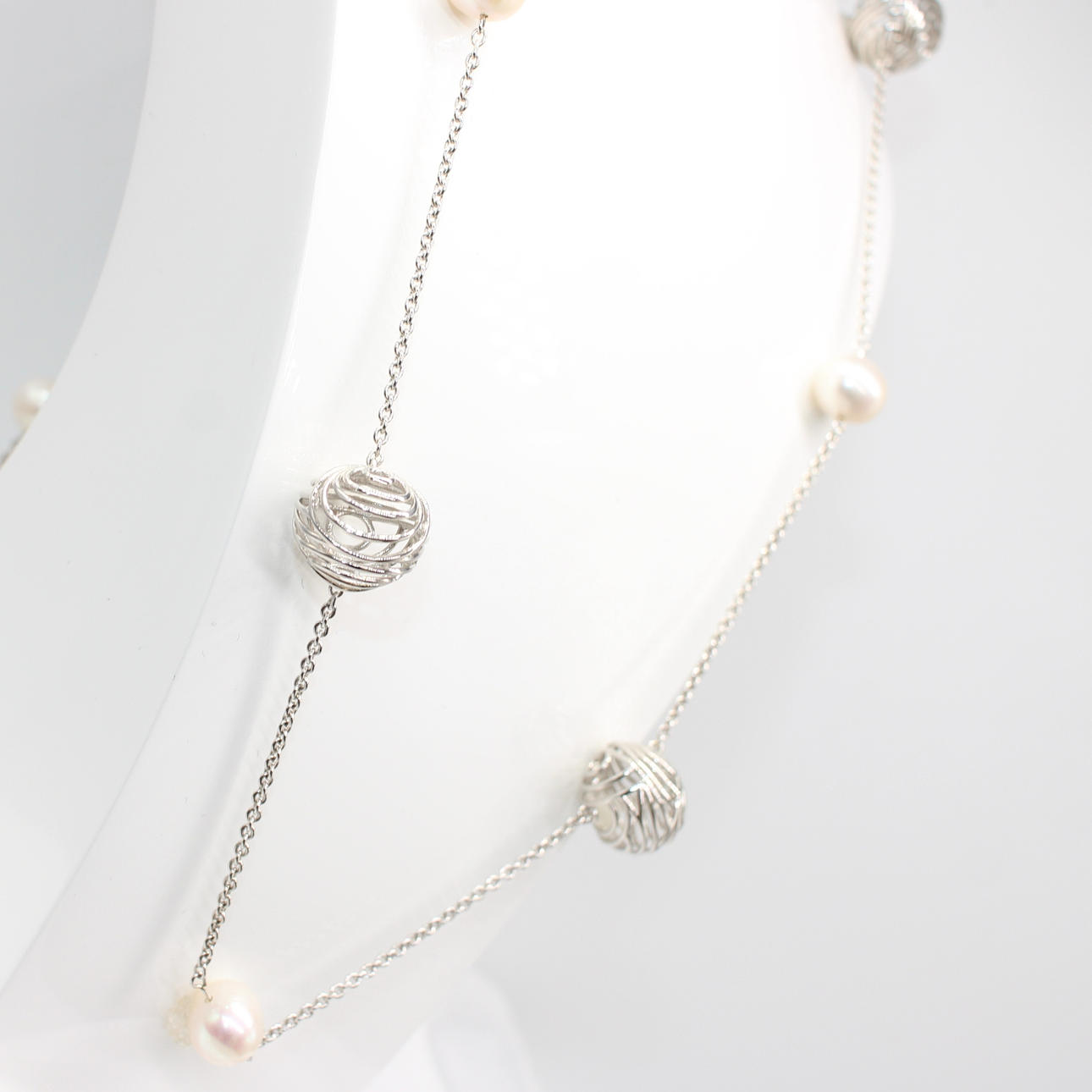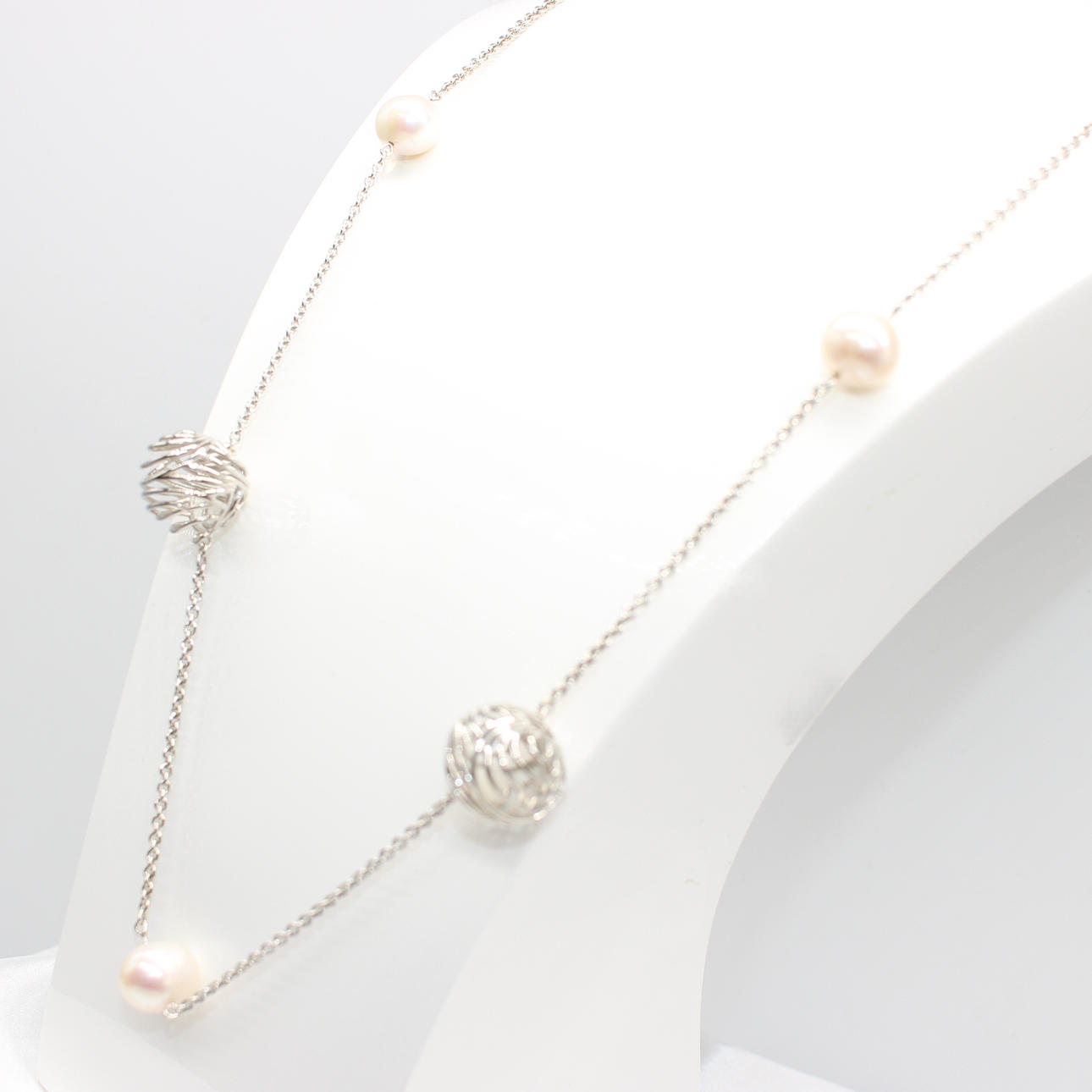 A long silver (925) necklace set with silver balls and cultured pearls.