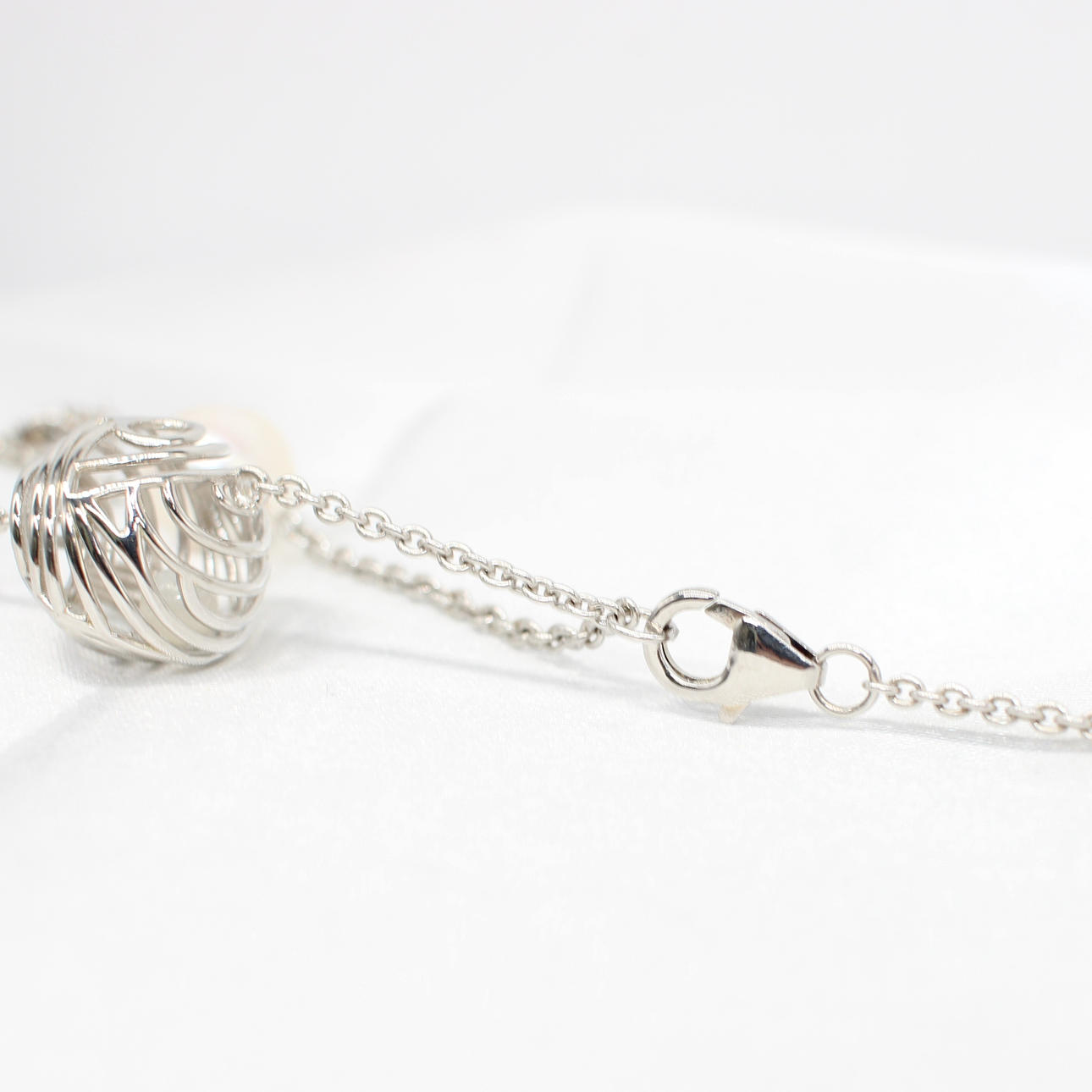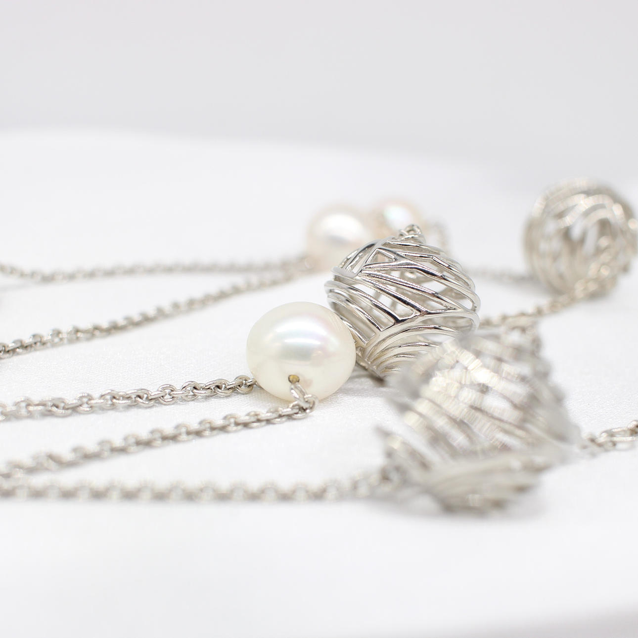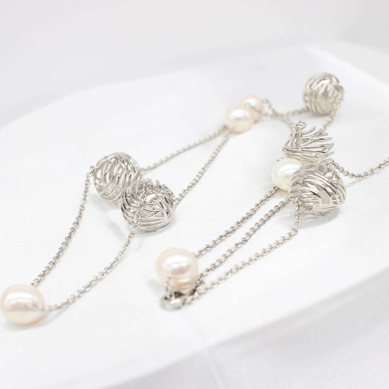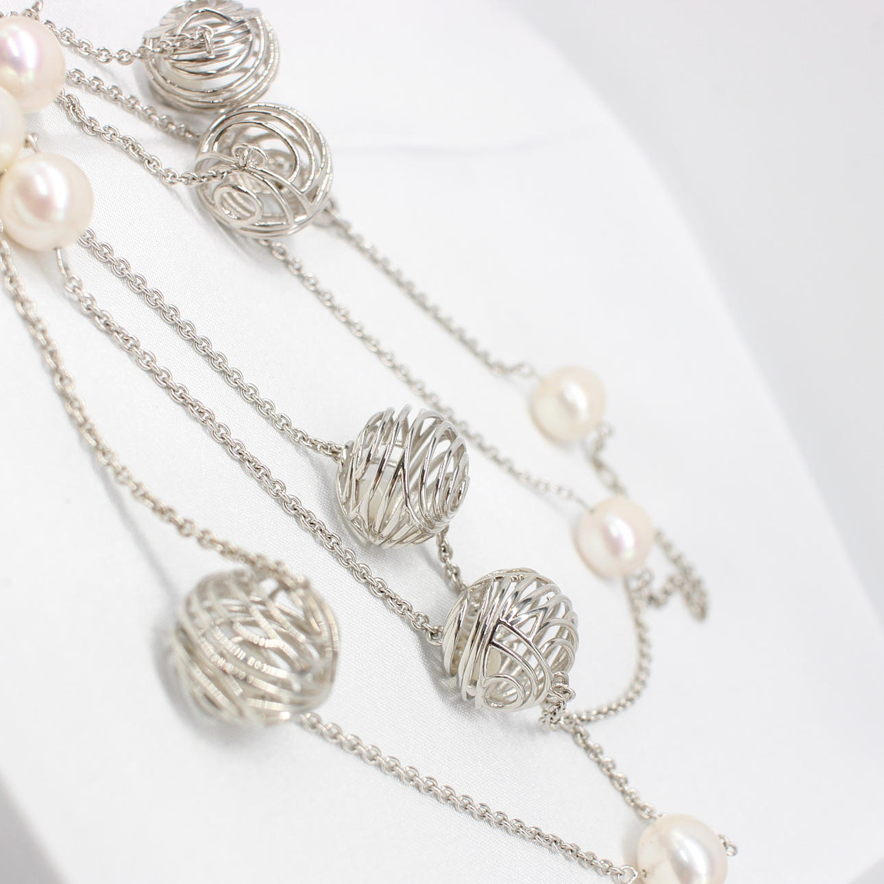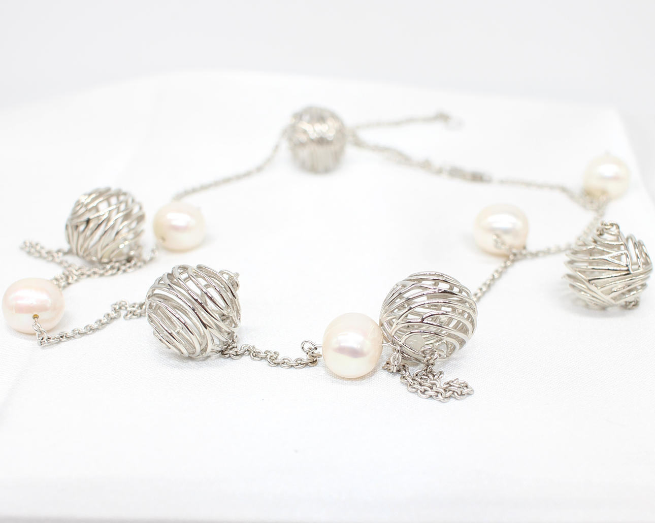 This necklace features 6 x cultured white pearls approximately 10mm each and 5 x silver cage balls with small round polished pearls encapsulated within