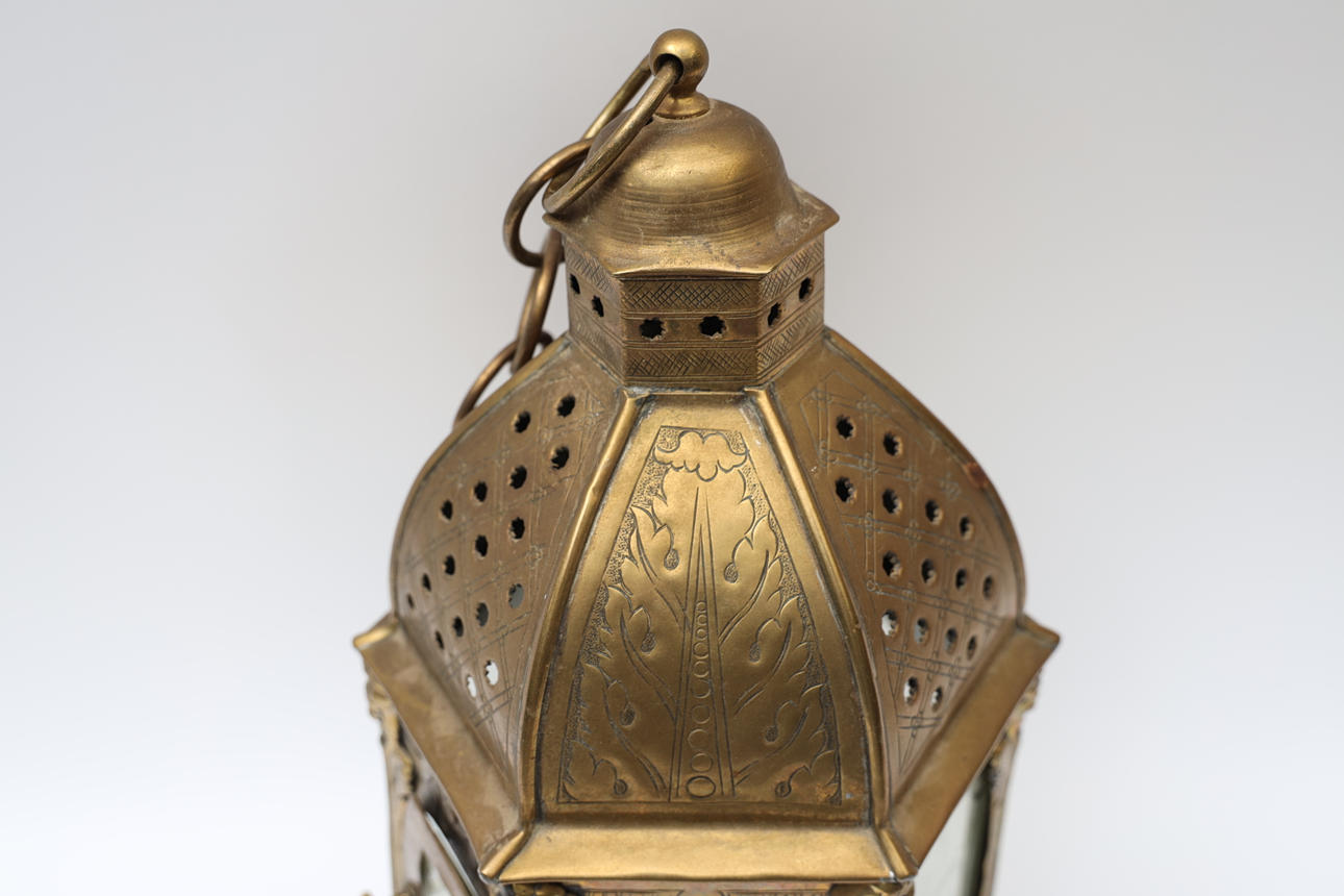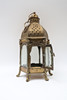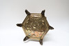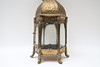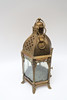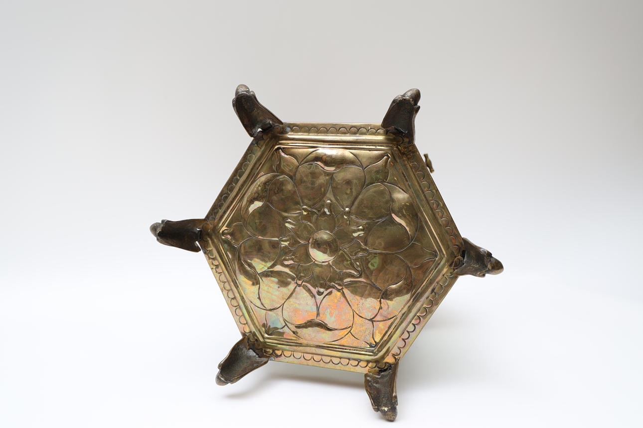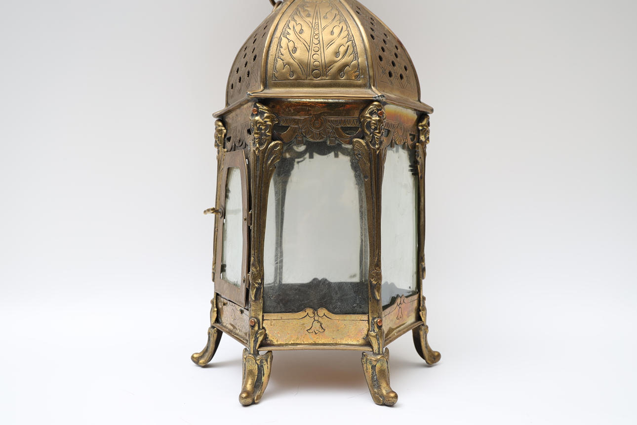 Brass and bronze. Partially openwork and engraved decor. Side pillars in the form of figures. Recessed glass. Underside with engraved decoration of flower.