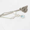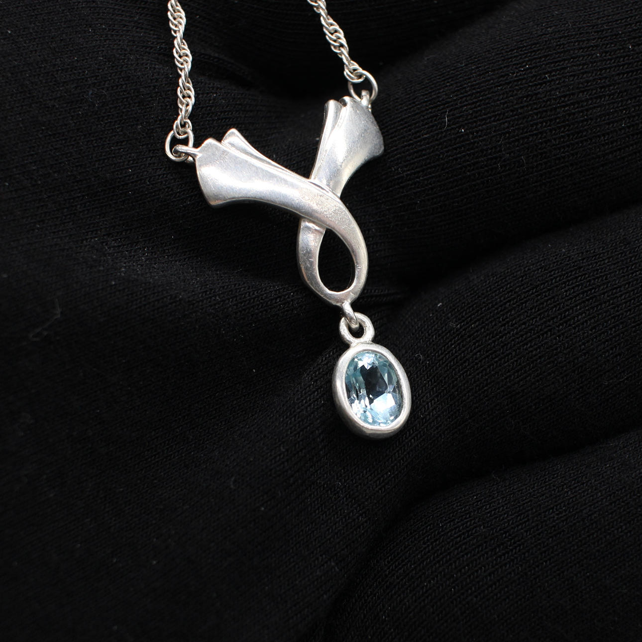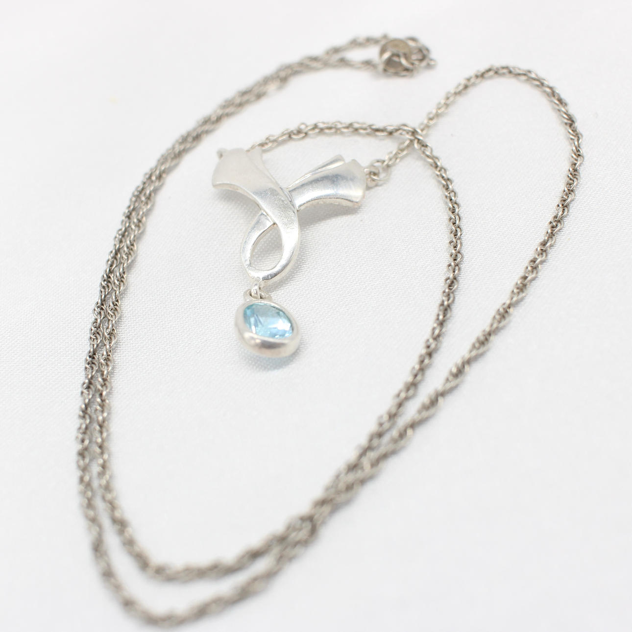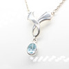 A silver (stamped 925) necklace with blue stone, almost aquamarine colour set as a drop from a bow styled fixed pendant